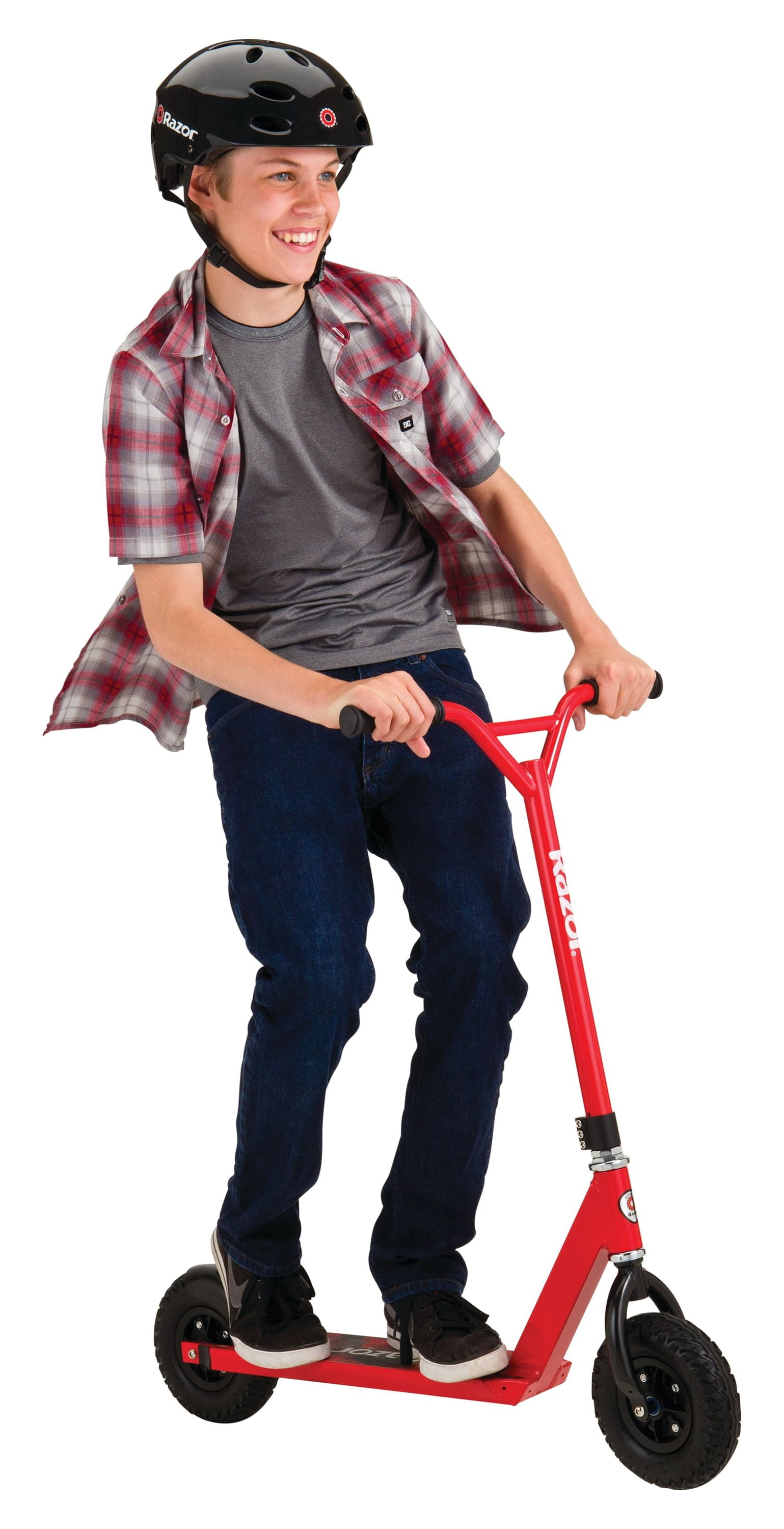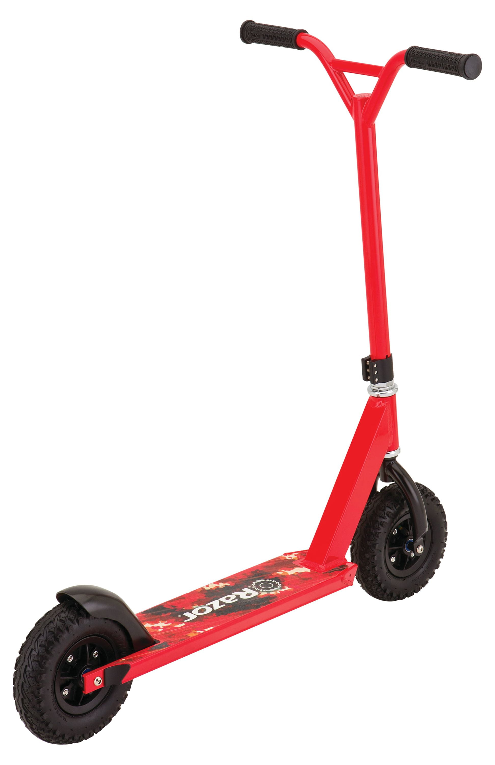 Go off-roading and show off some crazy tricks while riding around in style on the Red Razor Pro Kick Push Heavy-Duty Dirt Scooter. The pro kick scooter features rubber grip handlebars fixed in an ideal Y-style to accommodate the rider. Dominate the dirt and experience a smooth ride while also flipping through the air with the super-tough construction of this lightweight scooter. For an ensured safe ride on this sturdy scooter, the rear-fender brake allows for adjusting speed easily or stopping right in their tracks. Equipped with a triple stack coffin clamp and large pneumatic, molded tires, this scooter will provide extra rigidness and stability to the ride. With a strong, heavy-duty aluminum frame and durable base, your kid will be able to ride around the block or tackle the bumpiest pavements season after season. This portable scooter is easy to assemble and can support users up to 220 pounds. Feel the wind blow and cruise down the neighborhood or through the muck on the Pro Kick Push Dirt Scooter from Razor.