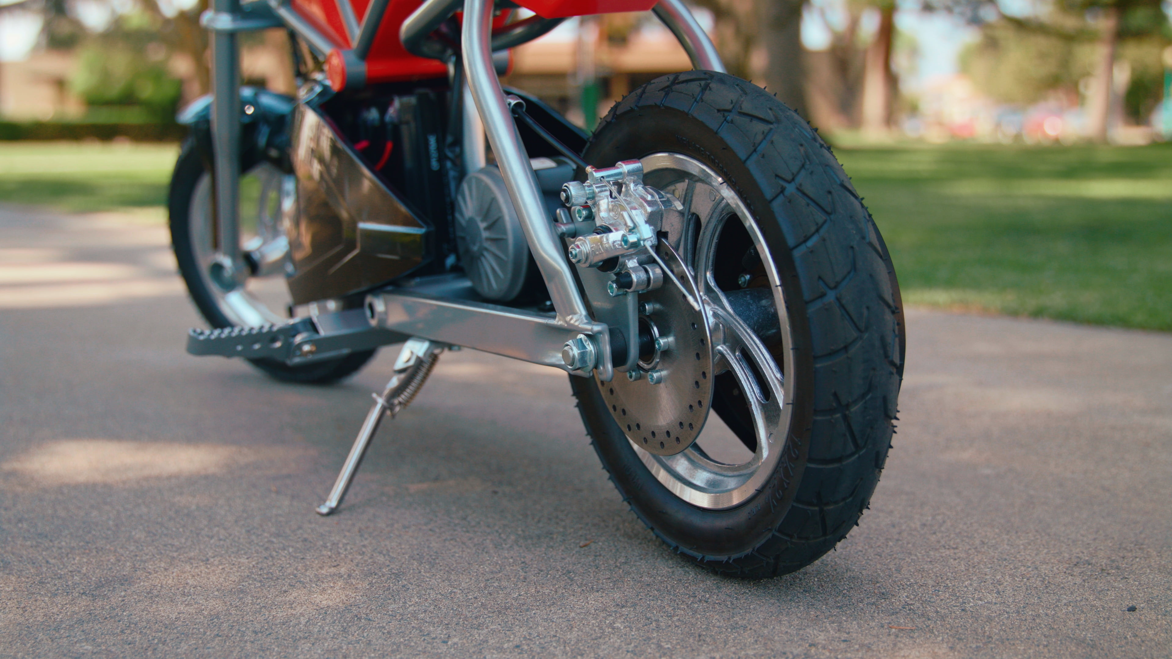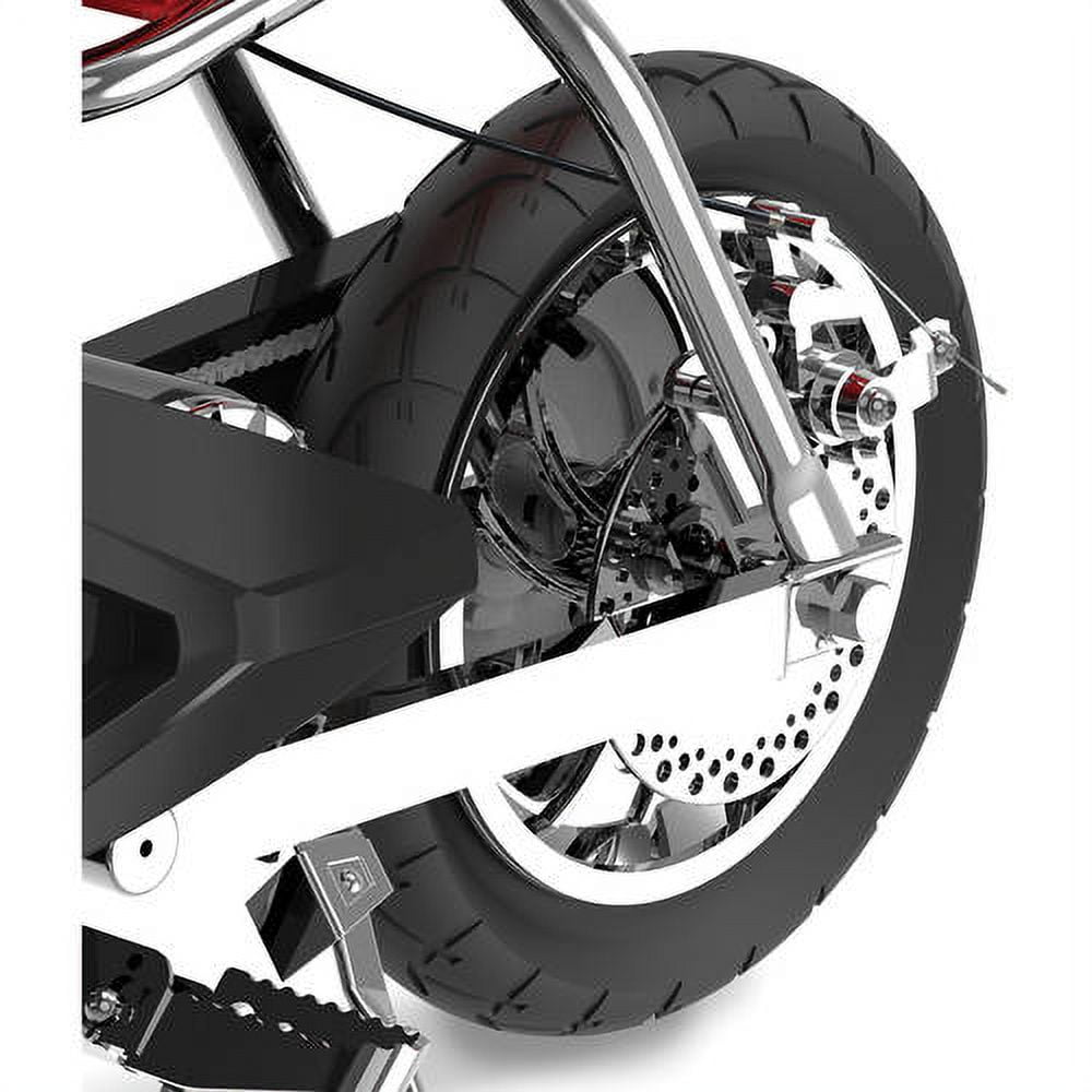 Powered by a twist-grip, variable-speed, throttle, high-torque, chain-driven motor that delivers speeds up to 14 mph (22 km/h). Range: Up to 7 miles on a single charge Features a trellis-frame chassis design with authentic street-bike inspired styling for a bold mix of style and performance. Hand-operated, rear disc brake provides stopping power, combined with pneumatic tires and custom 10” (254 mm), 3-spoke, mag wheels. Additional features include double-crown fork, shatter-resistant fairings, adjustable-angle, riser-style handlebars with soft, rubber grips and a retractable kickstand. Rechargeable 24V (two 12V) sealed lead-acid battery system provides up to 30 minutes of continuous use. Electrical system certified compliant with UL2272 by ACT Lab LLC, an accredited testing lab.