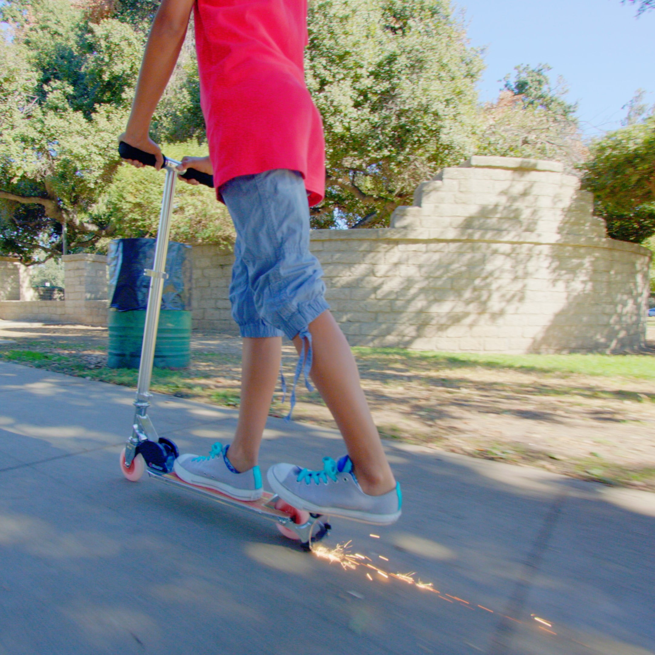 The Spark Ultra features our brightest LED wheels EVER, highlighting the action with their intense white light. Step on the Spark Bar to leave a trail of sparks in your wake. Replacement spark cartridges are sold separately. Easy-folding mechanism with folding handlebars and down tube for easy on-the-go storage and carry. Additional features include our rear-fender brake and an aluminum t-tube and deck. Specifications Spark Bar: Includes replaceable spark cartridge (additional replacement sold separately) T-Tube: Aluminum Handlebars: Adjustable height, folding Grips: Foam Deck: Aluminum with full deck grip tape Wheels: Utra-bright LED, urethane Brake: Rear-fender Age: 8+ Age Group: Child, Tween, Teen Max Rider Weight: 143 lb (65 kg) Gender: Unisex No Assembly Required Product Dimensions: 25.5″ x 11.5″ x 32.75″ (648 mm x 292 mm x 832 mm) Weight: 5.5 lb (2.5 kg)
