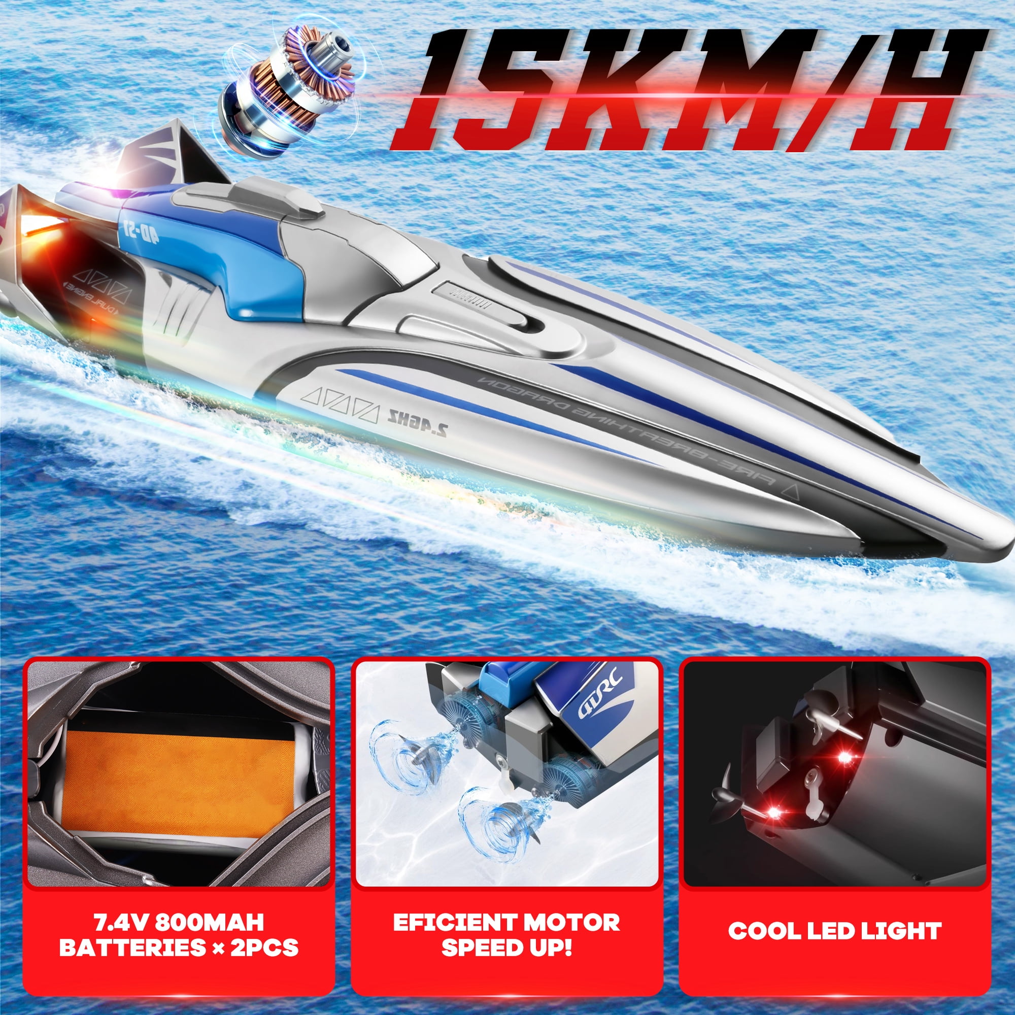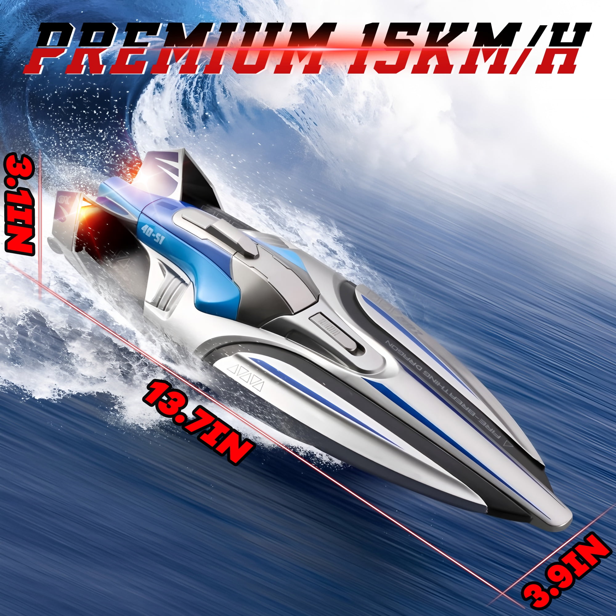 ????Powerful and Thrilling This high-end speed boat is equipped with a powerful motor, reaching speeds of over 30KM/H, giving you the thrill of speed. ????Superb Performance, Fearless of Waves The boat has a one-button flip function, so even in rough waves, it can handle them gracefully. The 180-degree flip recovery function allows this boat to easily handle various water environments such as the ocean, rivers, and pools. ⚡Excellent Endurance Efficient water cooling system ensures safer and longer-lasting use, preventing overheating during extended play. Also comes with 2 1500mAh high-capacity batteries, providing over 40 minutes of playtime on a single charge. ????Battery and Long-Distance Warning This fully waterproof racing boat is made of high-quality materials, able to withstand harsh conditions and extreme racing conditions, ensuring its long-term reliability and durability. Low battery and weak signal alerts ensure that you can enjoy your water journey from start to finish, avoiding getting stranded in the water. ????2.4 GHz and Bright LED Lights LED lights illuminate the boat’s path, adding to the overall aesthetics, especially at night, providing you with beautiful scenery. 2.4GHz allows you to experience an interference-free racing boat experience.