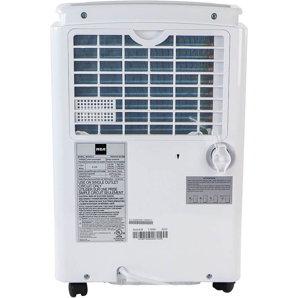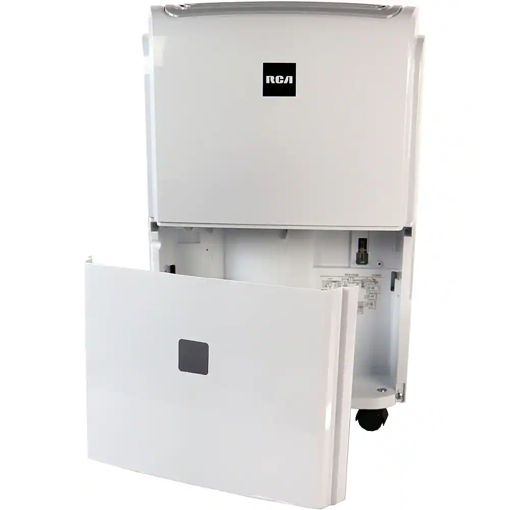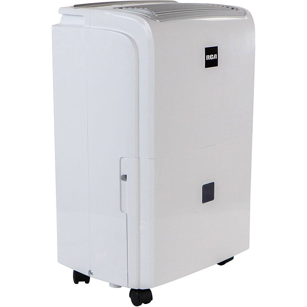 The RCA 50-pint dehumidifier removes up to 50 pints of moisture from the air per day, working quickly to absorb moisture from any space in your home. Can be placed in various locations throughout your home or apartment, including attics, bathrooms, bedrooms, garages, and more. Convenient and easy to use, the unit is equipped with an adjustable humidistat display and 2 different fan speeds. Includes auto-defrost function, an automatic shutoff, and a clean filter alert. Continuous draining is an option for a hands-free bucket emptying into a low level drain with no hassle. Equipped with durable, rolling casters and integrated side handles for easy movement and carrying, you’ll have no trouble transporting your unit around your home as needed. Covered by a 1-year limited warranty, you’ll have peace of mind dehumidifying your space for many humid days.