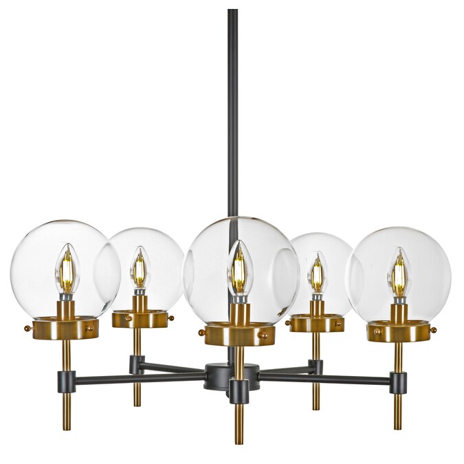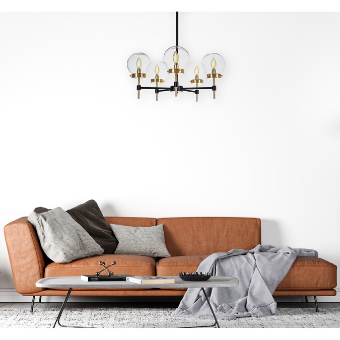 - Mid-century modern 5 light chandelier in black finish with gold accents