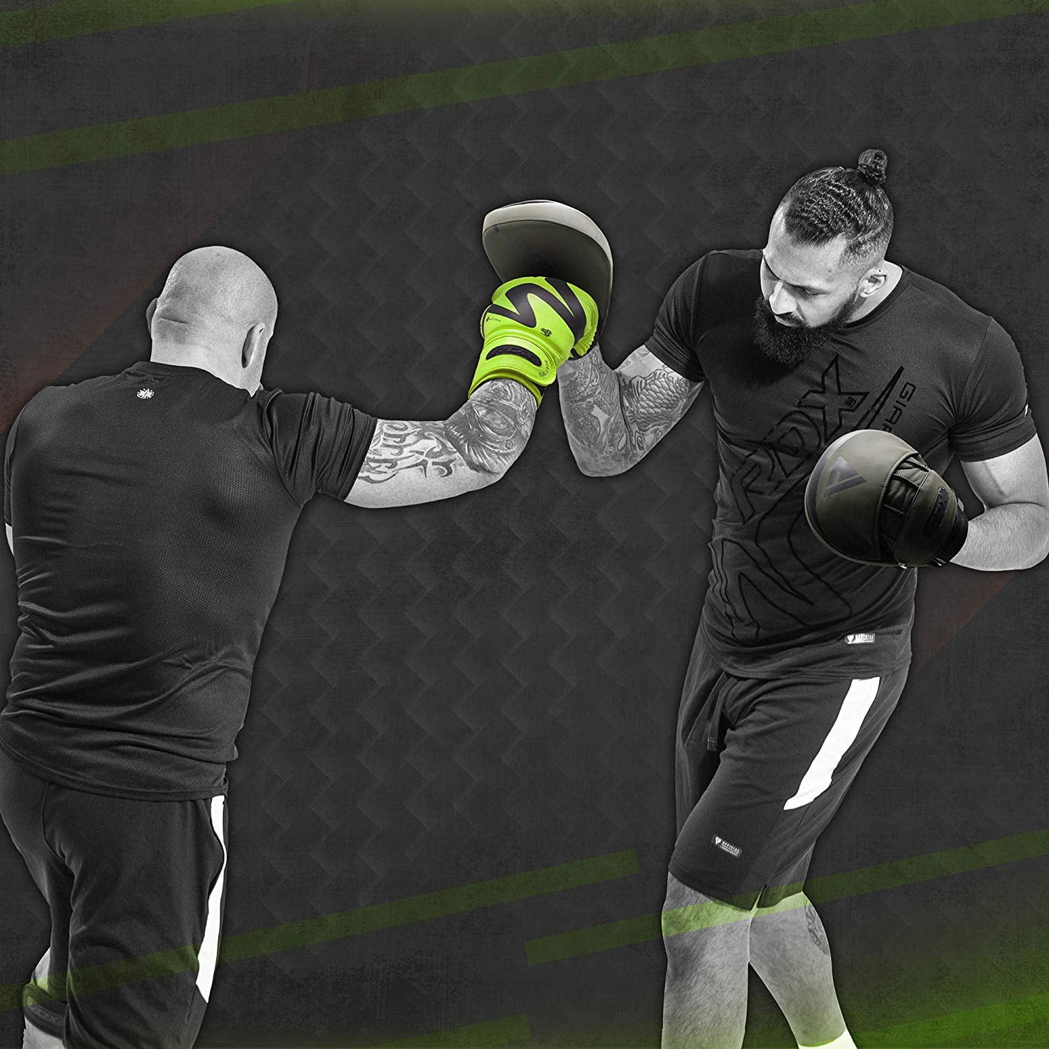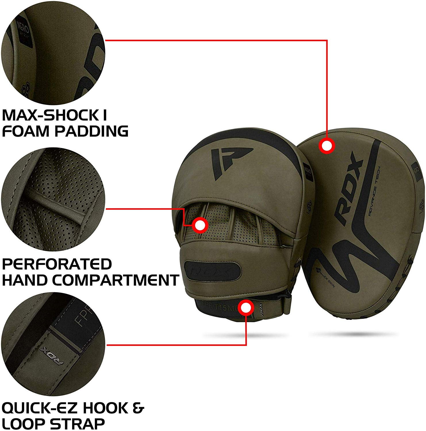 ConvEX Skin Combat Leather ] RDX boxing focus pads are manufactured with ConvEX Skin Combat Leather and nylon stitching for integrated durability. The resilient material resists wear and tear for a prolonged amount of time without losing its original shape. Perfectly assists you in Boxing, Muay Thai, Kick boxing, MMA, BJJ, Karate and more. Max-Shock 1 Foam Padding ] These focus pads are contrived using Max-Shock 1 Foam padding that assists with shock absorbency to protect the coach’s hands and wrists. The brunt of impact is evenly distributed across the surface area. Perforated Hand Compartment ] Our focus mitts are build using tactically placed aeration holes that keeps that hands well-ventilated, sweat-free and clean. It also minimizes bad odor. EZ-Grip Ball for Solid Grip ] Our hook and Jab pads are equipped with EZ-Grip technology that enables a solid grip when worn and zero chance of slipping when struck. The Ball grip offers secure hold when catching nastiest of blows and kicks during Kickboxing, Boxing or karate training sessions Quick-EZ Hook-and-Loop Strap] Quick-EZ hook-and-loop with detachable padding for an easy and convenient fit secures the wrist and offers non-slip grip. Your wrist position stays aligned with your while receiving blows and the chances of slipping and sliding are eliminated.