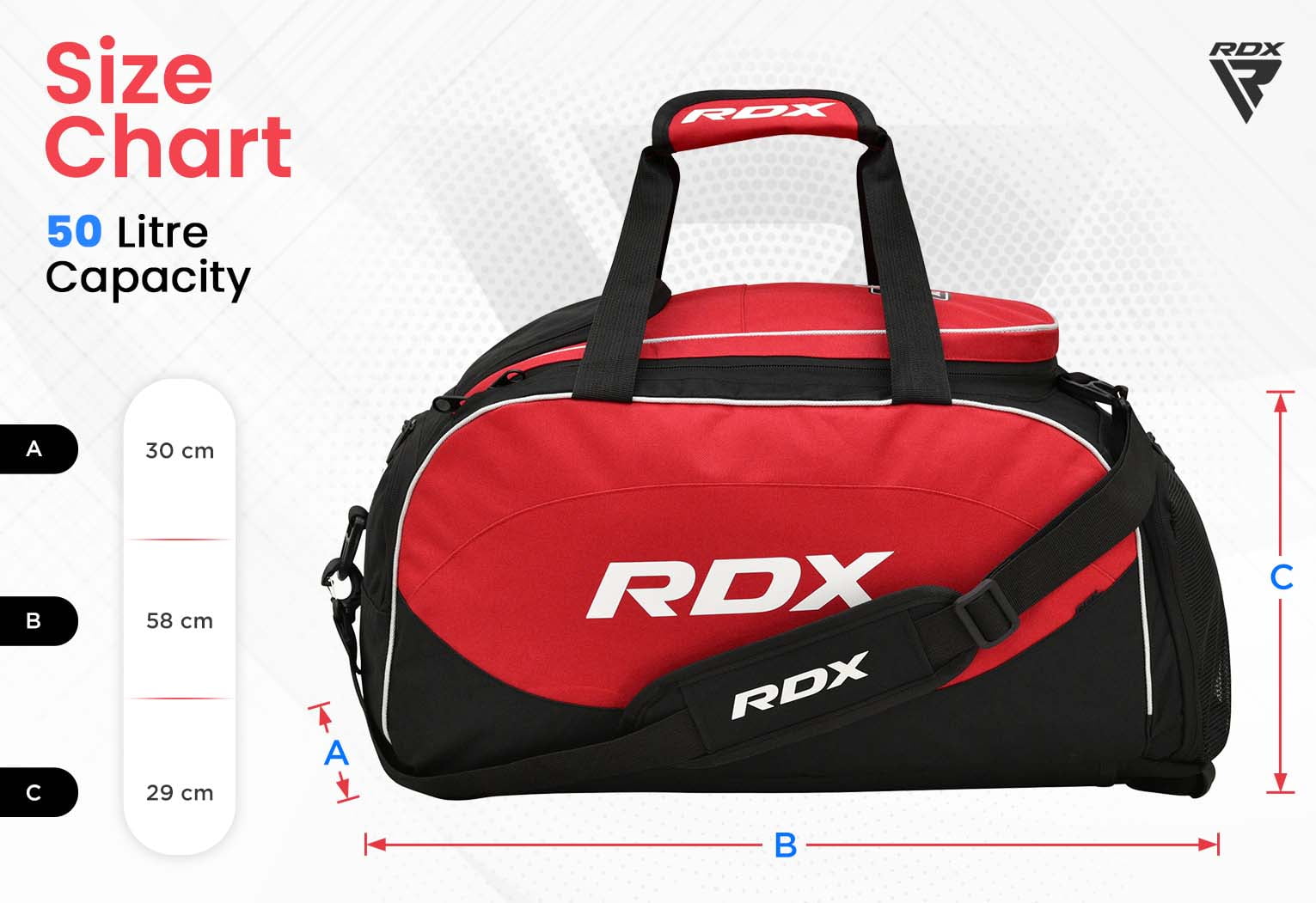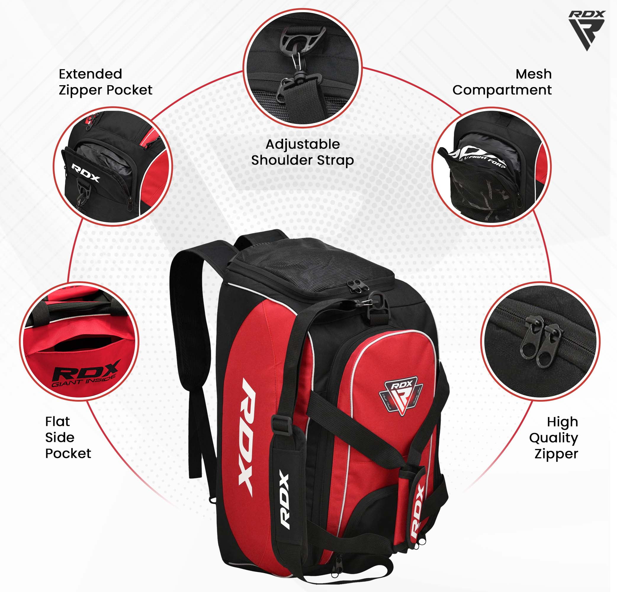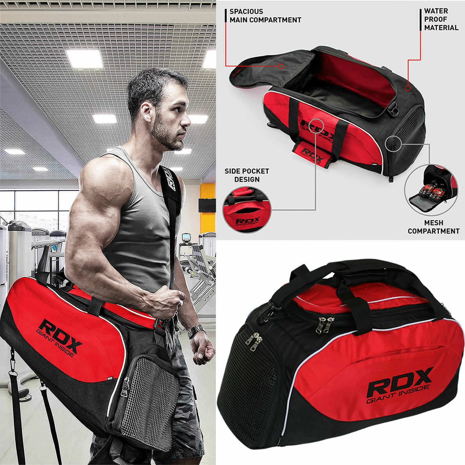 RDX Gym Holdall Gear Bag The RDX Gym Bag was first innovation and remains one of the most highly engineered gym bags in the market. The perfect combination of a sports equipment bag and back pack all in one robust design. Backpack straps can be hidden behind a panel. Double-thick denier rip stop nylon is built to go the distance. A full length zipper U-shape top opening unveils a multitude of storage space for all your equipment and essentials…and more. The shoe compartment is sectioned off and zips from the outside, Two opposite side extended zipper pockets are ideal for easy access items. An additional front and one top zippered pocket help stow everything you require. Two padded back shoulder straps are detachable, fully padded and anatomically correct for utilizing as a back pack.