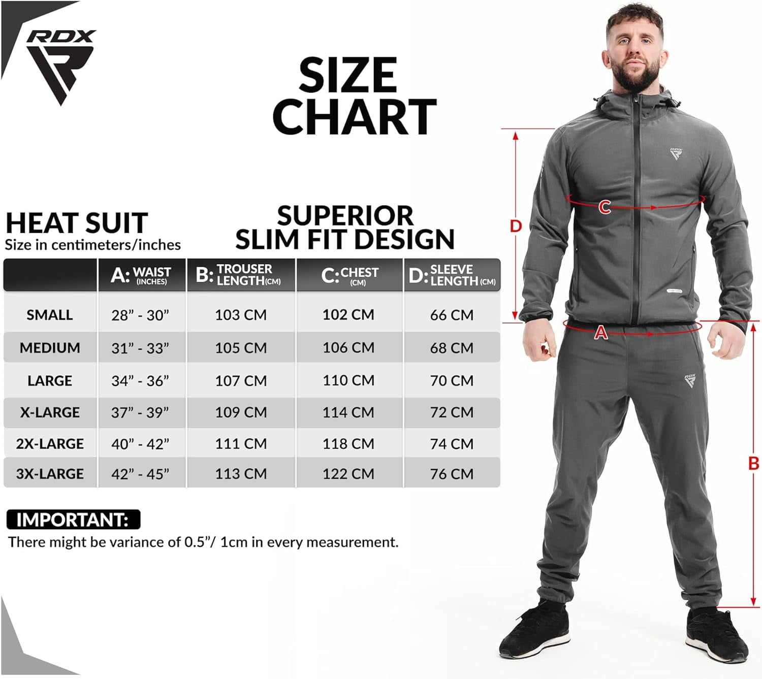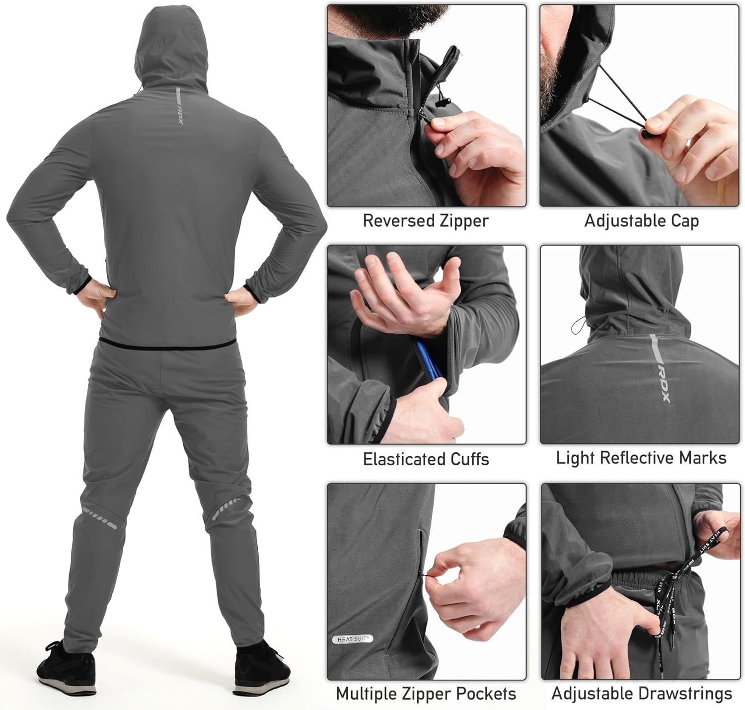 IDEAL FOR HEAT INSULATION – The instant sweat fabric uses a unique combination of nylon and PU, with its golden inner layer, that makes the RDX H2 Sauna Suit hyper-heat-insulating and an ideal weight cutting accessory. ALL-ENCOMPASSING DESIGN- The full-body sweat suit has an attached cap with adjustable strings and a jacket with a zipper to maximize heat entrapment for weight loss. The lightweight heat suit uses a stretchable fabric and has zipper pockets, which make it ideal for use in MMA, Boxing, Muay Thai, and other similar training. UNHINDERED MOBILITY – The stretchable fabric, elasticated openings, and Advance DS Seam stitching combine to make the sauna suit highly durable and easy to use while generating maximum results along with providing an ease of movement. BETTER HEAT REGULATION – The drawstring and zipper help adjust and regulate the levels of heat in the heavy-duty sauna suit while working out in the gym, or training in any of the combat sports ranging from Boxing, and Muay Thai, to BJJ, Krav Maga, and MMA. MULTI-ENVIRONMENT UTILITY – The luminous logo and weatherproof properties combine to make the heat suit ideal for day and night excursions outdoor for workouts just as well as it works indoors for slimming and effective sweating. The REACH-compliant material of the sauna suit makes it optimal for long-term use and extended hours of weight-cutting workouts.
