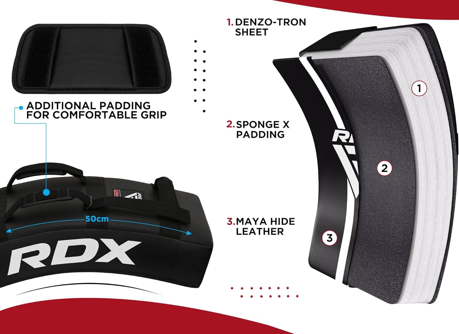 Features Mays hide Leather to withstand the toughest assaults, Air vents on both sides 60cm long, 36cm wide and 13cm thick ‘IMT’ Gel Padding, Extremely lightweight Nylon reinforced 3 suitcase handle bars with additional nylon strap holds for arm. incorporated the latest technology in strike Shield Sold individually Features Mays hide Leather to withstand the toughest assaults, Air vents on both sides 60cm long, 36cm wide and 13cm thick ‘IMT’ Gel Padding, Extremely lightweight Nylon reinforced 3 suitcase handle bars with additional nylon strap holds for arm. incorporated the latest technology in strike Shield Maya hide leather kick shield Ideal for MMA, Karate and Muay Thai Padded strike shield 3 nylon straps for holding User attentive kicking shields Combination of black, red and white colours Curved design favours kickboxing Maya hide leather- high grade Maya hide leather clamps down on practicing MMA, Karate, Muay Thai and Bjj Padded protection- Padding assists in shock absorption so you can use these thai strike kick shields to full effect Rear handles- allow the shield to be held in different and more creative ways for both comfort and usability Kicking Shield- A versatile gear allowing you to up your kicking game while minimizing trainer fatigue MMA kicking pad- has the perfect shock absorption and dispersal surface area for a safer training session.