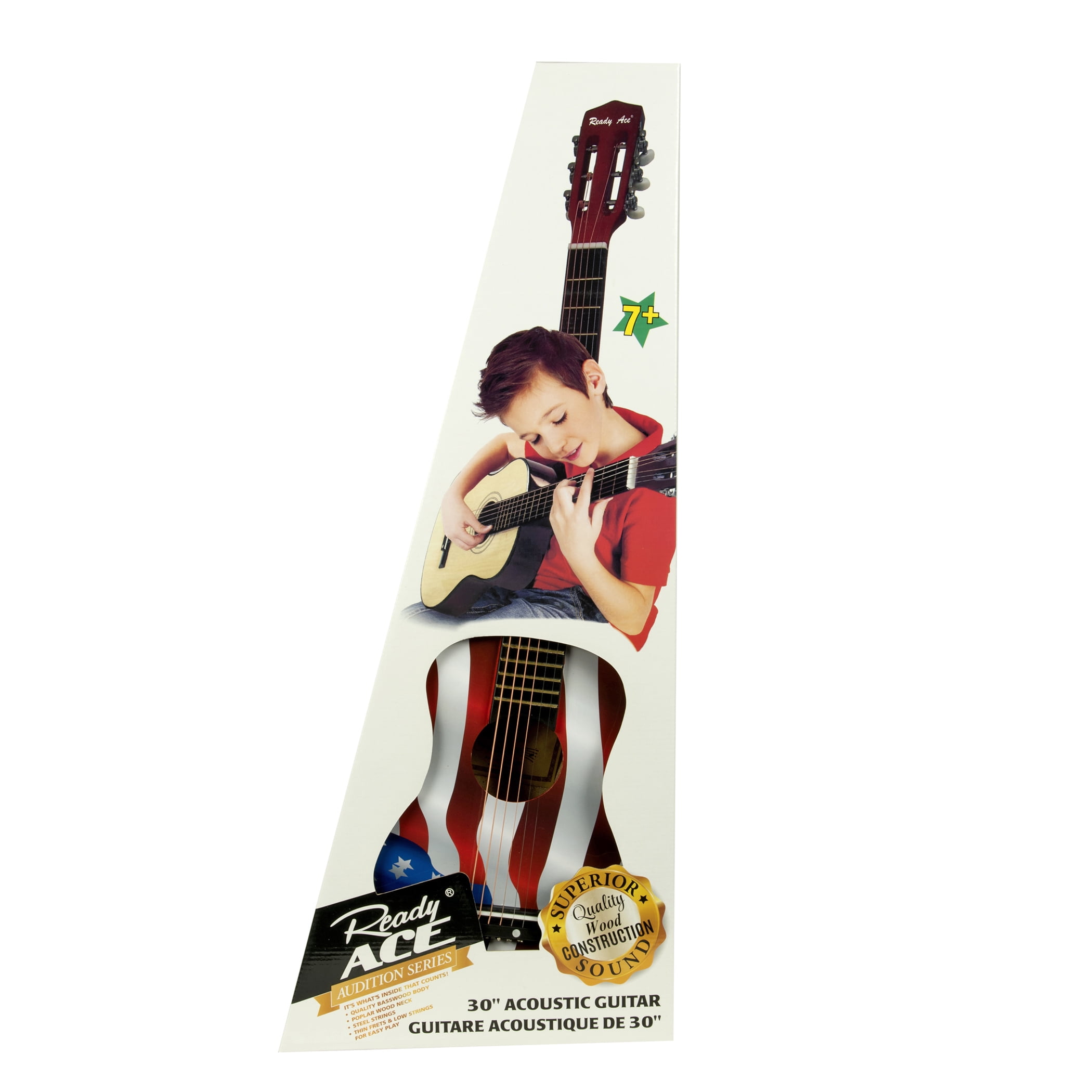 Ready Ace 30″Acoustic Guitar Flag Natural hardwood top Age range: 7 years and up Perfect Unisex Gift Thin frets and lower strings for easy play Strap button Real steel strings