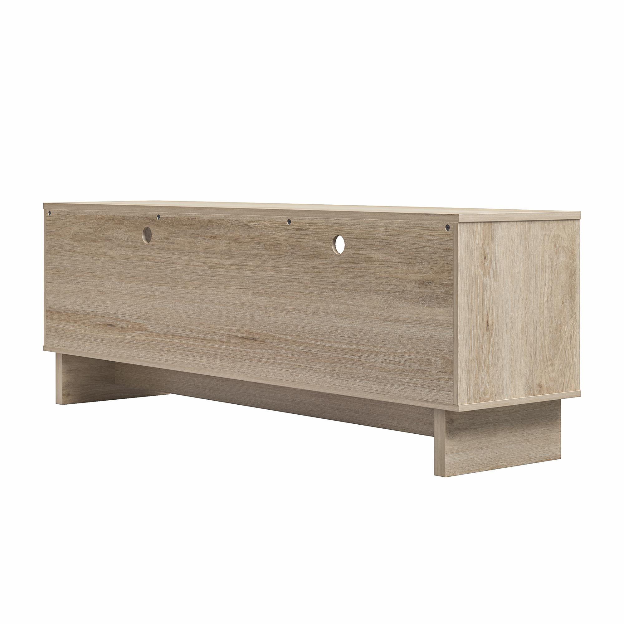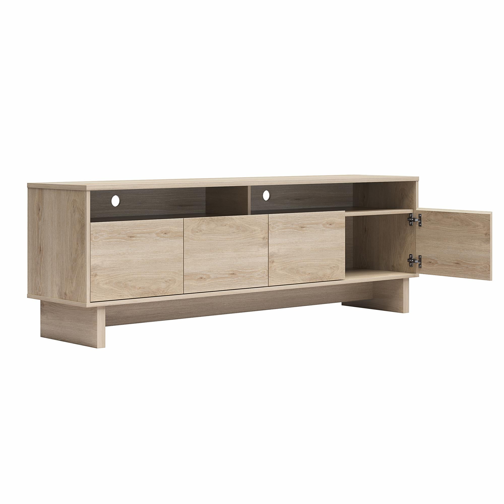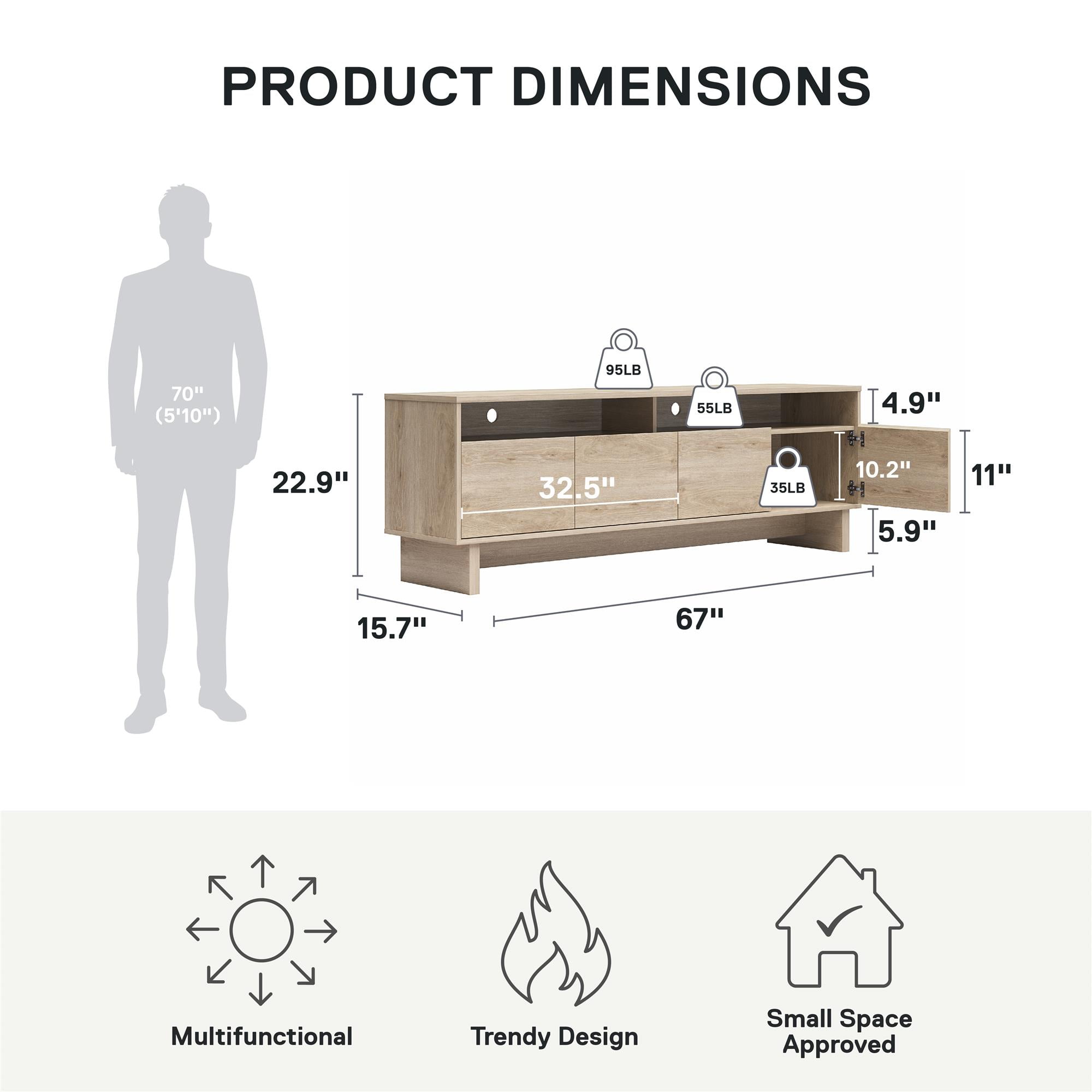 MODERN, MINIMALIST DESIGN: Long, low-profile TV console for TVs up to 75″ with clean lines, constructed from engineered wood, ideal for living rooms, family rooms, or spacious bedrooms FUNCTIONAL STORAGE: Featuring four doors with handle-less fronts and durable European hinges, two concealed shelves for media components, wire management pass-throughs, and an open shelf for a sound bar, keeping everything organized and out of sight SLEEK APPEARANCE: Neutral wood grain texture and recessed legs create a floating effect, enhancing the unit’s streamlined look PRODUCT DETAILS: Ships in one flat box and requires assembly by two adults; Assembled dimensions: 67″ W x 15.75″ D x 22.9″ H; Weight: 108.37 lbs.; Max weight capacities: Top: 95 lbs.; Soundbar shelf: 55 lbs.; Concealed shelves (x2): 35 lbs. each 1-YEAR LIMITED WARRANTY INCLUDED: Contact live agents in the U.S. and Canada for help with replacement parts, assembly assistance, or warranty inquiries via online chat, email, or phone