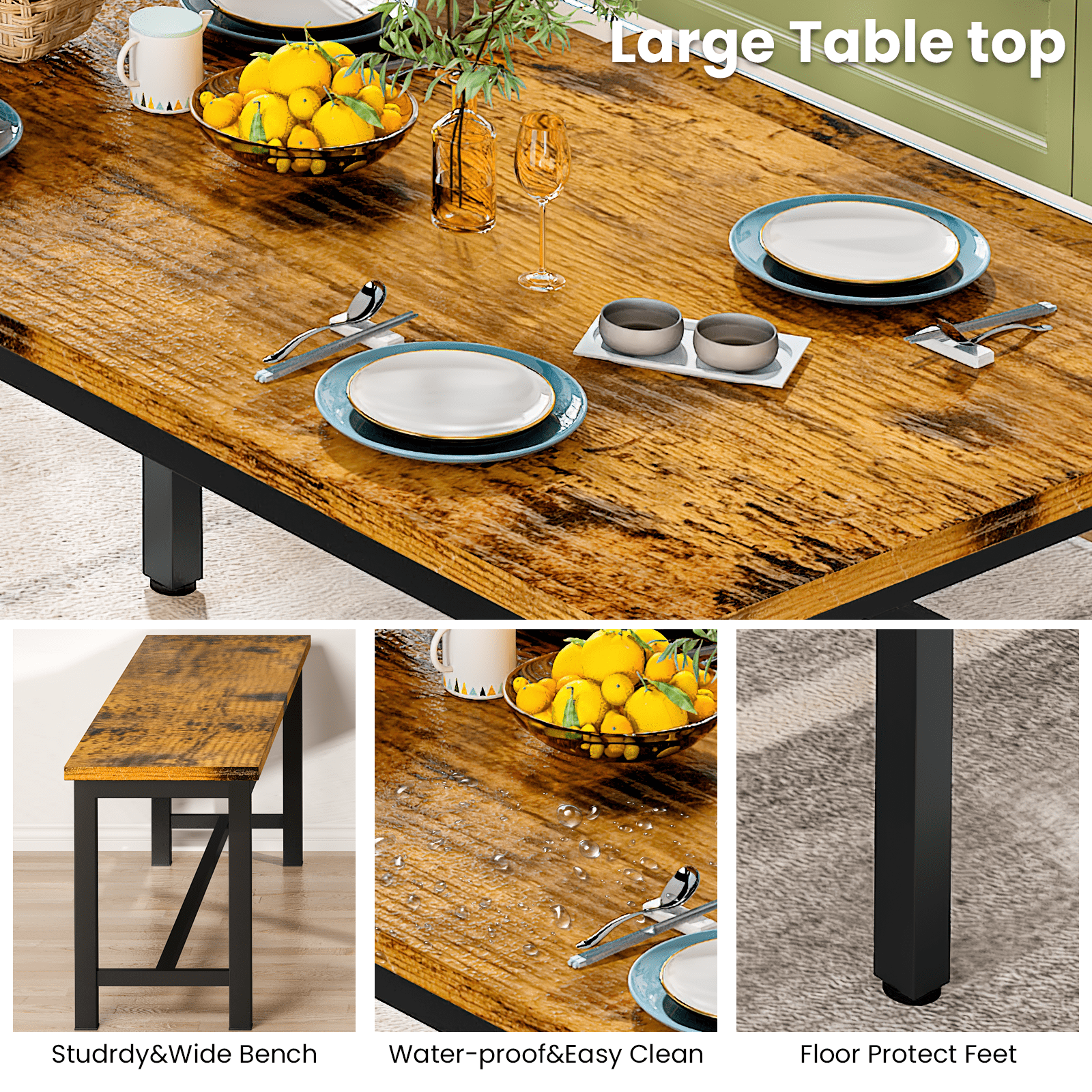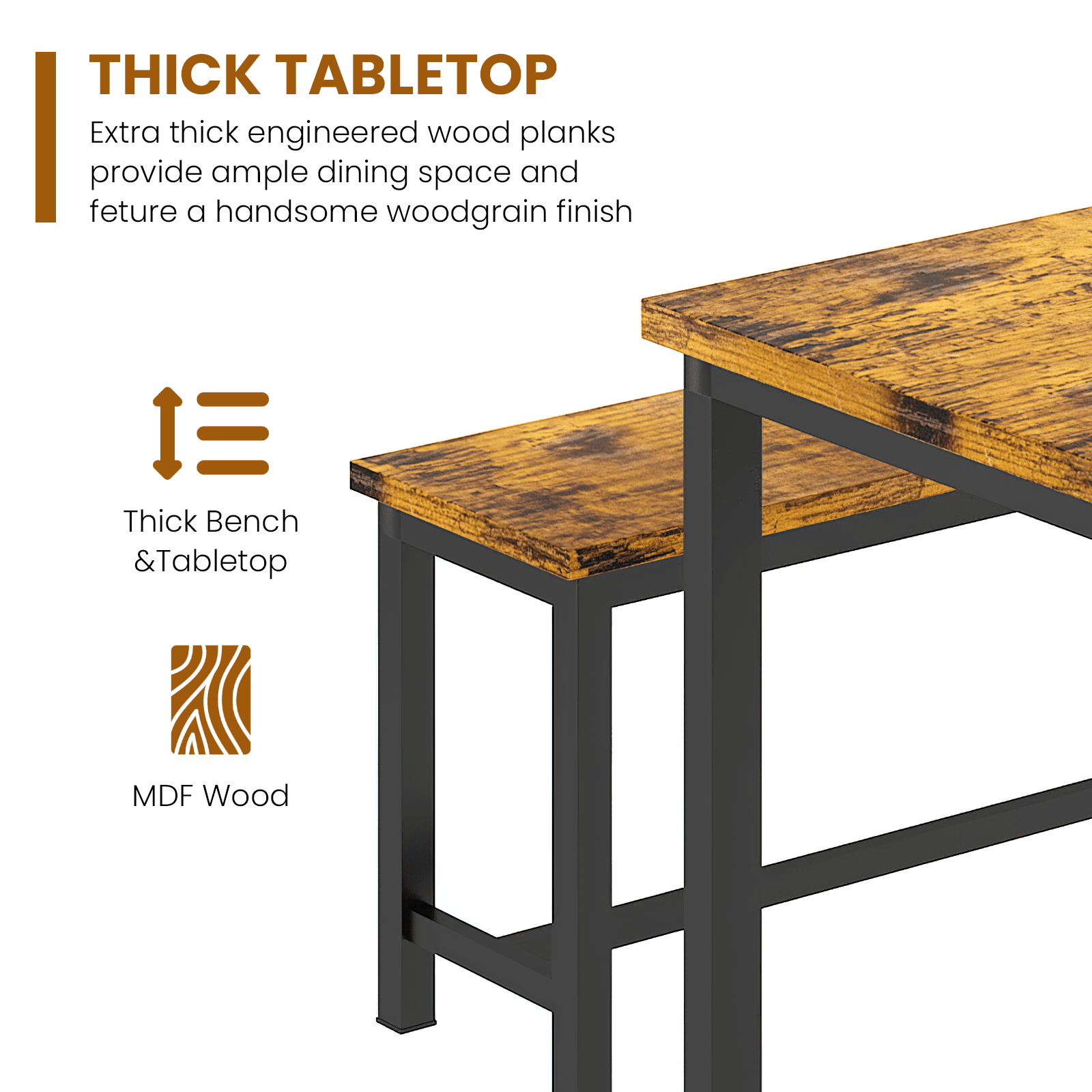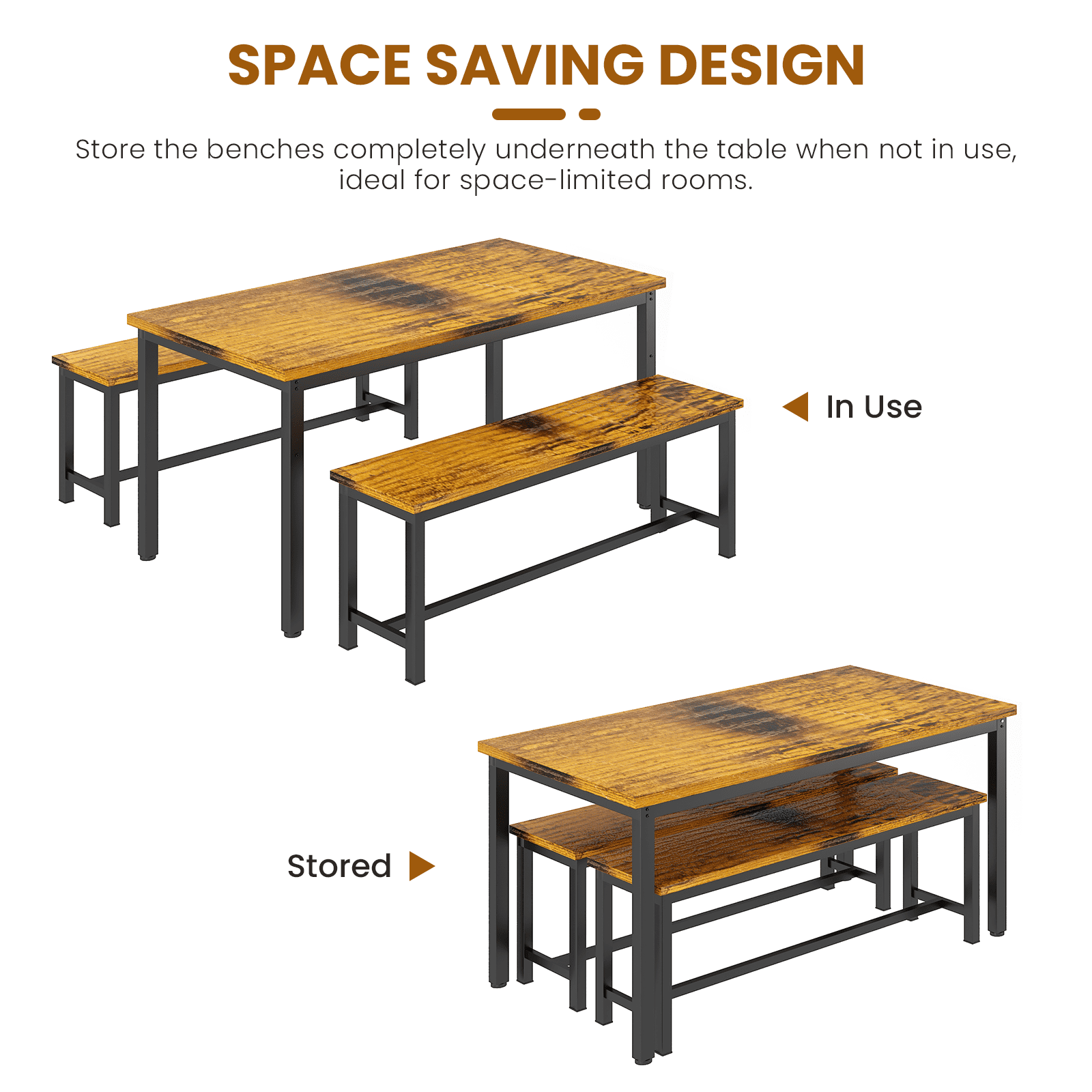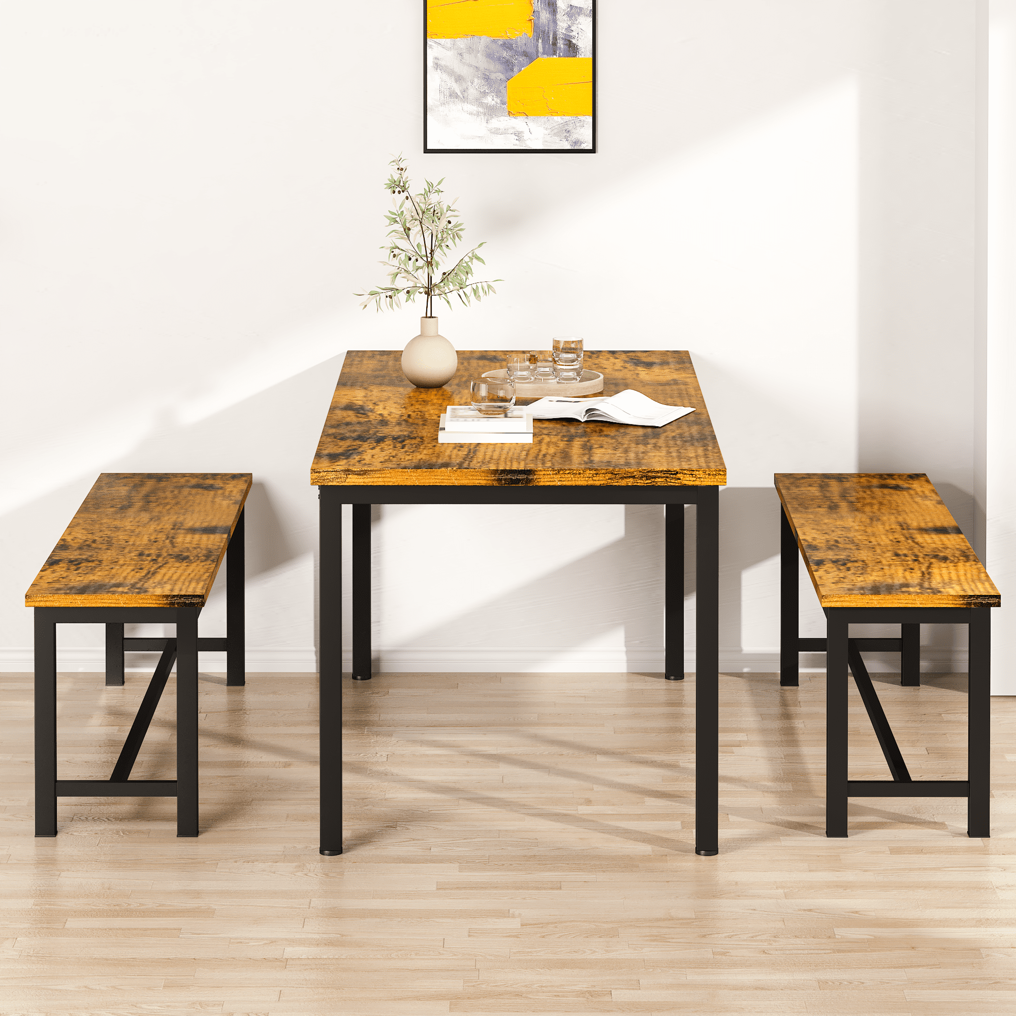 3-Piece Space-Saving Design: Includes 1 rectangular dining table and 2 benches that can be neatly tucked underneath, making it perfect for small spaces and apartments. Seats Up to 4 People: Spacious tabletop and dual bench seating comfortably accommodate 4 people — ideal for family meals or casual gatherings. Durable & Easy-to-Clean Materials: Made of waterproof, scratch-resistant engineered wood and supported by powder-coated steel legs for lasting durability and easy maintenance. Versatile for Any Room: Works great as a dining table, writing desk, or breakfast nook in your kitchen, dining area, or even a cozy coffee shop setup.Quick & Easy Assembly: All tools and clear instructions included — set up your new table in no time and enjoy hassle-free dining right away. Versatile for Any Room: Works great as a dining table, writing desk, or breakfast nook in your kitchen, dining area, or even a cozy coffee shop setup. Quick & Easy Assembly: All tools and clear instructions included — set up your new table in no time and enjoy hassle-free dining right away.