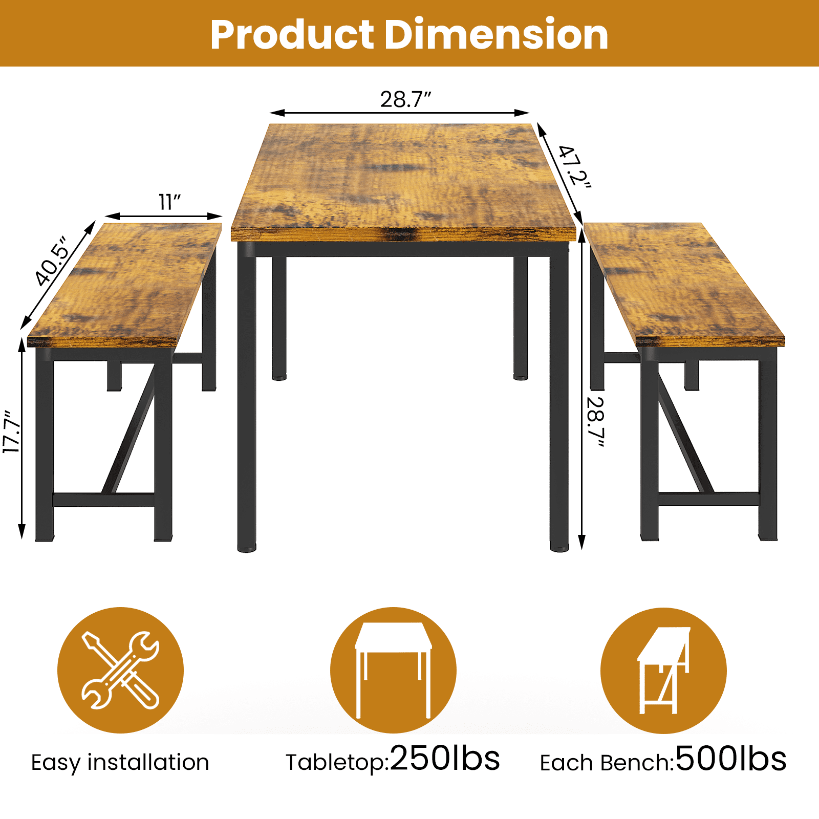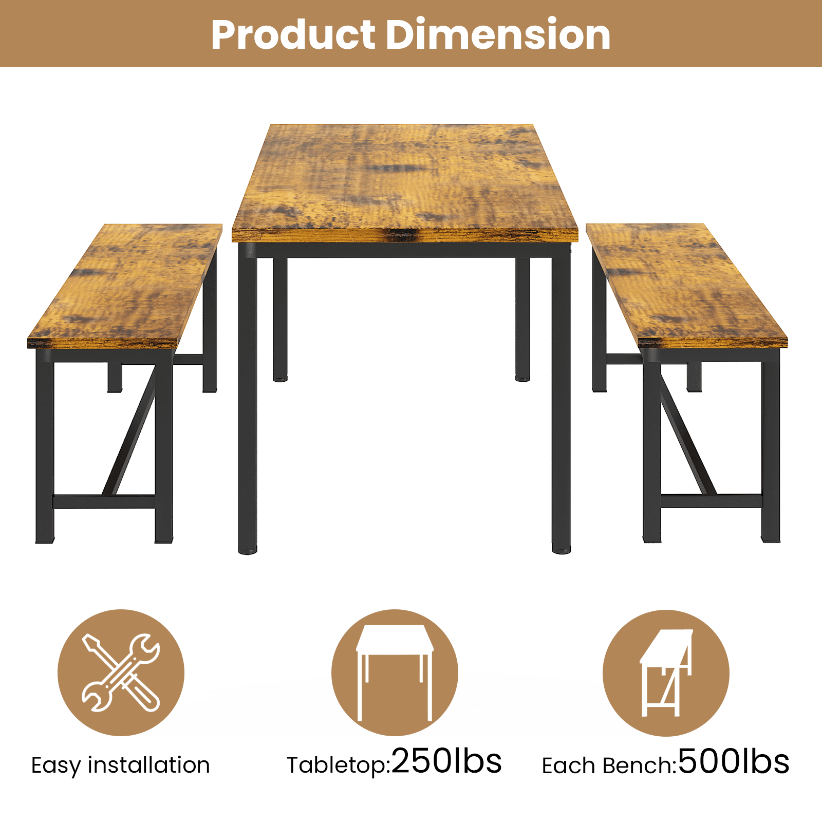 Recaceik 28.7 Inches Height 3 Pieces Farmhouse Kitchen Table Set with Two Benches, Distressed Brown Save valuable space while still being able to comfortably sit down and enjoy a meal with friends and family using our Standard Height Dining Table With Benches Set, crafted with smaller spaces in mind. The dining room table set combines contemporary and farmhouse styles, crafted with premium quality heavy-duty iron framing and a thick MDF board. This 3 pieces dining set comes complete with one rectangular table and two matching benches, that can fit 4-6 people comfortably. Specification: Material: Metal frame and MDF board Table Package Dimensions: 48.82″ L x 31.5″ W x 2.95″ H Table Size: 47.2″ L x 28.7″ W x 28.7″ H Bench Size: 41.3″ L x 11.8″W x17.7″ H Package Weight:65.26 lbs Set Includes:1 x Table;2 x Bench Bench Weight Capacity: 220 pounds