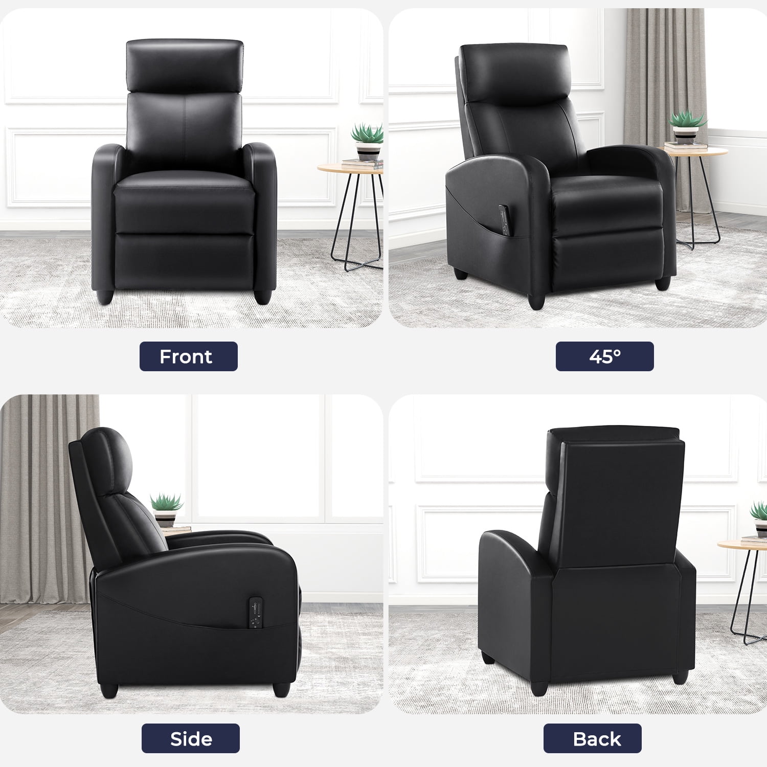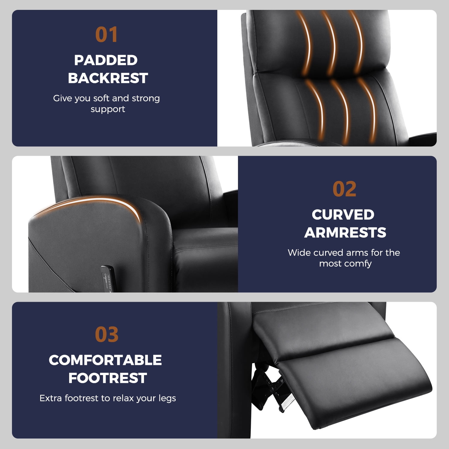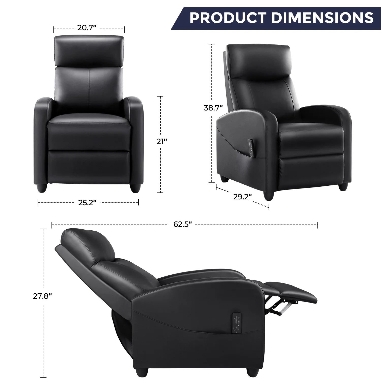 - [SOFT PADDING CUSHION] This upholstered push-back theater recliner features a padded seat, and extra thick foam for ultimate body support and comfort. The large seat cushion and curved armrests are all designed to give you the most comfortable experience.