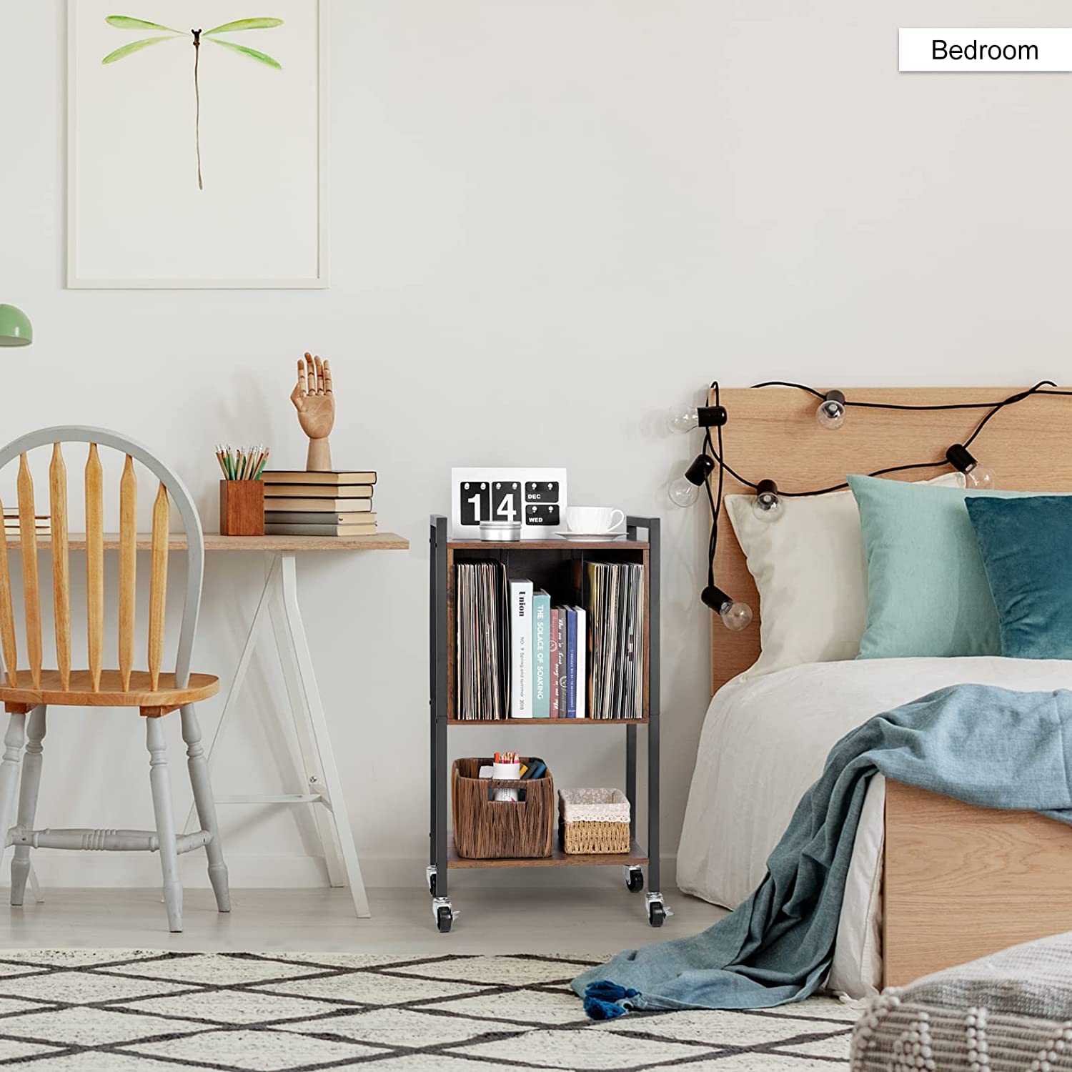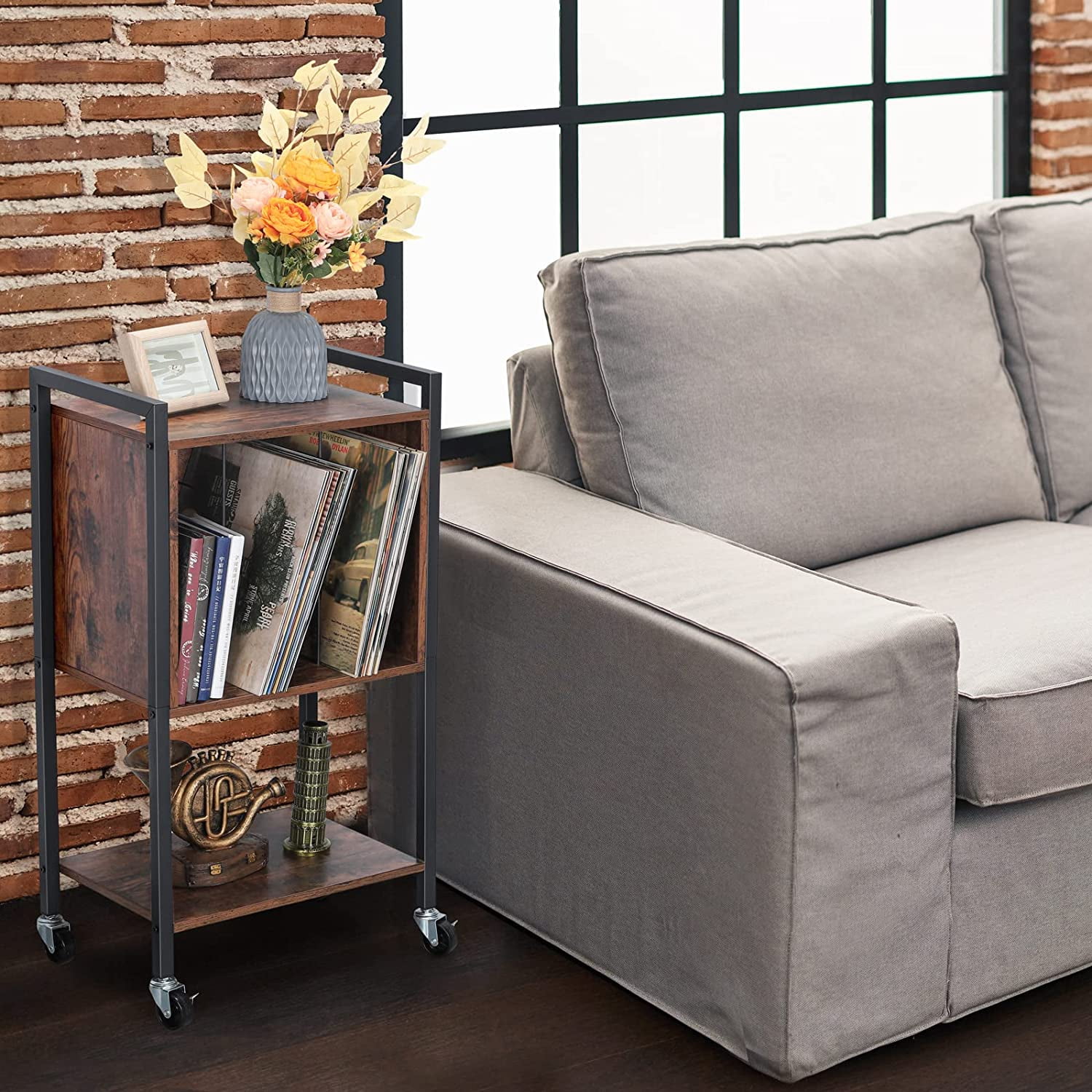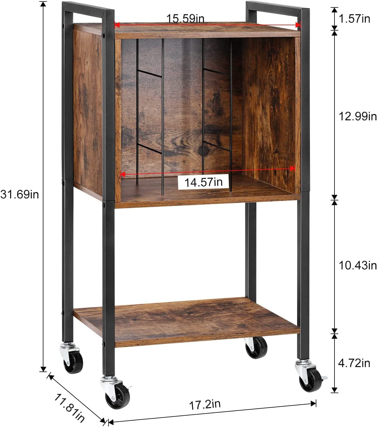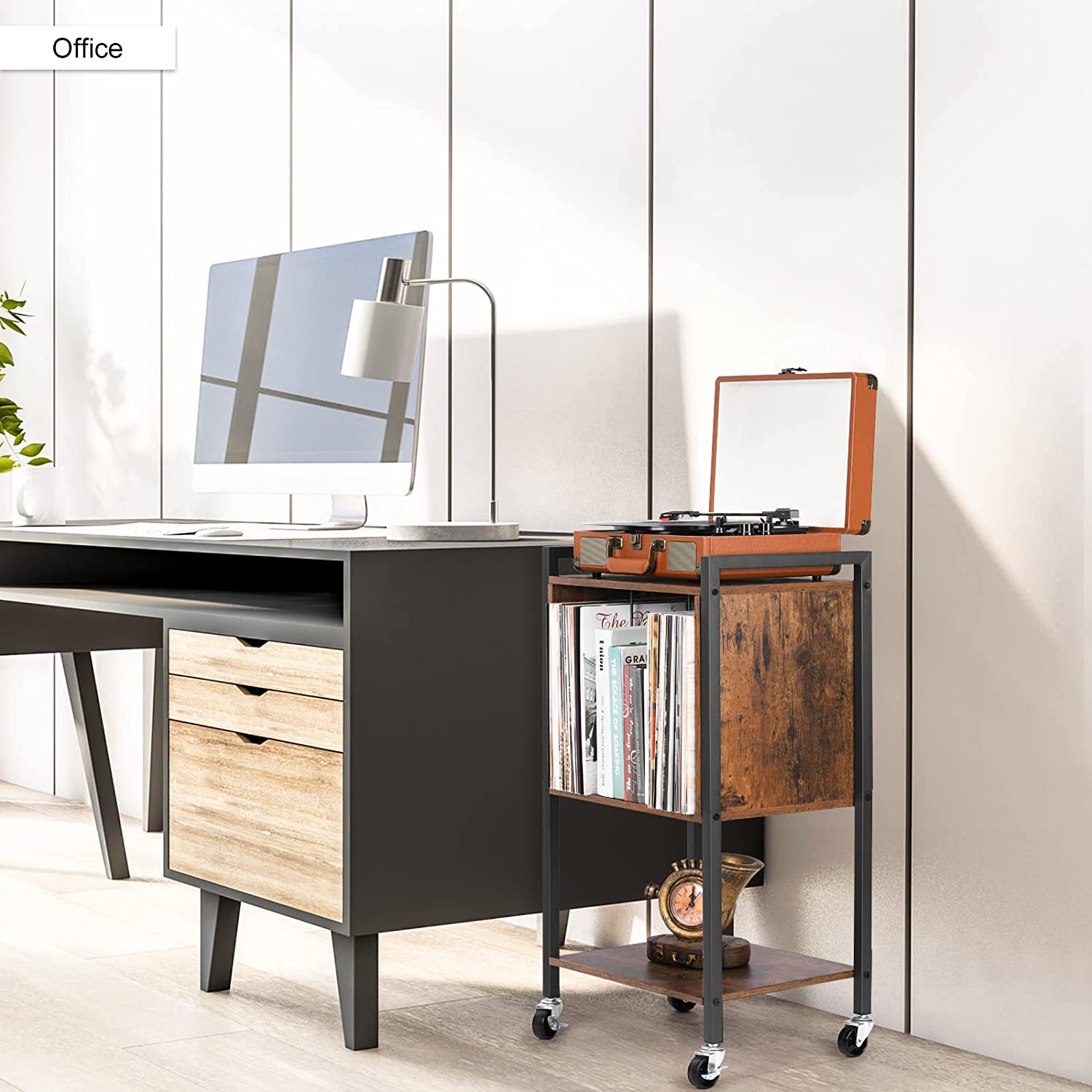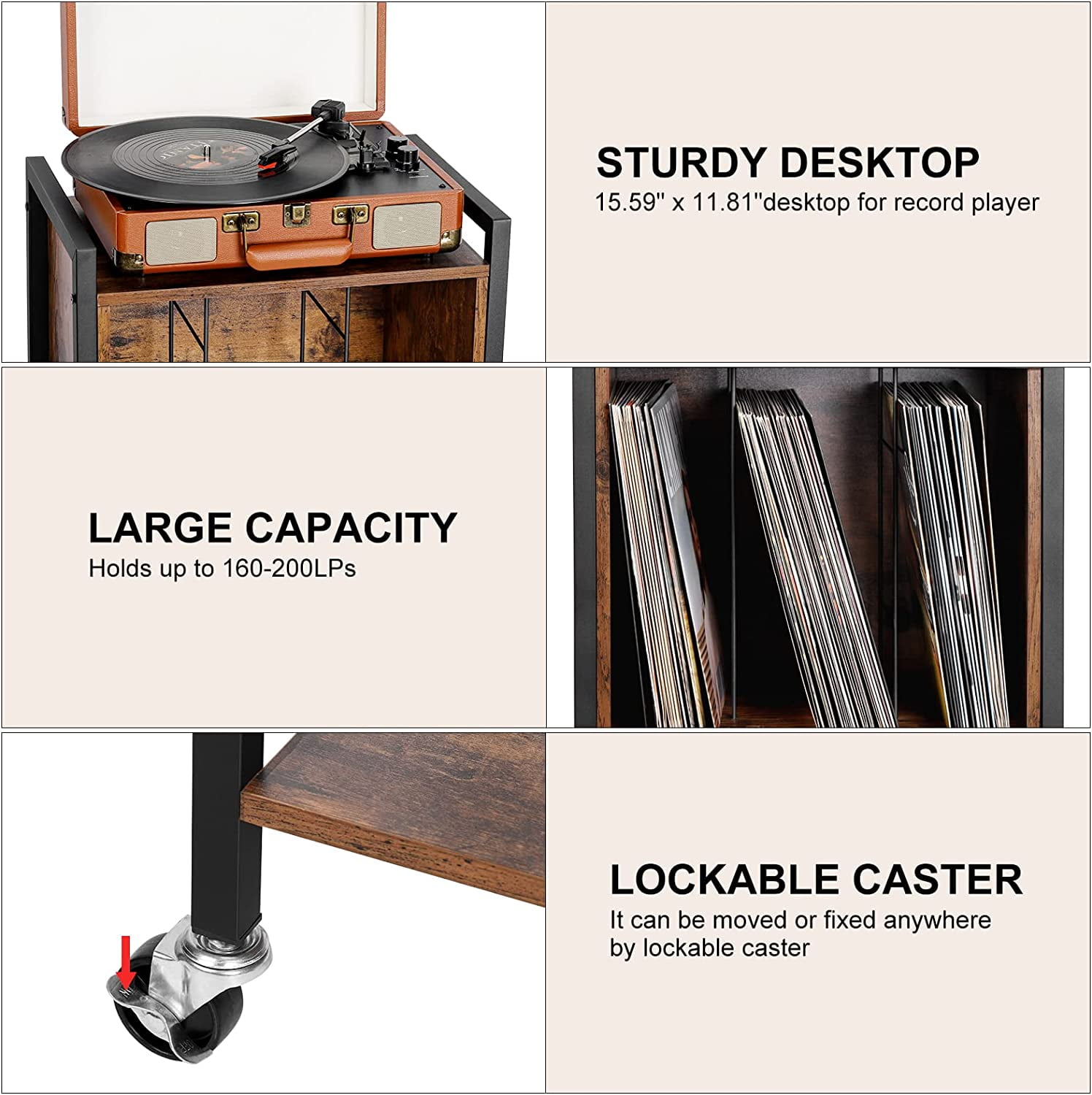 [Durable and Stable] Measuring 17.2″(L) x 11.8″(W) x 31.7″(H), This vinyl record stand is made of high-quality wood panels and a metal frame with a high load capacity for up to 40 pounds of weight. The top with metal handles is easy to move overall without wobbling or swinging, perfect for record players. [Multifunctional] This is an ideal vinyl record player storage cabinet, the first tier is used for record players, and the second tier has a large storage space and 3 compartments to hold up to 70-100 records. The third tier can be used for your favorite books and so on. In addition, it can also be a bedroom nightstand. [With wheels] There are 4 casters at the bottom to facilitate the movement of the whole set of record player table. The lockable caster can be controlled to move or fix the trolley. Silent universal wheels with brakes can create a quiet and warm home for you. [Easy to Assemble] Each part is monogrammed on the bag and comes with installation instructions in the package, so it is easy to follow the instructions and install the corresponding parts in sequence.