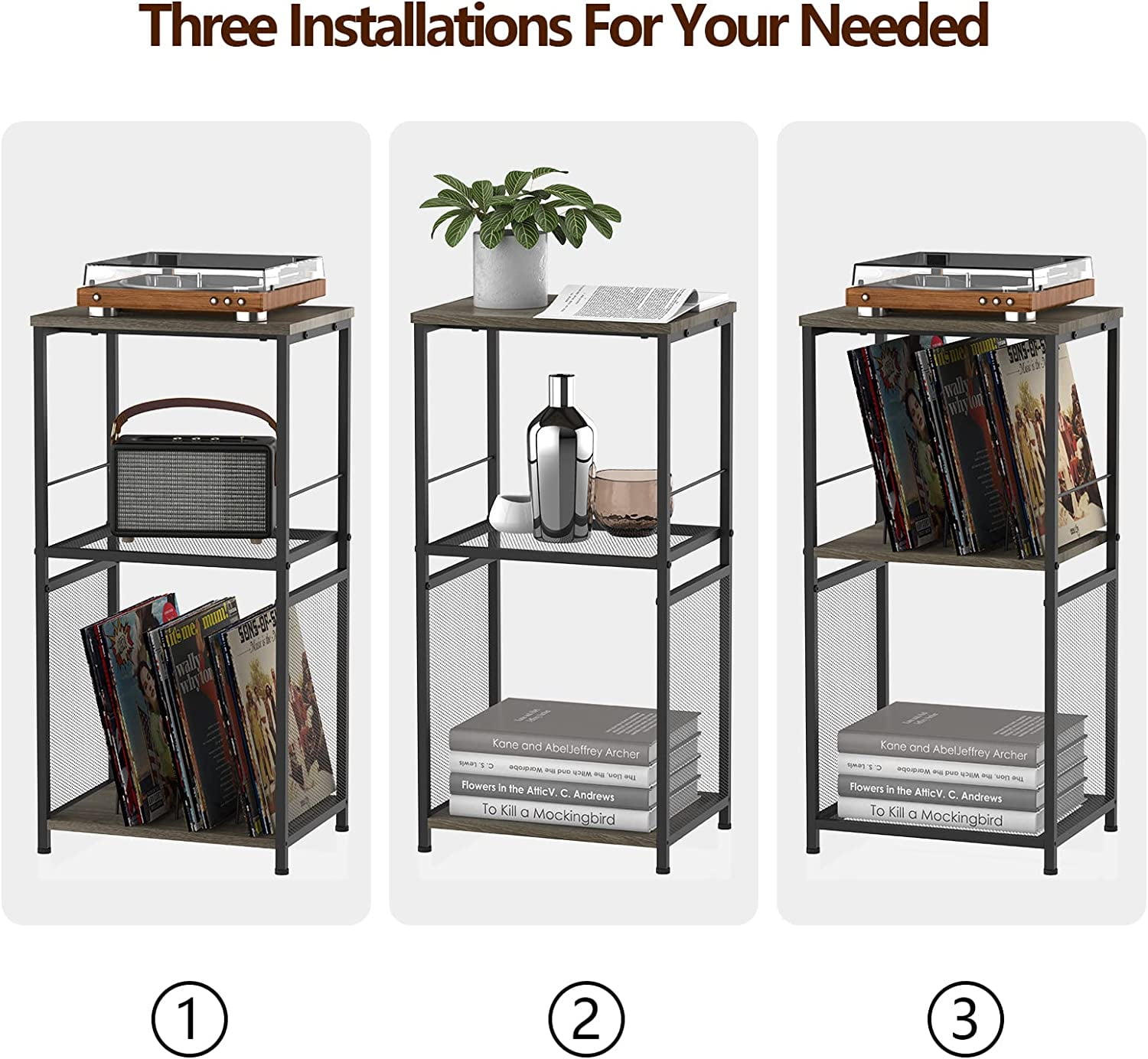 The record holder is made of high-quality gray particle board and a metal frame to ensure durability and stability. This vinyl record storage is the perfect size for organizing your collections. With 3 quick-release dividers, even if you just sore a few albums in the record holder, it will not dump. Adjustable feet make the end table more stable and won’t scratch your floor. You can have this turntable and records set up in a place anywhere. This record player table can not only as a record shelf to store record player and albums, but also as a side table, nightstand, bookcase, and more. You can place it in the living room, bedroom, or office.