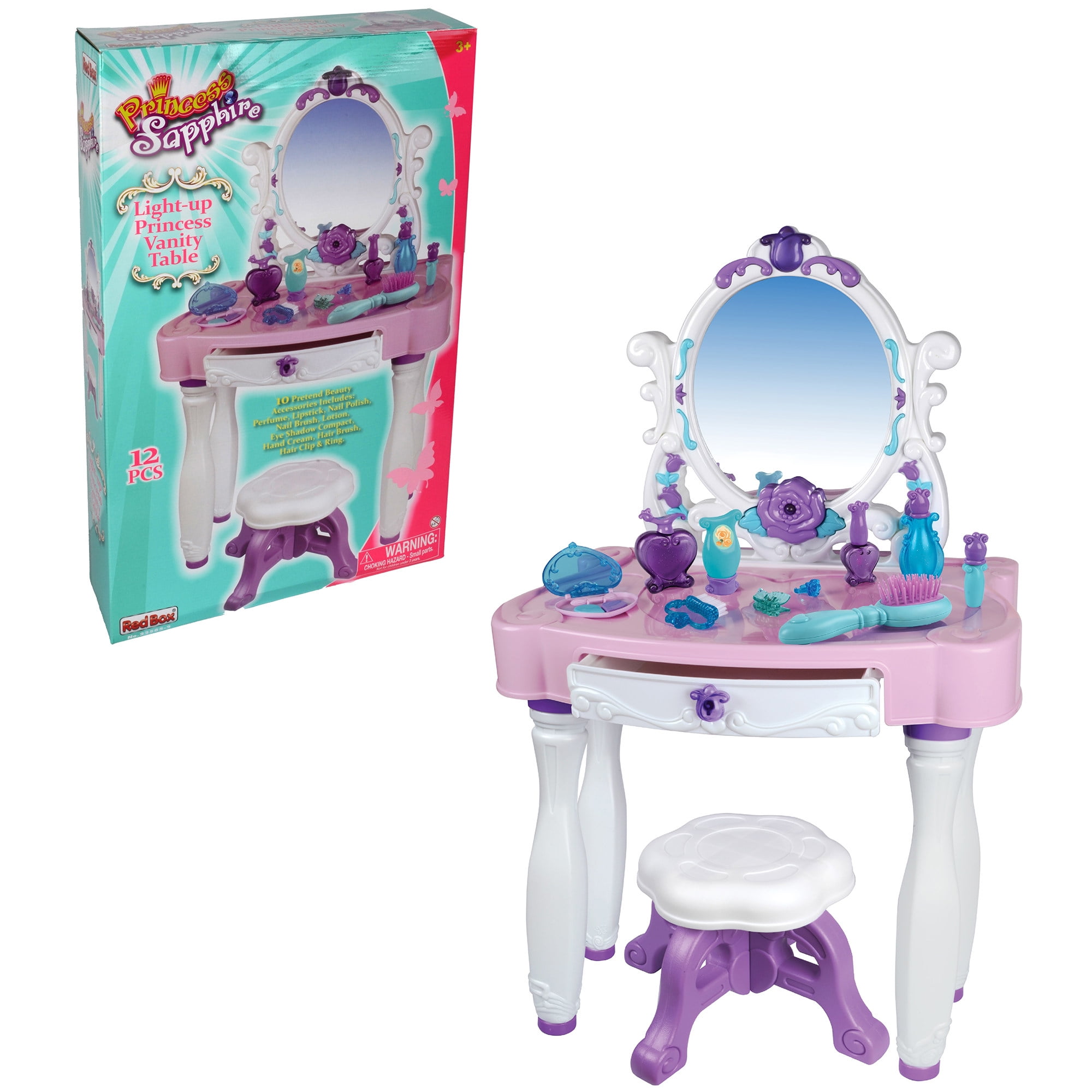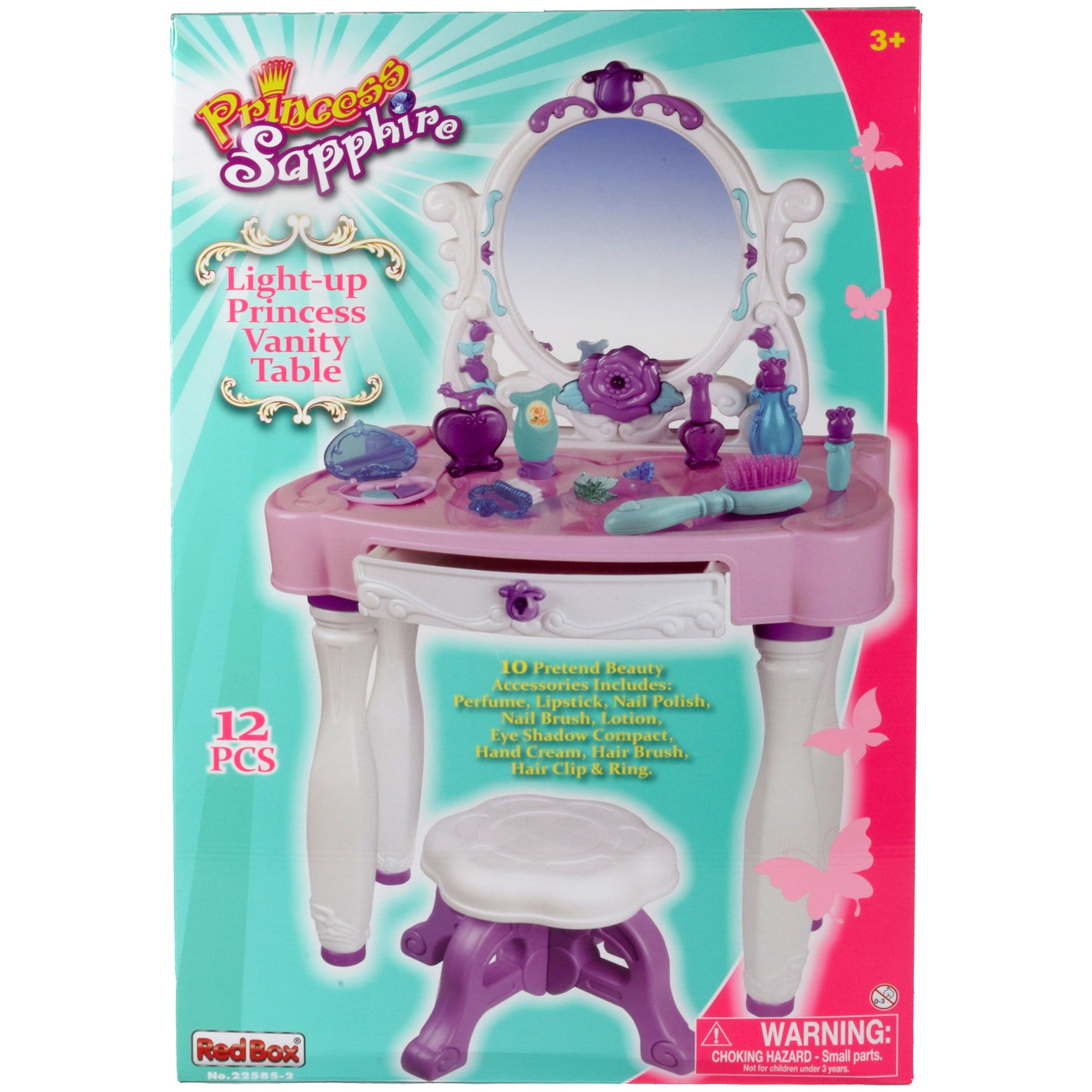 Red Box Pretend Play 12 Piece Princess Light Up Vanity Table Accessories Multicolor LightUp Mirror for a magical touch Includes a Vanity Table and Stool for comfortable play Comes with 12 beauty accessories: perfume bottle, play lipstick, play nail polish, lotion, eye shadow compact, hair accessories, and more Encourages imaginative role play and creativity Assembled size: L 18 5″ x W 12 5″ x H 31″