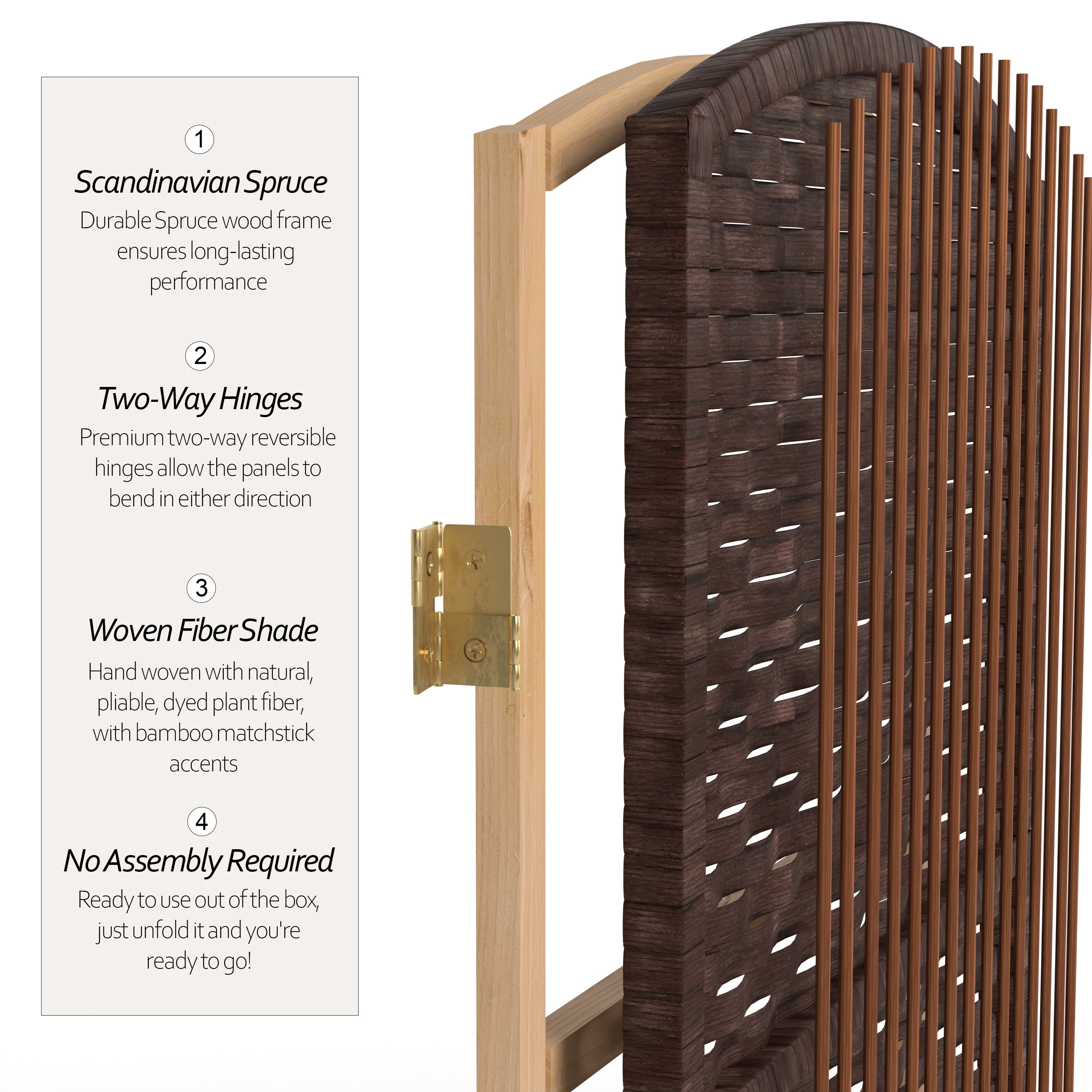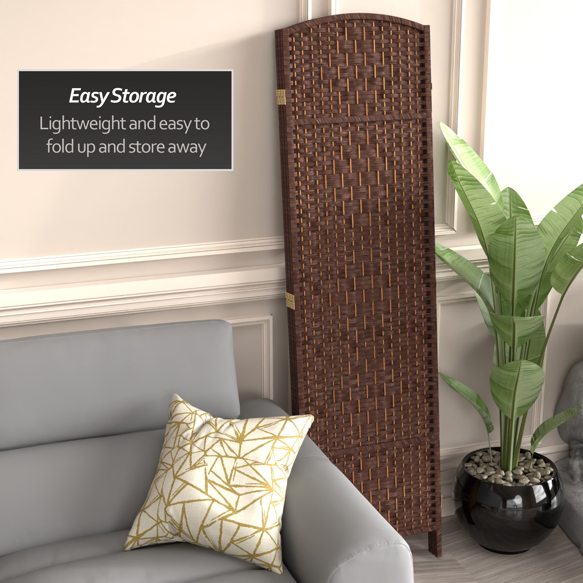Natural Wood and Fiber: Our folding screen is hand woven with natural plant fiber dyed with vivid color. The durable Scandanavian Spruce frame ensures long-lasting performance and is light enough to move and store easily. Convenient and Functional: This practical partition is pre-assembled, making it a breeze to set up whether you need privacy, a quick clutter solution, or a way to block window glare. Lightweight folding design is easy to fold up and store away. Flexible Double-Hinged Panels: Premium two-way reversible hinges allow the panels to bend in either direction so you can create the perfect configuration to suit your needs. It’s a versatile and user-friendly solution for customizing your space. Versatile Home Decor Accent: Use it to divide a room, hide clutter, or create an attractive backdrop for plants or sculptures. Perfect for privacy in dorm rooms and offices, or as a background for video calls and web conferences. No assembly required: This screen is ready to use out of the box. Just unfold it and you’re ready to go! Maintenance is easy, just clean it with a soft, dry cloth. Intended for indoor use only. Use for privacy and decoration Goes nicely with a wide variety of accessories and furniture Available sizes: 3 panels, 4 panels, 5 panels, 6 panels Available colors: Black, Dark Beige, Dark Mocha, Dark Red, Light Beige, Natural, White