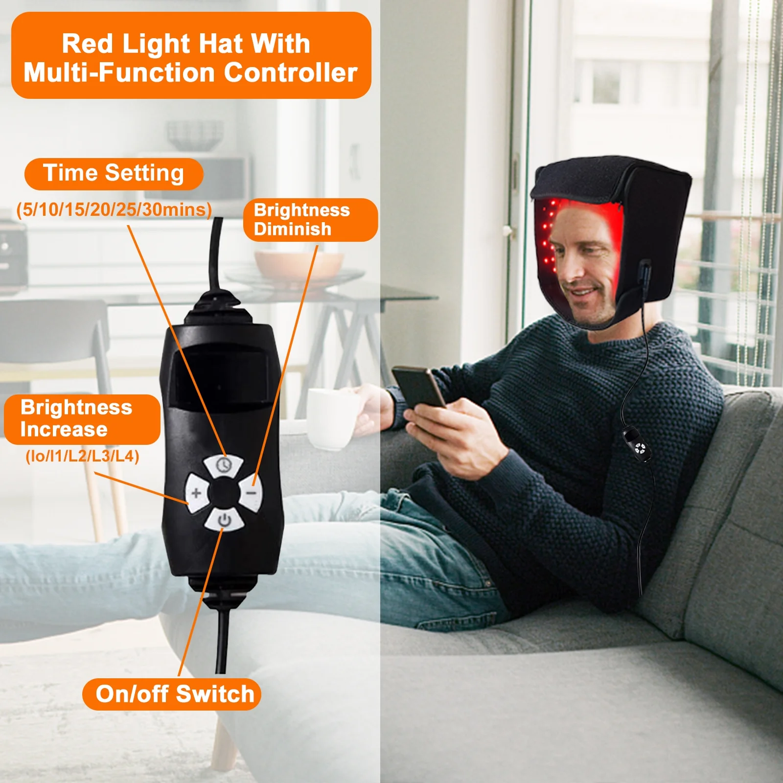 Repair hair follicles and scalp: The product upgrade uses155 pcs 3-in-1 lamp beads, each of which consists of two 650nm and one 880nm small lamp beads. Various data show that different wavelengths of light can meet different light transmission requirements. 650nm red light can accelerate cellular metabolic response, reduce inflammation and accelerate healing. 850nm near-infrared light has a particularly strong penetrating ability, which can penetrate deep into the tissue, promote blood circulation, repair the scalp, reduce hair loss, and is safe and reliable without side effects. Upgrade multifunctional: The upgraded controller is simple and beautiful in appearance and easy to operate The controller can adjust the brightness of the light source in 1-5 gears, and long press the controller to turn on the flickering function, which can meet your different needs. With a timing device of 10-90min, you can relax and fall asleep after setting the time without worrying about the instrument working for a long time. High Quality and Lightweight: Low light decay and long service life. The product uses skin-friendly materials and is designed to be a foldable hair growth treatment device. It is portable and lightweight, with a gross weight of only 200 grams, which is convenient for you to carry on travel without any burden. Quick Treatment: Recommended treatment time is only 30 minutes, 3 times a week (every other day) Red Light Therapy Device:650-670nm Red lights is especially effective for increasing collagen and blood circulation. It can generate follicles, which physicians believe can be used to enhance the results of hair loss treatments. 880nm Infrared light has a strong ability to penetrate deeper into tissue and scalp, enhancing hair follicle metabolism and stimulate the nutrition absorption of hair. Optical design of convex:The LED lamp inside the red light therapy hat adopts convex lamp beads, which can concentrate the light and make the light spread in a straight line. The concentrated light can make the red light therapy more precise to the root, which can reach the root of 1-3mm. It can speed up cellular energy metabolism. Portable with Auto Timer: This portable therapy cap comes with new integrated digital control and 20-min auto shut off timer system. It can be easily folded, making it easy to carry and place. The light bulbs are flat so you can not feel it when wearing. It is a perfect solution for home use, enjoy your light therapy anytime and anywhere!
