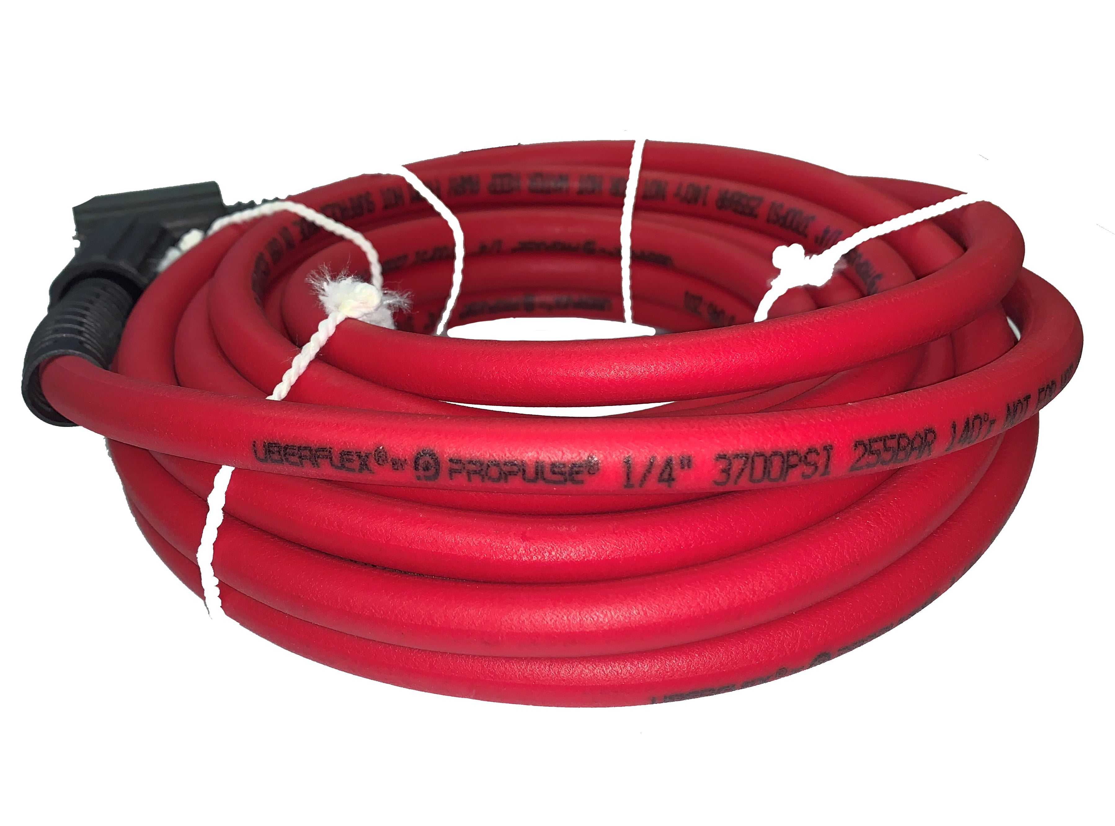 The most flexible hose in the industry! MADE IN THE USA The latest technology from ProPulse® delivers a revolutionary upgrade from the standard consumer grade and light commercial duty cold water pressure washer hose UBERFLEX™ possesses the unique properties of superior resistance to permanent kinking and abrasion UBERFLEX™ feels more like an extension cord than a hose, and possesses the smallest bend radius in its class Works on many pressure washer units with dual standard 22mm-14 female twist connects The proprietary high performance of the UBERFLEX™ cover is at least five times more abrasion resistant than traditional PVC covered hose 3,700 PSI working pressure 1/4″ ID x 50′ long Ends: (2) 22mm-14 Female twist connect