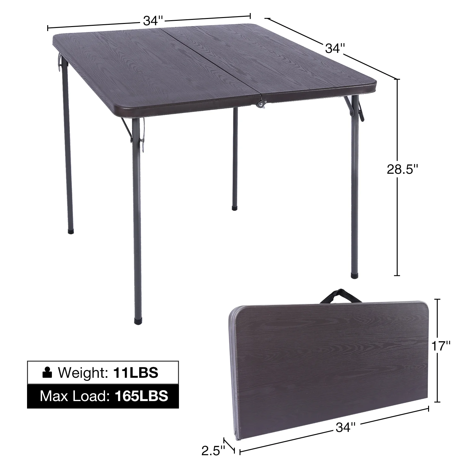 [Sturdy and Stable] Bottom of our square card table is finished with a sturdier honeycomb structure. The table is also designed with anti-slip feet caps and security locks to ensure the square table stable enough in use. [Easy to Setup and Carry] This fold-in-half card table can easily be set up within several seconds. Quick to fold out and take with the carry handle. It is also easy to clean the tabletop with paper or cloth. [Utility Table] The portable folding table can be used for parties, family reunions, playing cards, puzzles, and mah Jongg. Also suitable for patio, lawn, picnic, trade shows, meetings, receptions, and banquet venues. High quality Portable and convenient Dimensions: L 34″ x W 17″ x H 2.5″ Open Dimensions (when folded in half): L 34″ x W 34″ x H 28.5″ Weight: 11 lbs