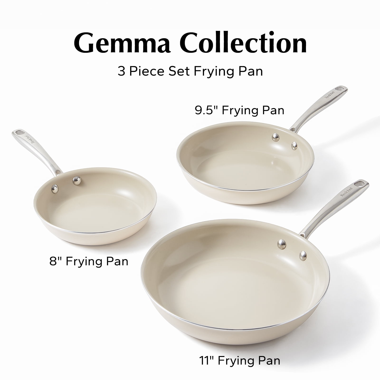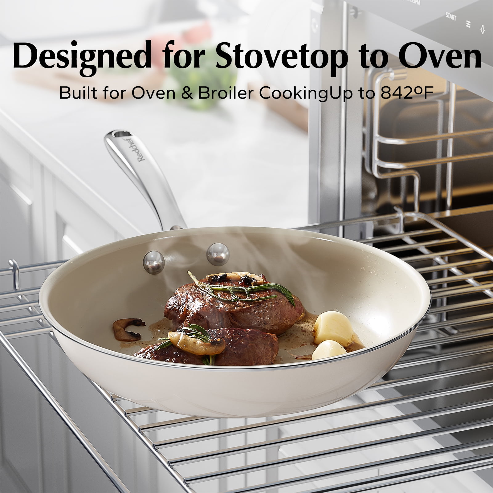 Introducing our exceptional skillets set, meticulously designed to elevate your culinary experience. Crafted with precision and innovation, this ceramic nonstick skillet boasts a state-of-the-art ceramic nonstick coating. Say goodbye to sticky residue and excessive oil usage, as this coating ensures effortless food release and easy cleanup, and the most important is NON-TOXIC and 100% safe. Beneath the surface, you’ll discover a robust foundation with fast and even heat distribution. The bottom of the nonstick frying pan is engineered to eliminate hot spots, ensuring that your dishes cook quickly and uniformly, every time. The handle is a testament to both form and function. Lightweight and cool to the touch, it offers an ergonomic grip for comfortable maneuverability. It’s double-riveted for unwavering strength, allowing you to seamlessly transition from stovetop to oven, where it remains resilient at temperatures up to 842°F. Durability meets convenience with this frying pans nonstick. After your culinary endeavors, cleanup is a breeze. A simple wipe-down and rinse with water suffices, or for added ease, you can opt for a dishwasher cycle. Remember, hand washing is recommended to extend the skillet’s coating lifespan. This skillet is a true kitchen companion, showcasing remarkable compatibility. It harmonizes effortlessly with induction, gas, and electric stovetops, offering versatility that knows no bounds. In summary, our cooking panembodies the pinnacle of culinary excellence, from its ceramic nonstick coating to its even heat distribution, cool handle, durability, and remarkable versatility. Elevate your cooking game with this indispensable kitchen cookware.