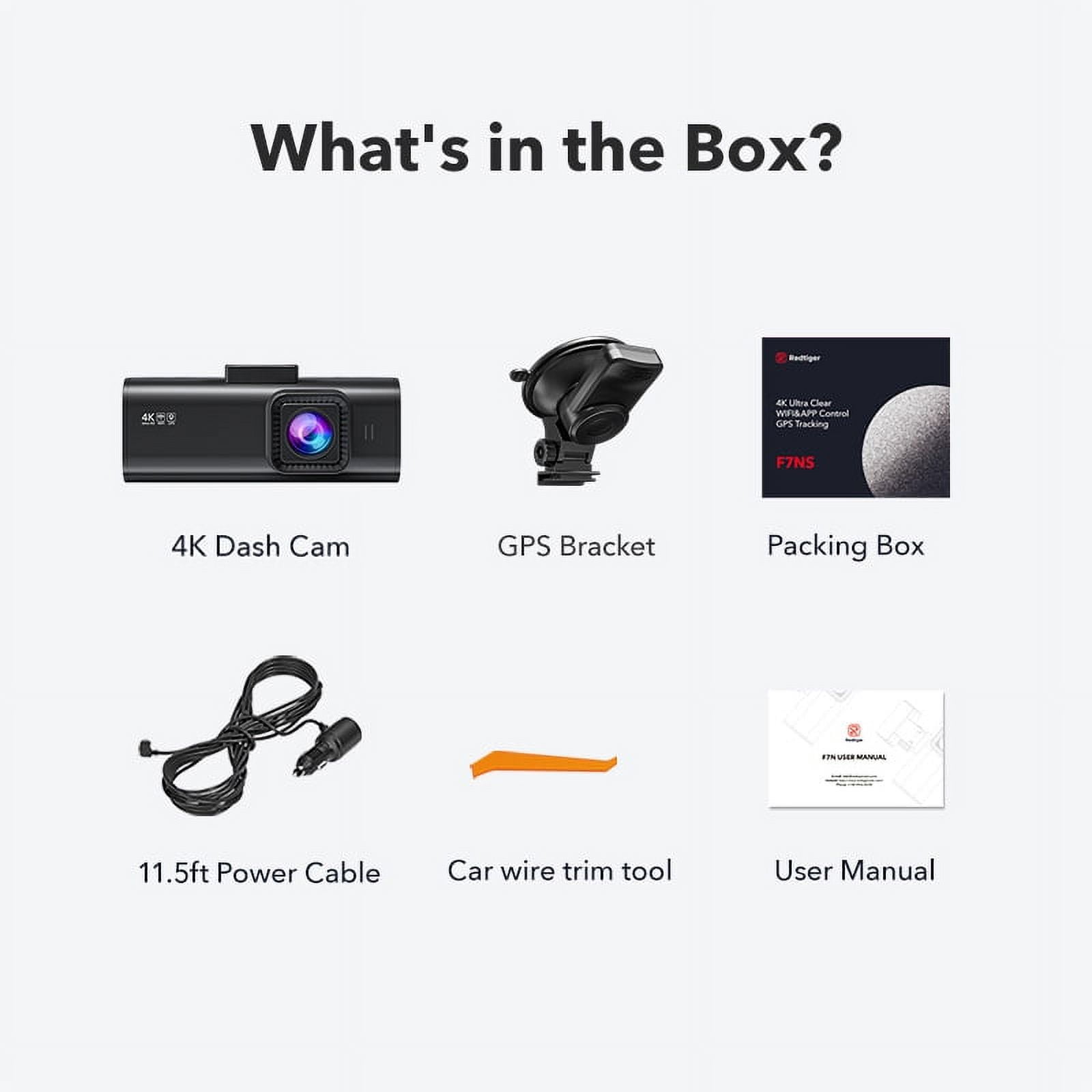 [ UHD 4K Recording ] Capture high-quality videos with resolutions of up to Ultra HD 4K (3840x2160P@30fps), 2560x1440P@60fps, or 1920x1080P@120fps. This ensures crystal-clear footage, allowing you to easily read essential details such as road signs and vehicle number plates. It’s an excellent choice for various vehicle types, including trucks, semi-trucks, pickups, and SUVs etc. [ WiFi/Smartphone App ] Connect the 4K dash cam to your smartphone effortlessly using the built-in WiFi. The Redtiger app allows you to operate live preview, playback, and device management directly from your smartphone. You can also download video files to your phone and share them with your friends on social media platforms. [ Dash Cam with GPS & Super Capacitor ] The built-in GPS module accurately records your driving location and speed. Using the app or our Windows and Mac compatible GPS viewer, you can view your driving route and tracker on Google Maps via WiFi. This feature provides additional evidence in case of accidents. The super capacitor in the dash cam ensures safe operation even under extreme temperatures, reducing the risk of overheating and exploding. [ Enhanced Night Vision ] The dash cam front is equipped with an F1.5 large aperture and 6 glass lenses, enabling it to capture clear details even in low-light conditions. Professional WDR and HDR technology automatically adjust the exposure at night, ensuring excellent image clarity and making car license plates easily visible. The 170° wide-angle lens reduces blind spots and captures more scenes on the road. [ G-Sensor/Loop Recording/24-Hour Parking Monitor ] The G-sensor detects sudden shocks or collisions and automatically locks and saves the footage to prevent it from being overwritten. The loop recording feature ensures continuous recording by overwriting the oldest files when the memory card is full. The 24-hour parking monitor function allows the dash cam to record your car’s surroundings continuously, providing a safer parking environment. The time-lapse function helps save memory space. [ Easy to Use and Super After-Sales Support ] The dash cam front is user-friendly with a simple and customized interface. Installation is effortless with the included suction cups. Our top priority is customer satisfaction, and the dash cam is backed by a 18-month warranty and a 100% Satisfaction Guarantee. Our customer service team is available to address any questions or concerns, and we provide 24/7 technical support. ????【What‘s in the Box?】 1 x REDTIGER 4K Front Dash Cam ; 1 x Suction Cup with GPS; 1 x 11.5ft Power Supply Cable with Car Charger; 1 x Crowbar; 1 x User Manual ????????????REDTIGER New Dash Cam Recommendations REDTIGER 4K/2.5K+1080P Dash Cam WiFi & GPS with 32GB Card Click here REDTIGER 4K/2.5K+1080P Dash Cam with WiFi & GPS Click here REDTIGER 4K+1080P Dash Cam WiFi & GPS with 32GB Card Click here REDTIGER 4K Dash Cam Touch Screen WiFi & GPS with 64GB Card Click here REDTIGER 3-Channel Dash Cam with 5G WiFi GPS, Free 64GB Card Click here REDTIGER 4K UHD+1080P 11″ Mirror Dash Cam with 32 GB Card Click here REDTIGER 11″ UHD 4K+2.5K Touch Screen Mirror Dash Cam with 32GB Card Click here