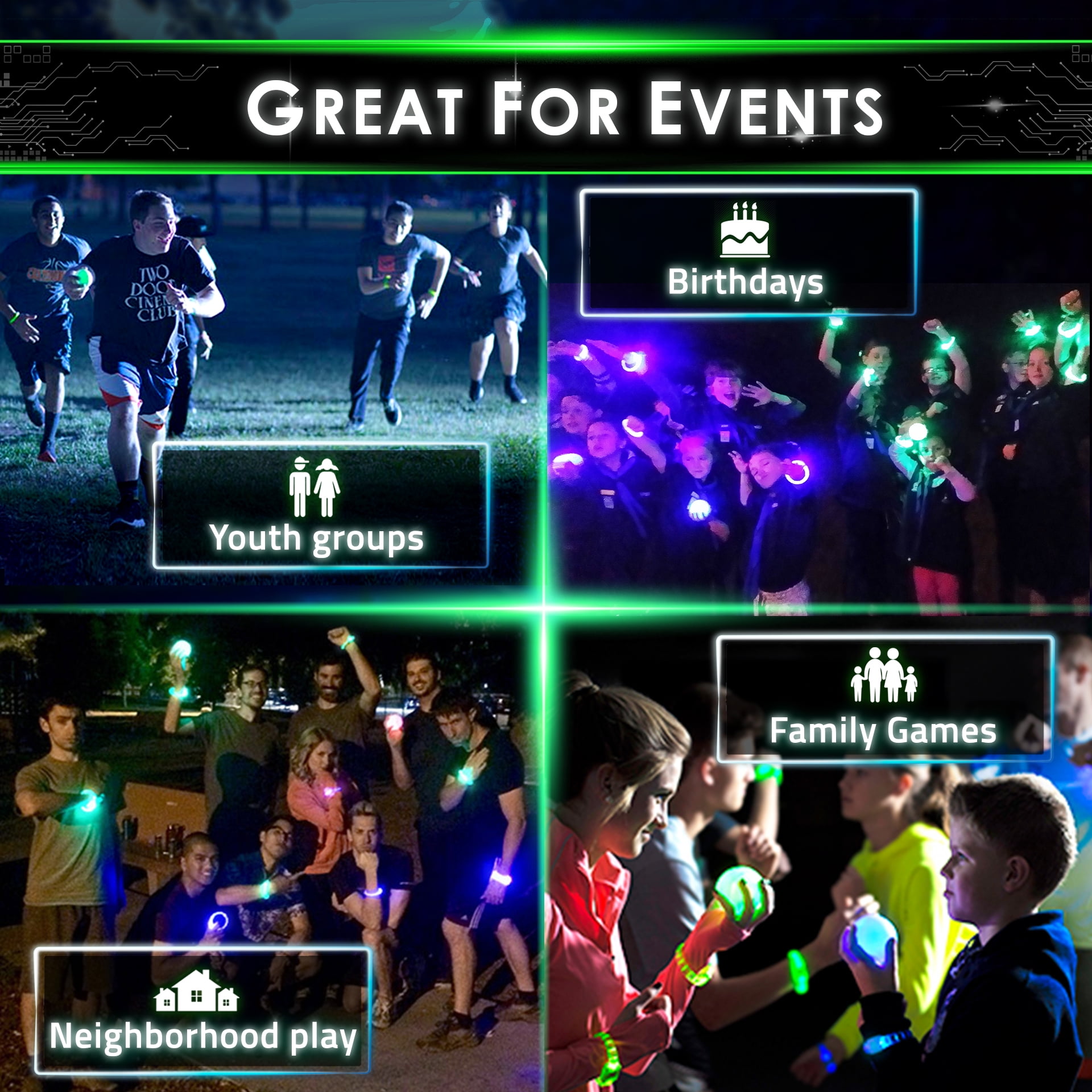 Win as a team through stealth, speed, and strategy – a refreshing take on kids’ games Easy setup, simple to play – a perfect choice for family game night All ages play together – superb for outdoor party games, backyard games, and camping games Outdoors and screen-free – with rare excitement compared to other outdoor games for kids ages 8-12+ A multi-award-winning, unique gift – an ideal option for teen boys’ gift ideas Family reunions and youth groups Birthday party activity or a memorable birthday gift A distinctive gift for boys ages 8-12+ and girls A glowing alternative to traditional sports gifts and obstacle courses Innovative replacement for flag football, laser tag, and giant yard games 2 Glowing Orbs 5 Territory Lights 8 Jail Markers 8 Team Bracelets 12 bonus game options (free download)