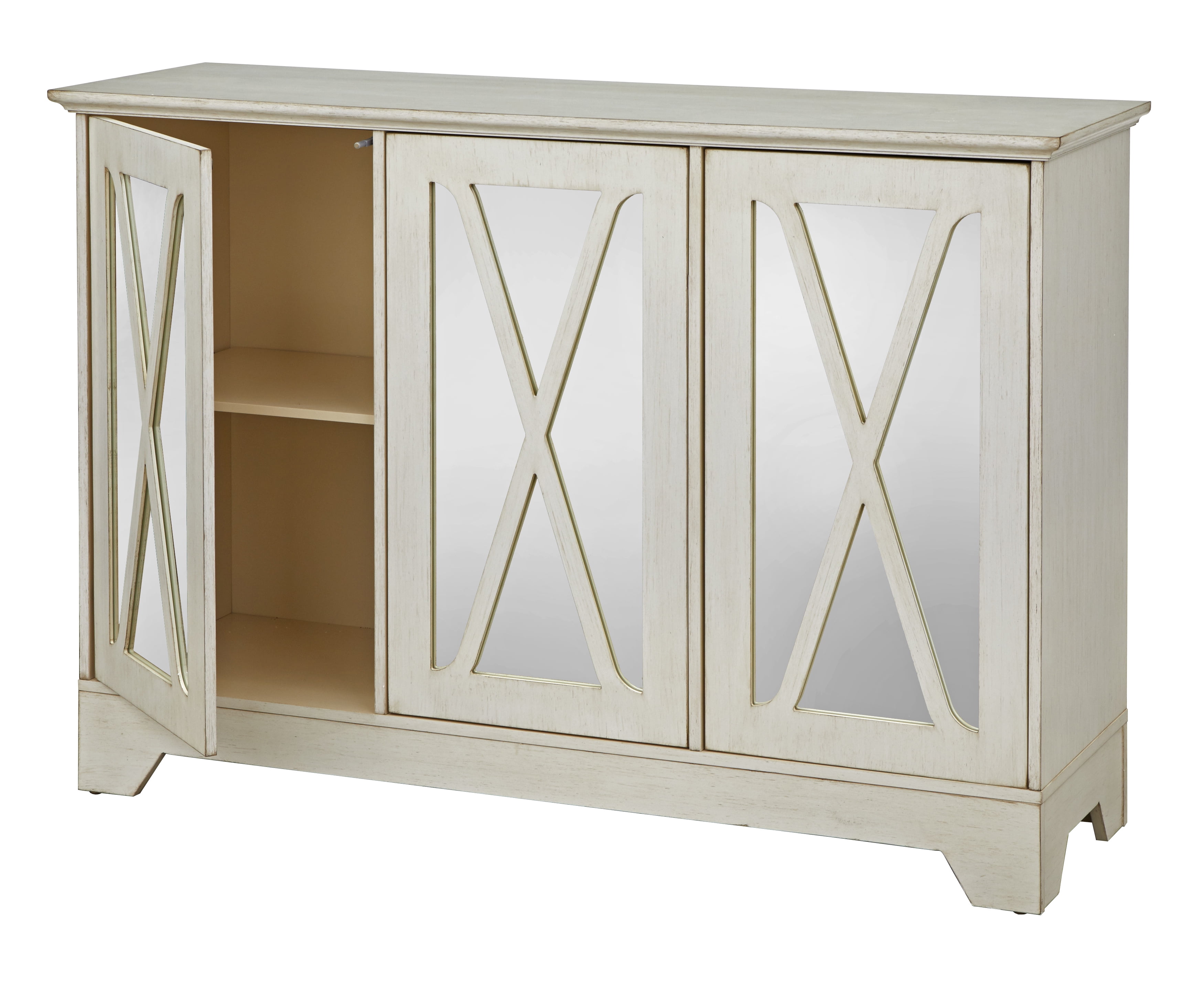 Reflections Buffet/Console with Mirror, Box 1 of 2, Antique White: 3 mirrored doors with curving X design An adjustable shelf behind each door Materials: MDF, mirror Requires some assembly Dimensions: 52″L x 15.75″W x 35.4″H Model# 31552AWH Site to Store Pickup Note: This item is packaged in multiple large boxes that may not fit in a standard-sized vehicle. Please make sure you have a large car or truck for store pickup. Box 1 dimensions: 32.5″L x 20″W x 6.75″H; weight: 53 lbs Box 2 dimensions: 56.75″L x 20″W x 5″H; weight: 56 lbs