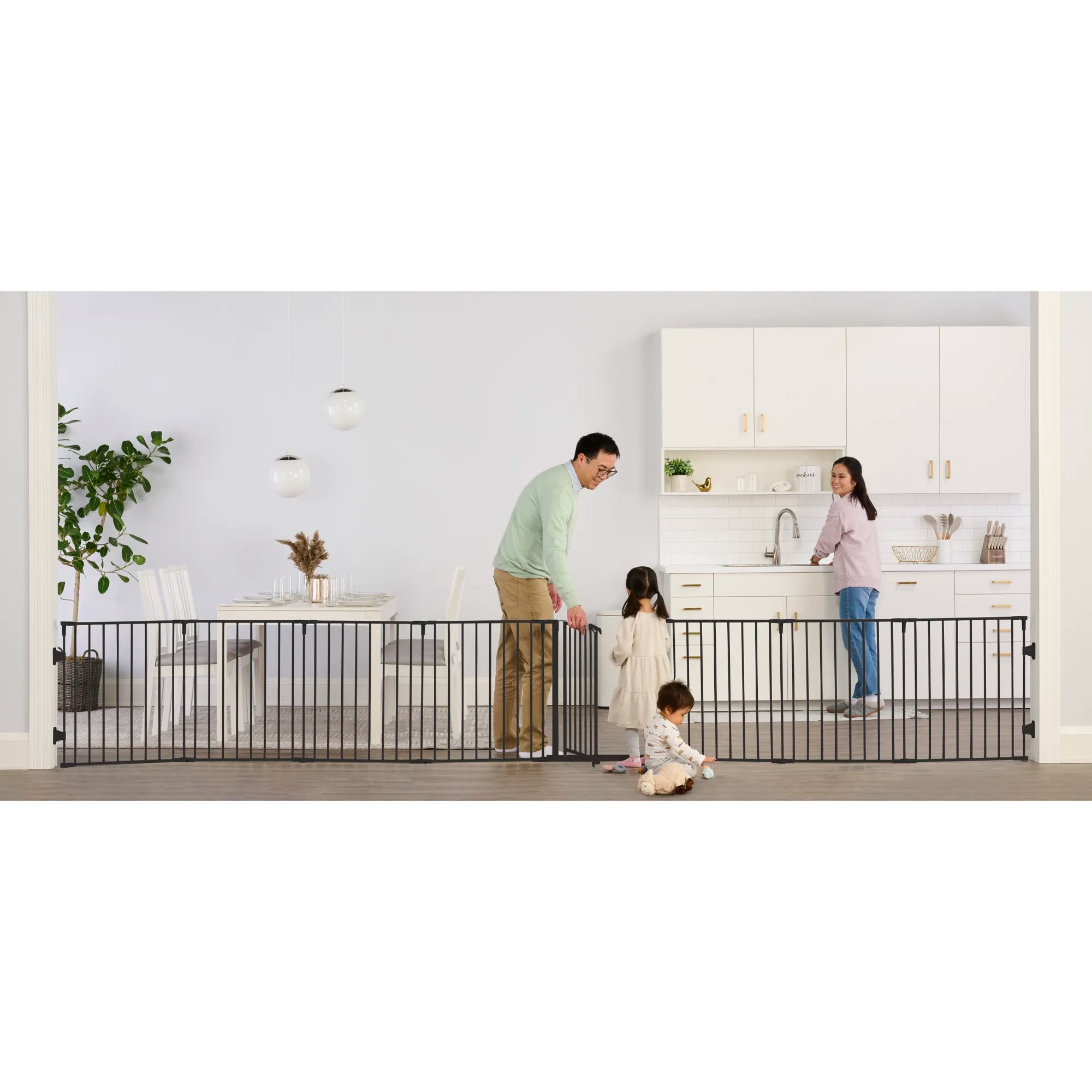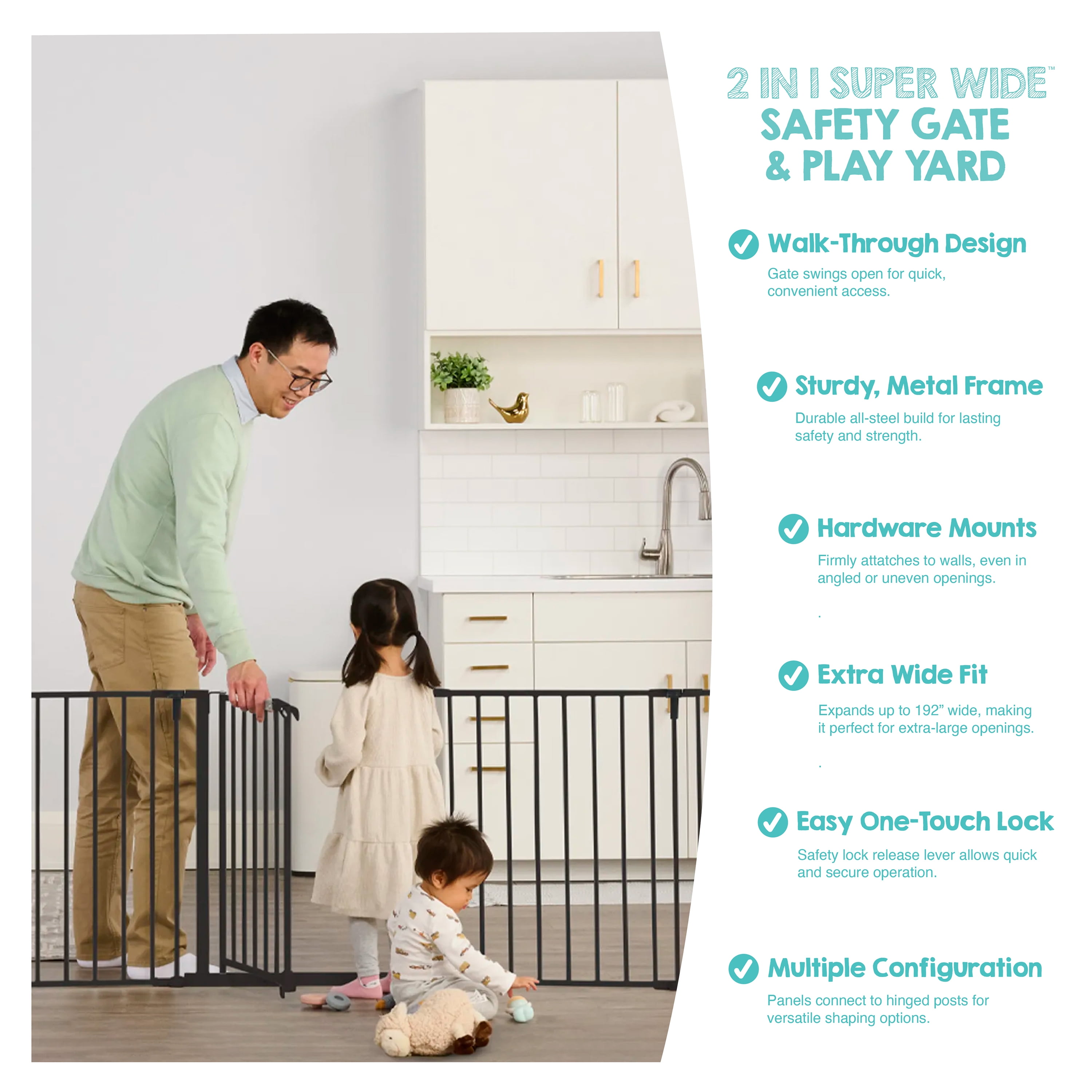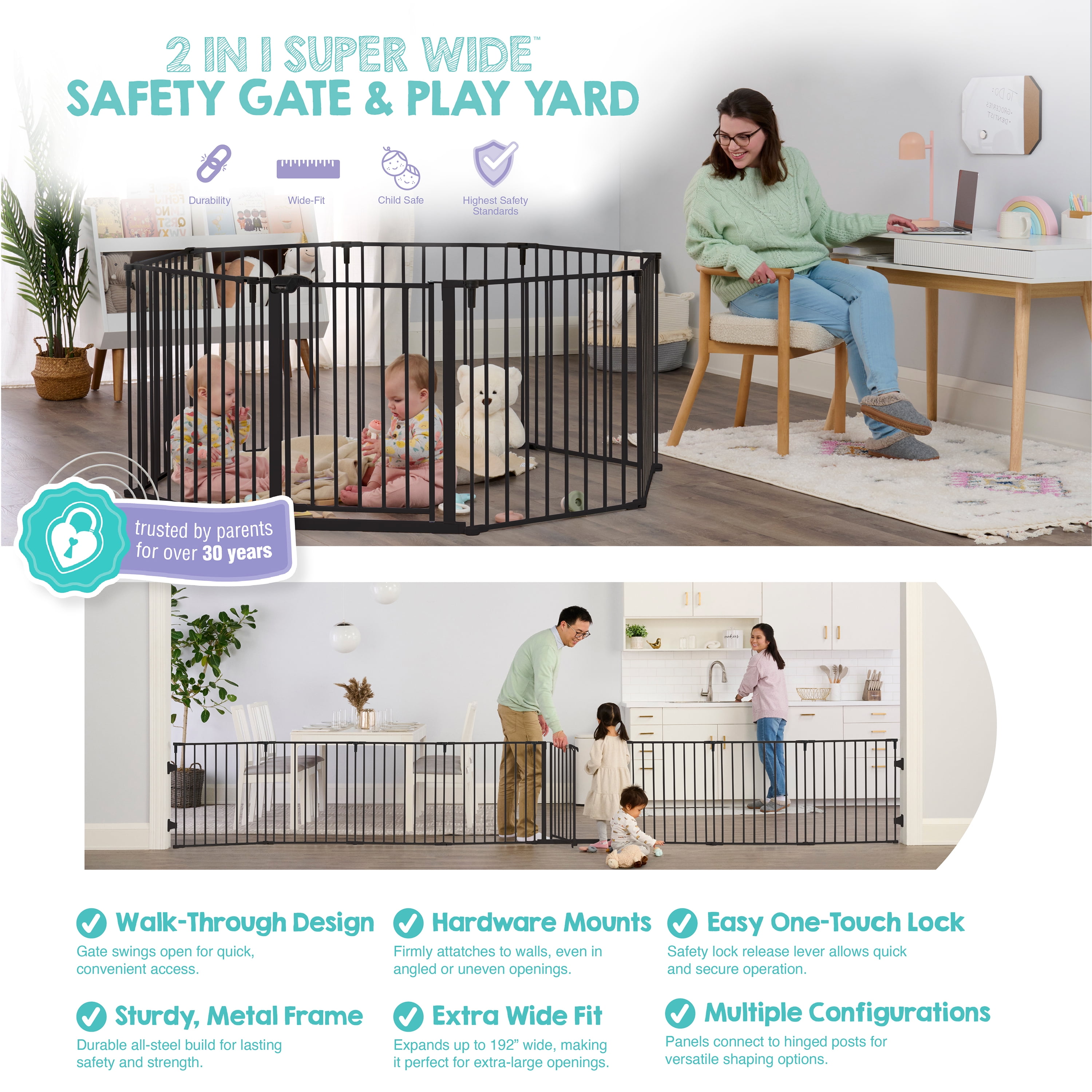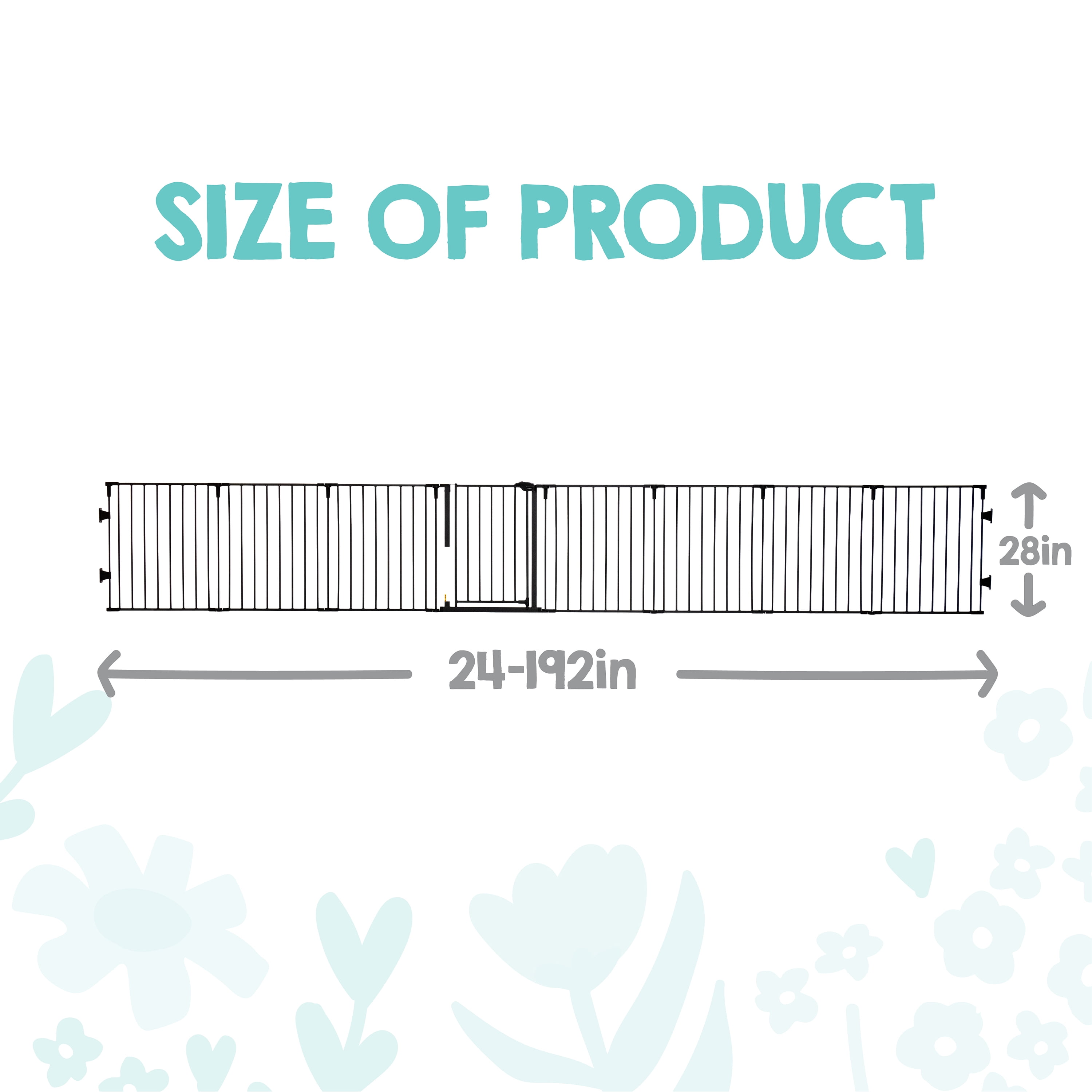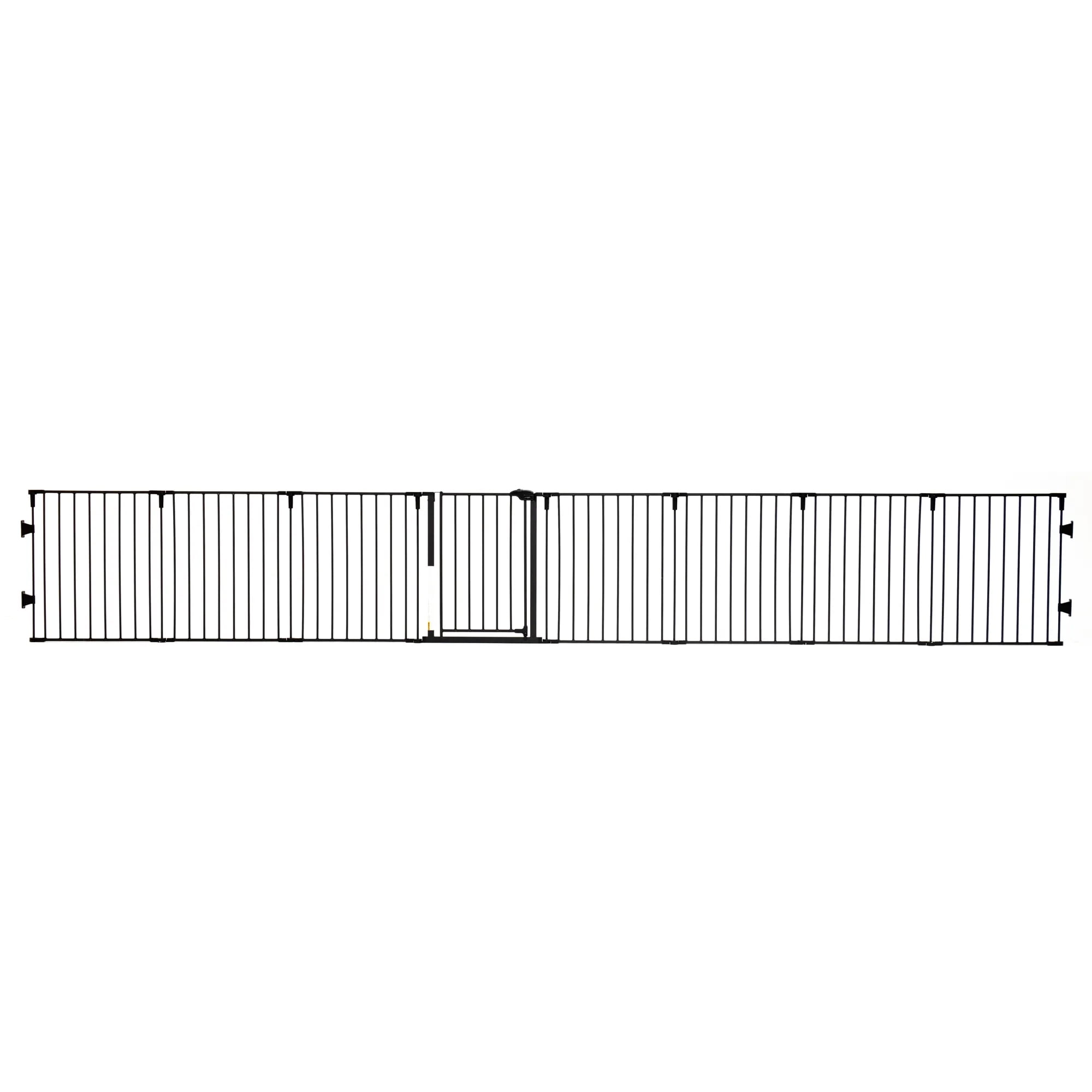 SUPERWIDE: Fits opens up to 194 inches wide and stands 28 inches tall 2-IN-1: Can convert from a Super Wide™ gate to an 8-panel play yard. No tools required, quick and easy. Includes 4 pack of wall mounts CONFIGURABLE: Each panel can be adjusted to fit almost any opening. Great for wide spaces, angled openings, hallways, and doorways. Folds flat for storage. Wipes clean. DURABLE AND CONVENIENT: The all steel design is durable and convenient with a walk-through door SAFETY: Designed with a walk-through door with safety locking feature. Wall mounted for added security and protection. Meets all current safety standards. For children up to 24 months and great for pets too