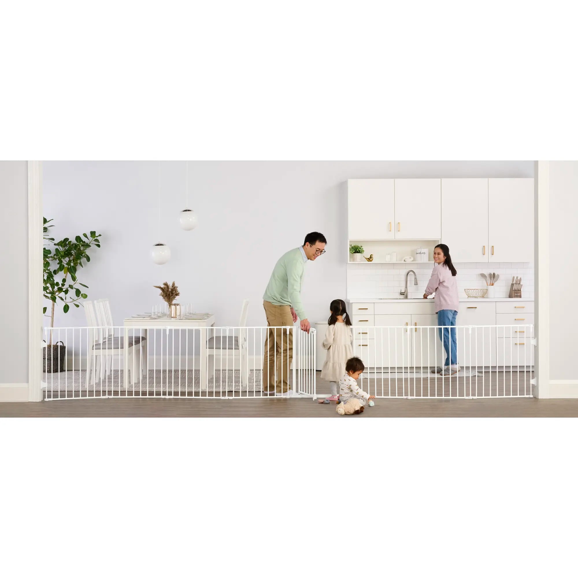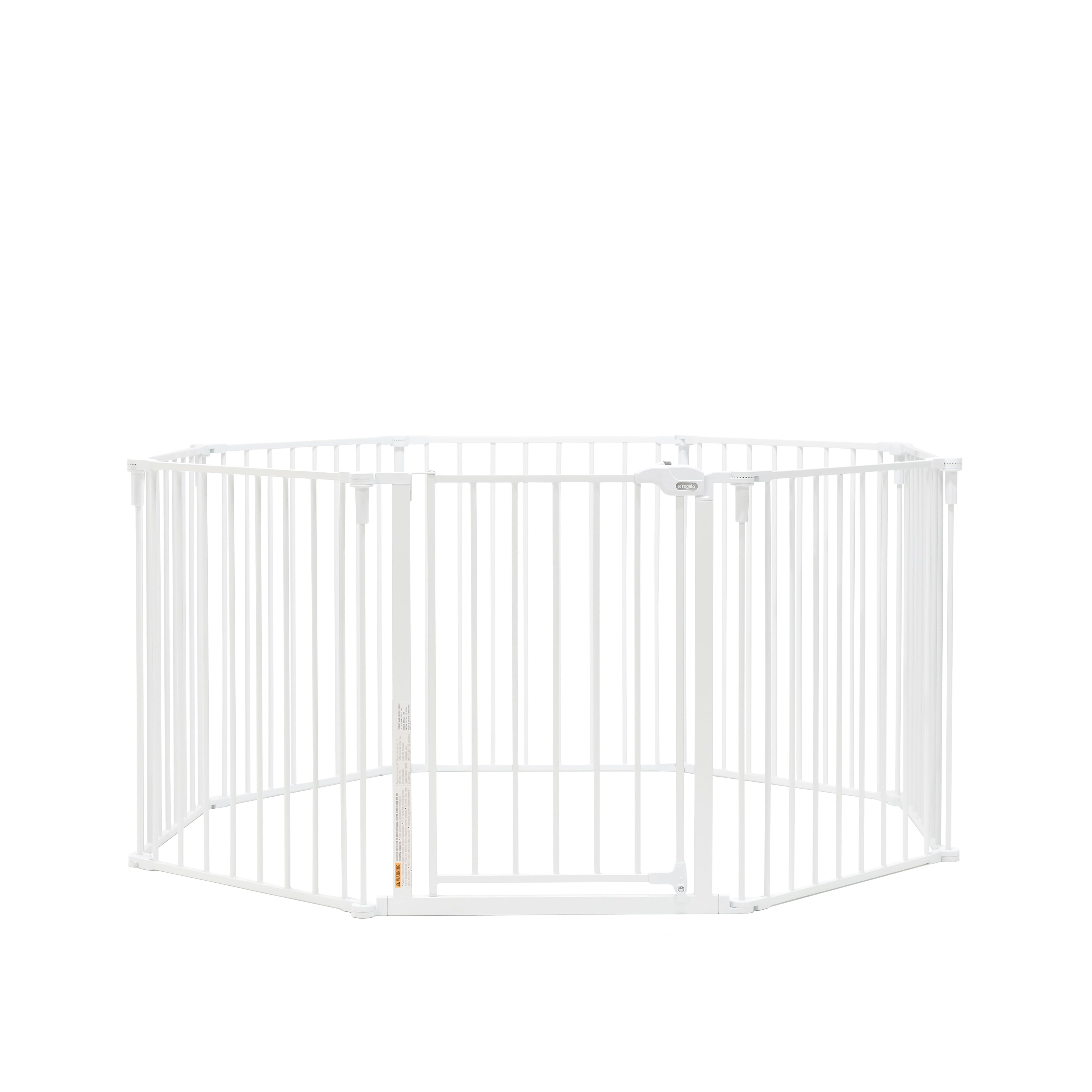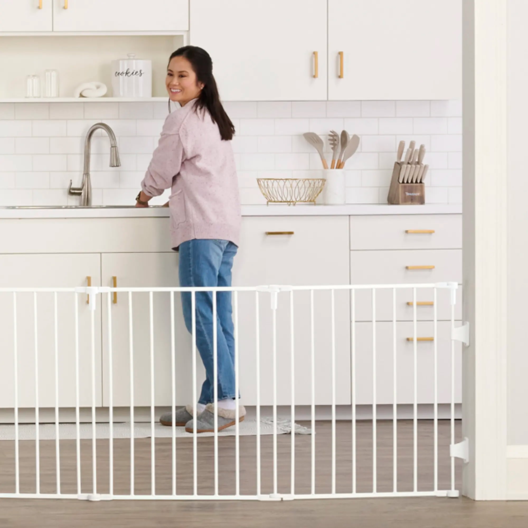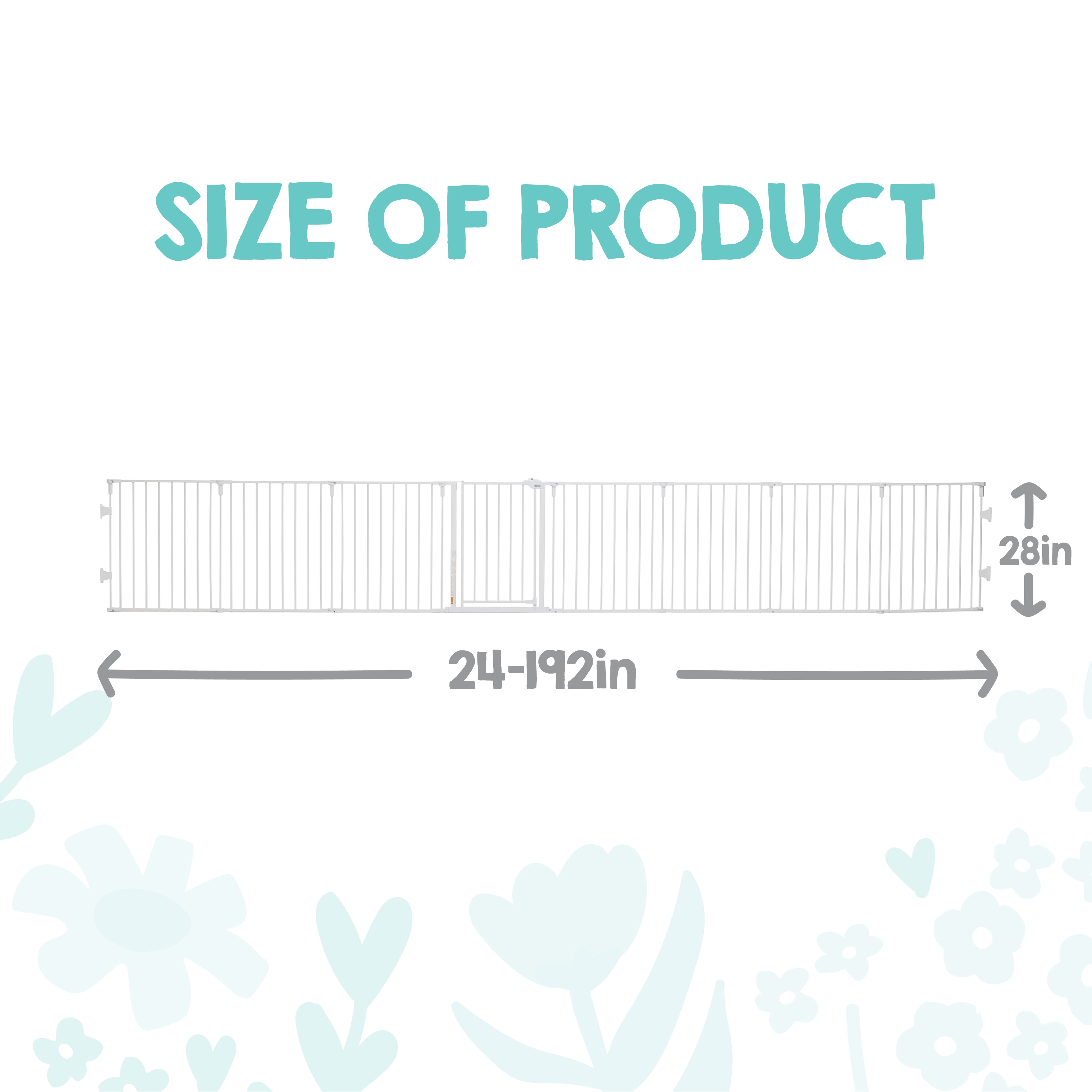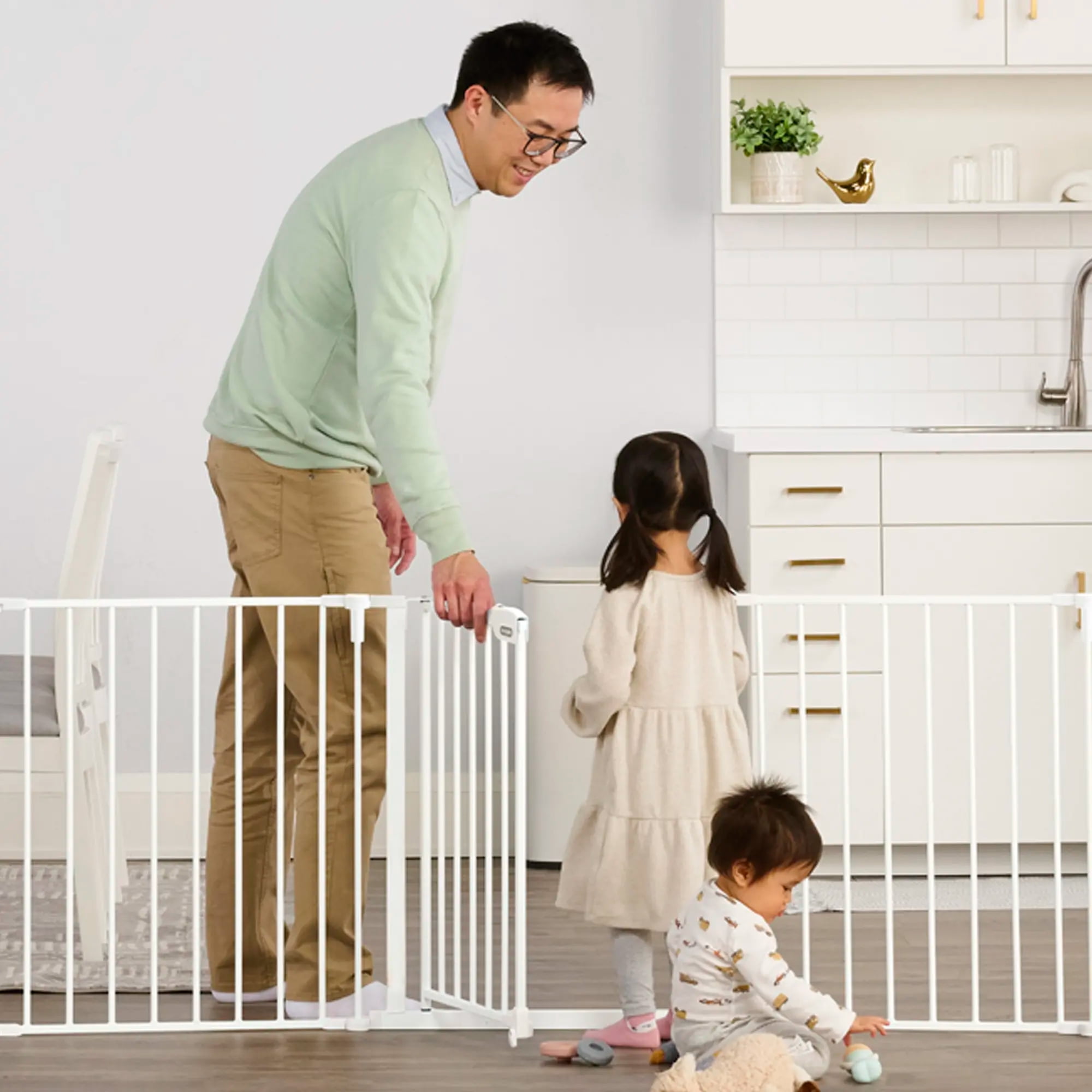 Once your little one starts walking, child proofing your home is a must. Providing a versatile way to keep your child safe, the Regalo Super Wide Baby Gate and Play Yard offers numerous convenient configurations for around the house. This play yard and safety gate features durable all-steel components and a hardware-mount system ideal for large, angled or uneven openings. The super wide gate can be expanded to fit openings up to 192 inches and comes with eight, 24 inch panels. It is ideal as a play yard, fireplace barrier, at the landing of stairs, or a super gate for very wide openings. Minimum opening for this gate is 50.5 inches.
