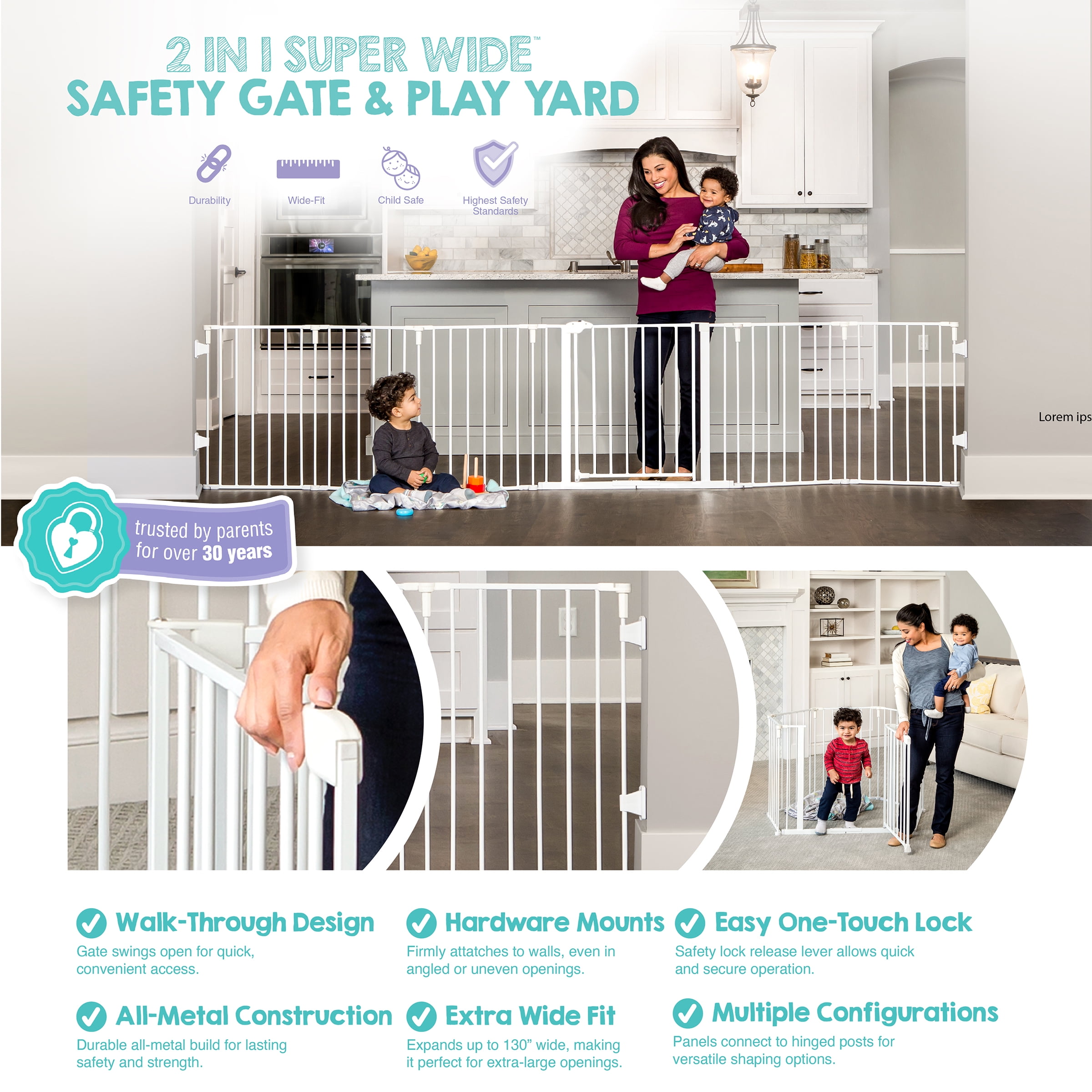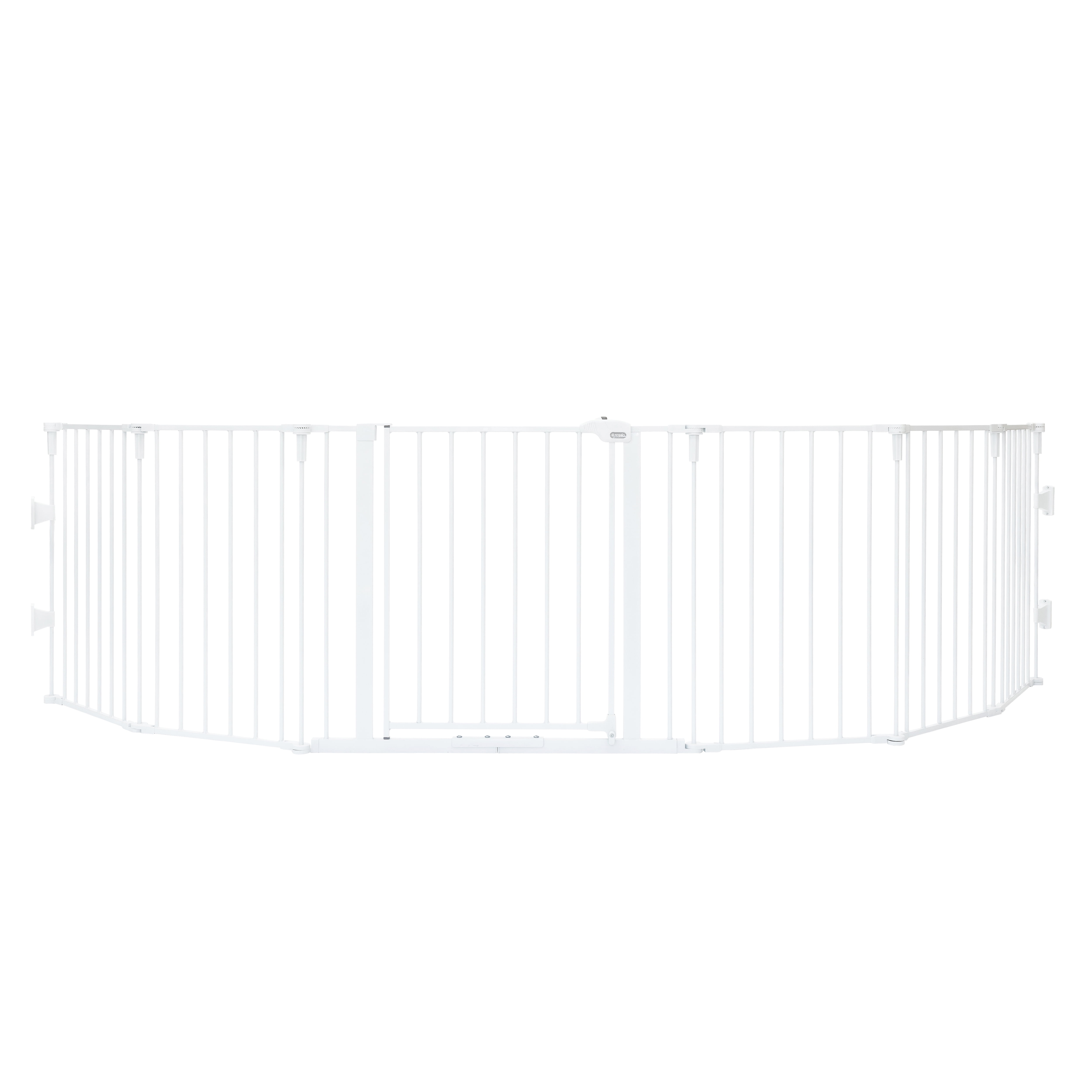 Regalo 6 Panel Super Wide Baby Gate and Play Yard, 2 in 1: Includes six 21.5″ panels Can fit openings between 56″-130″ Wall mounting brackets add 2″ to each side, 4″ total Stands 28″ tall Easy one-touch safety lock release lever Convenient walk-through design Easy setup and takedown with hardware mounts, some assembly required