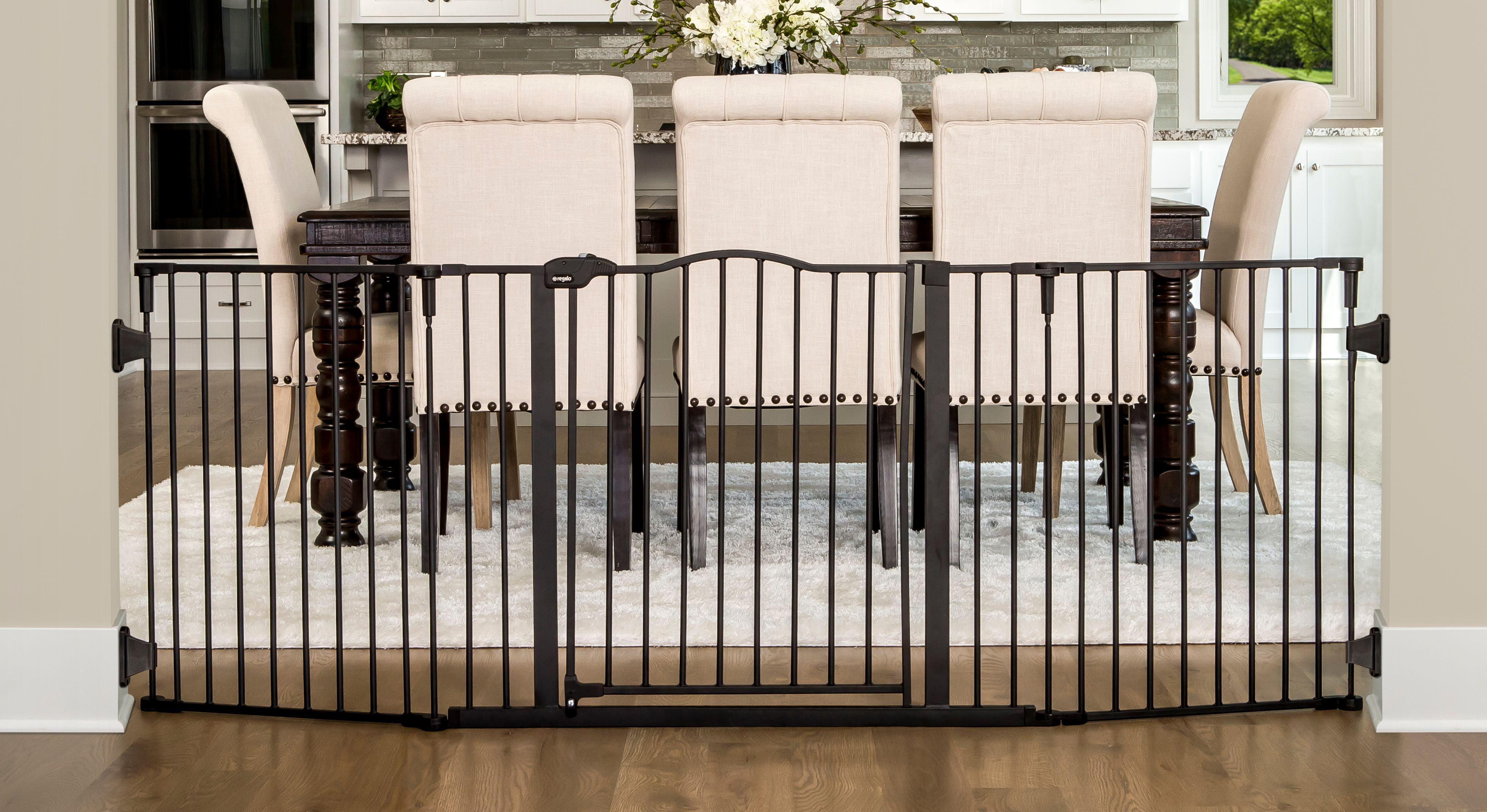 The versatile Regalo Home Décor Super Wide Baby Gate is an essential tool for homes with an open floor plan or unusually shaped or angled openings. The safe and convenient gate stretches to fit a variety of openings and is a unique way to protect both your child and home. Made of an all-steel construction, the black décor gate can be arranged a variety of ways. Spanning to fit odd shaped openings from 56” up to 74” wide. Easily mounting to the wall, the convenient gate features a large walk-through door designed with a three-lock system for added security.