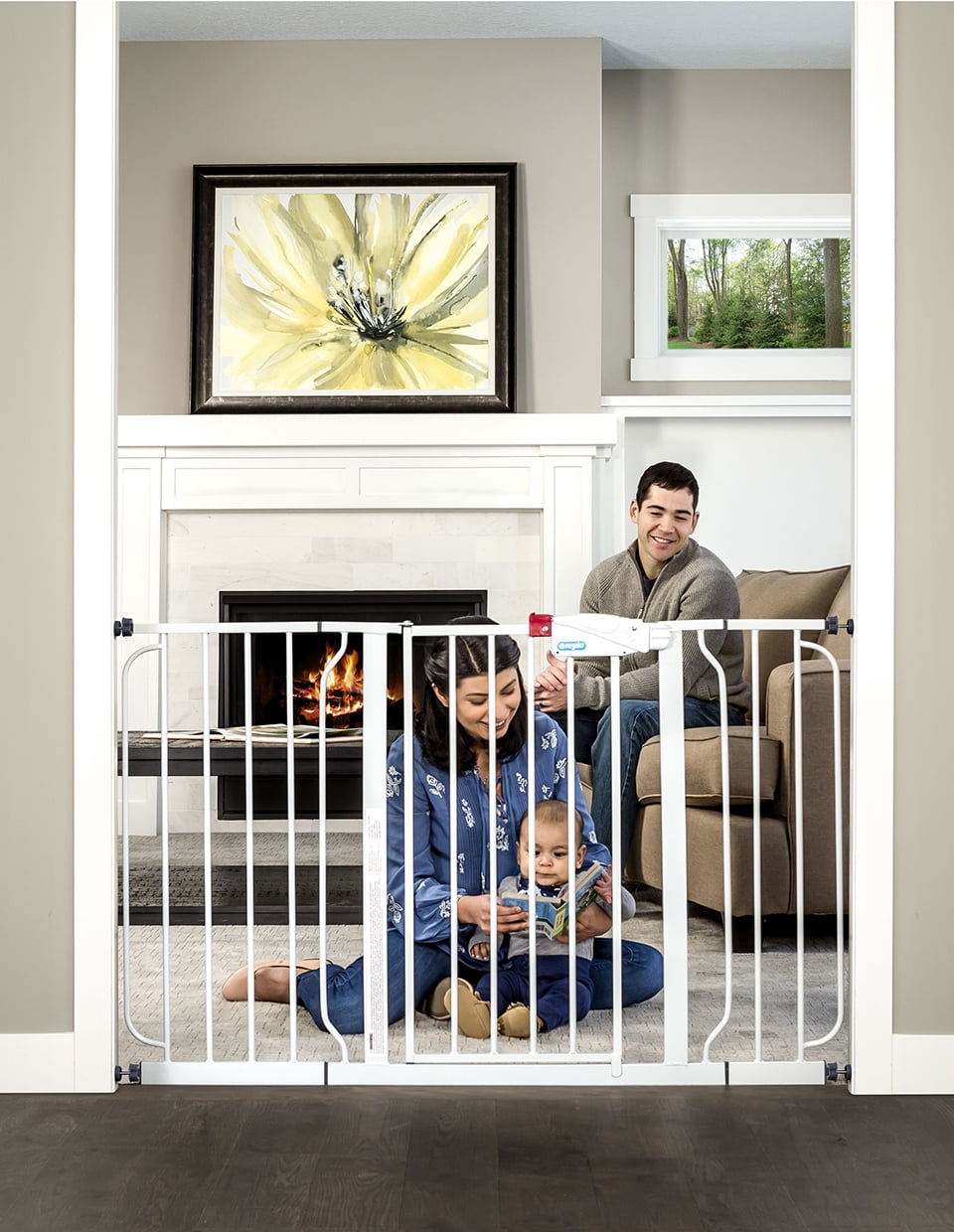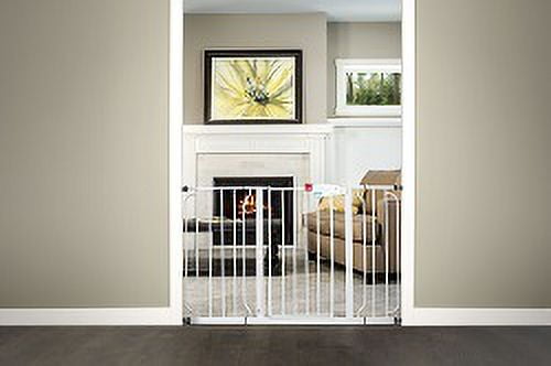 Regalo Easy Step 49-Inch Extra Wide Baby Gate, Includes 4-Inch and 12-Inch Extension Kit, 4 Pack of Pressure Mount Kit and 4 Pack of Wall Mount Kit: EXTRA WIDE: Expands to fit openings between 29-38 and 42-49 inches wide. Stands 30 inches tall. Please be sure measure your opening prior to purchase to ensure proper fit EASY TO USE AND SET UP: Pressure mount design that is quick to set up. Please note, before installation there will be a gap between the gate latch and the frame which is NOT a defect and it is NOT bent. This gap will be eliminated once installed ADJUSTABLE: Includes a 4-inch wide and 12-inch wide extension kit and 4 pressure mount spindle rods. Perfect for doorway, hallway and bottom of stair use. Gate can quickly be removed out of the opening for easy storage. Additional extensions sold separately DURABLE AND CONVENIENT: The all-steel design is durable and convenient with a walk-through door. Certified to both JPMA and ASTM standards SAFETY: Includes multiple safety-lock features, four wall cups for added security and mounting hardware. Perfect for children 6-24 months. Great for PETS TOO Easy to use lever handle features a one-touch release safety lock Sturdy and all-metal frame Regalo Easy Step 49-Inch Extra Wide Baby Gate, Includes 4-Inch and 12-Inch Extension Kit, 4 Pack of Pressure Mount Kit and 4 Pack of Wall Mount Kit, Black: EXTRA WIDE: Expands to fit openings between 29-38 and 42-49 inches wide. Stands 30 inches tall. Please be sure measure your opening prior to purchase to ensure proper fit EASY TO USE AND SET UP: Pressure mount design that is quick to set up. Please note, before installation there will be a gap between the gate latch and the frame which is NOT a defect and it is NOT bent. This gap will be eliminated once installed ADJUSTABLE: Includes a 4-inch wide and 12-inch wide extension kit and 4 pressure mount spindle rods. Perfect for doorway, hallway and bottom of stair use. Gate can quickly be removed out of the opening for easy storage. Additional extensions sold separately DURABLE AND CONVENIENT: The all-steel design is durable and convenient with a walk-through door. Certified to both JPMA and ASTM standards SAFETY: Includes multiple safety-lock features, four wall cups for added security and mounting hardware. Perfect for children 6-24 months. Great for PETS TOO Easy to use lever handle features a one-touch release safety lock Sturdy and all-metal frame