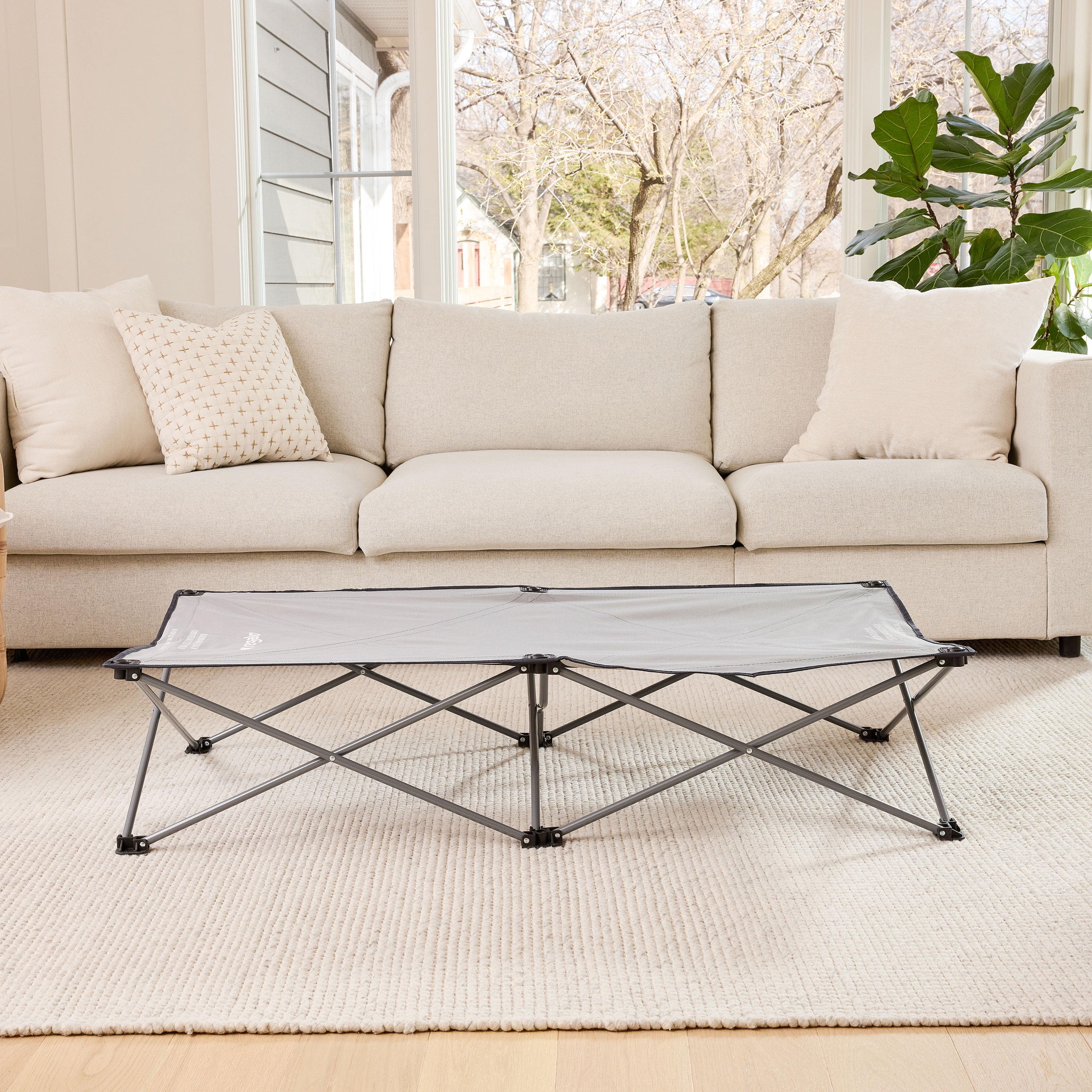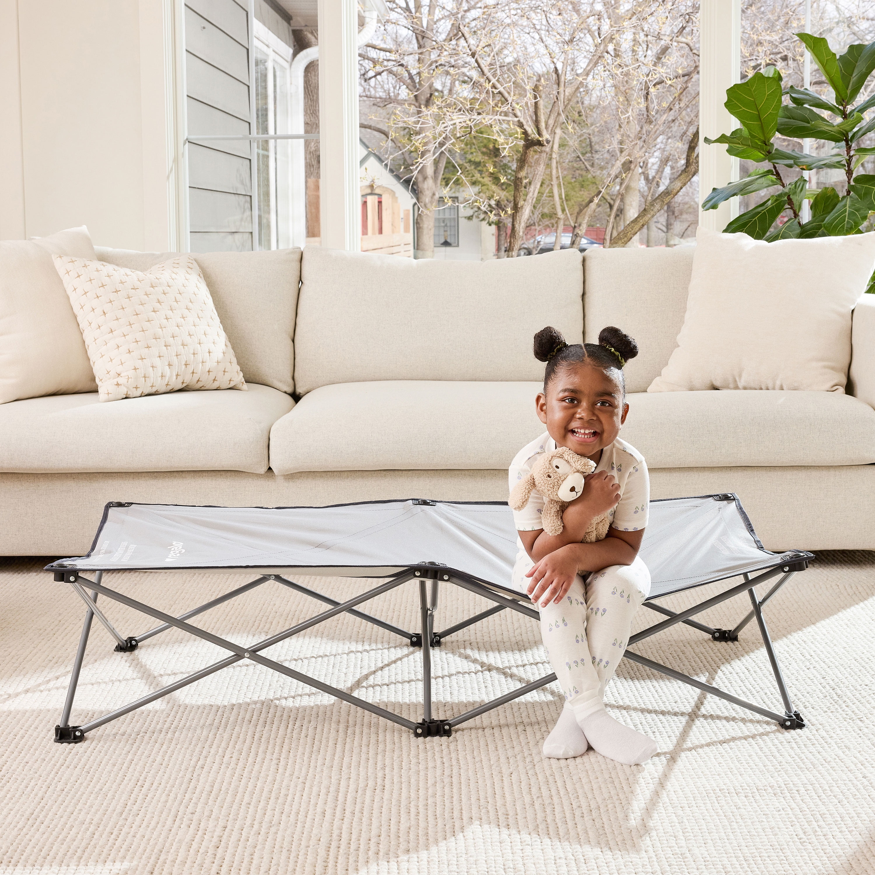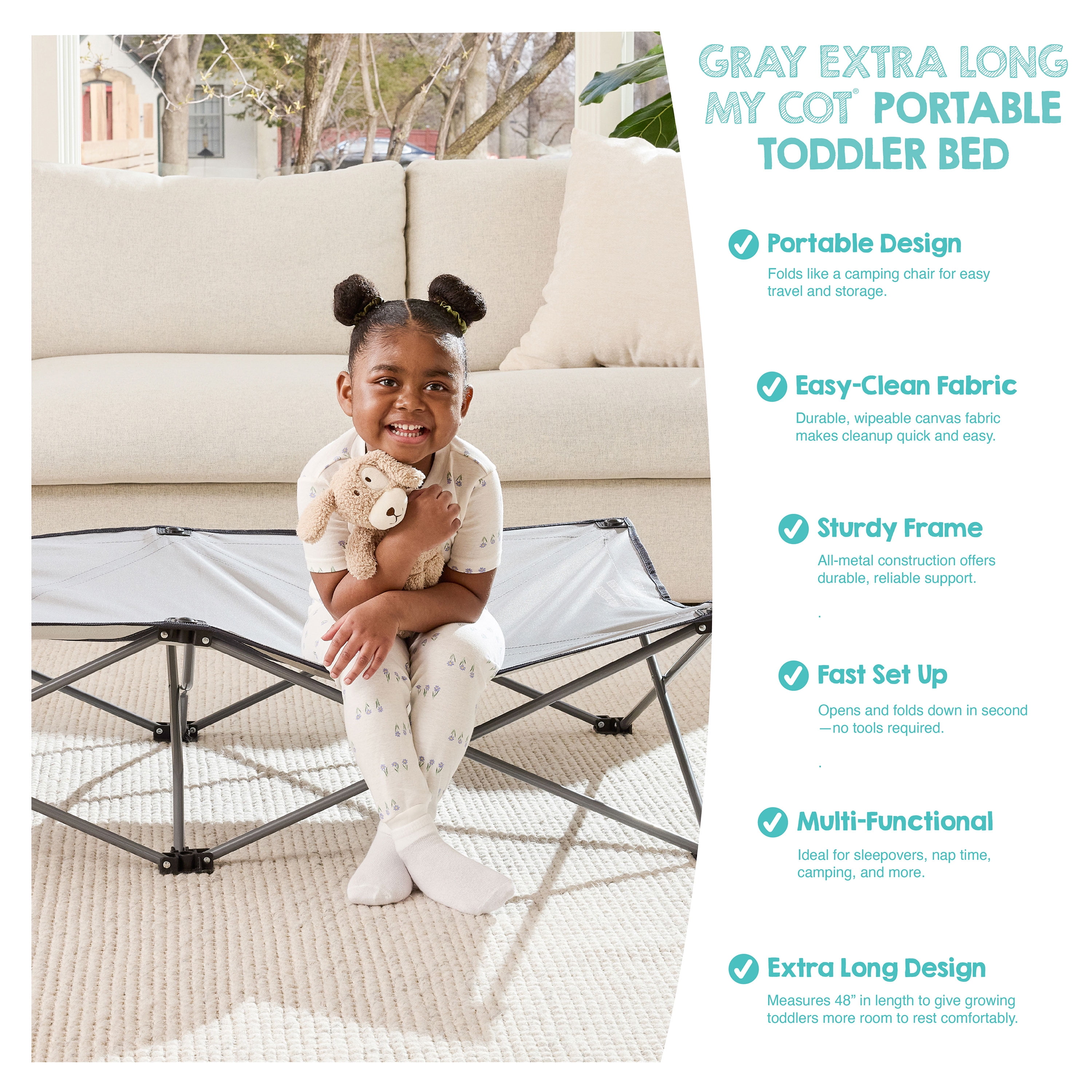 The Regalo Gray Extra-Long My Cot Portable Toddler Bed is a multi-functional cot for your little one who needs a safe, comfortable place to rest. An essential item for travel, sleepovers, nap time, picnics, and camping, the My Cot was designed for portability. The extra-long My Cot comes in at 54 inches long and can hold children up to 80 pounds, making it ideal for children 2-8 years old. Made of an all-steel construction, the versatile cot is built with durability, safety, and convenience in mind.
