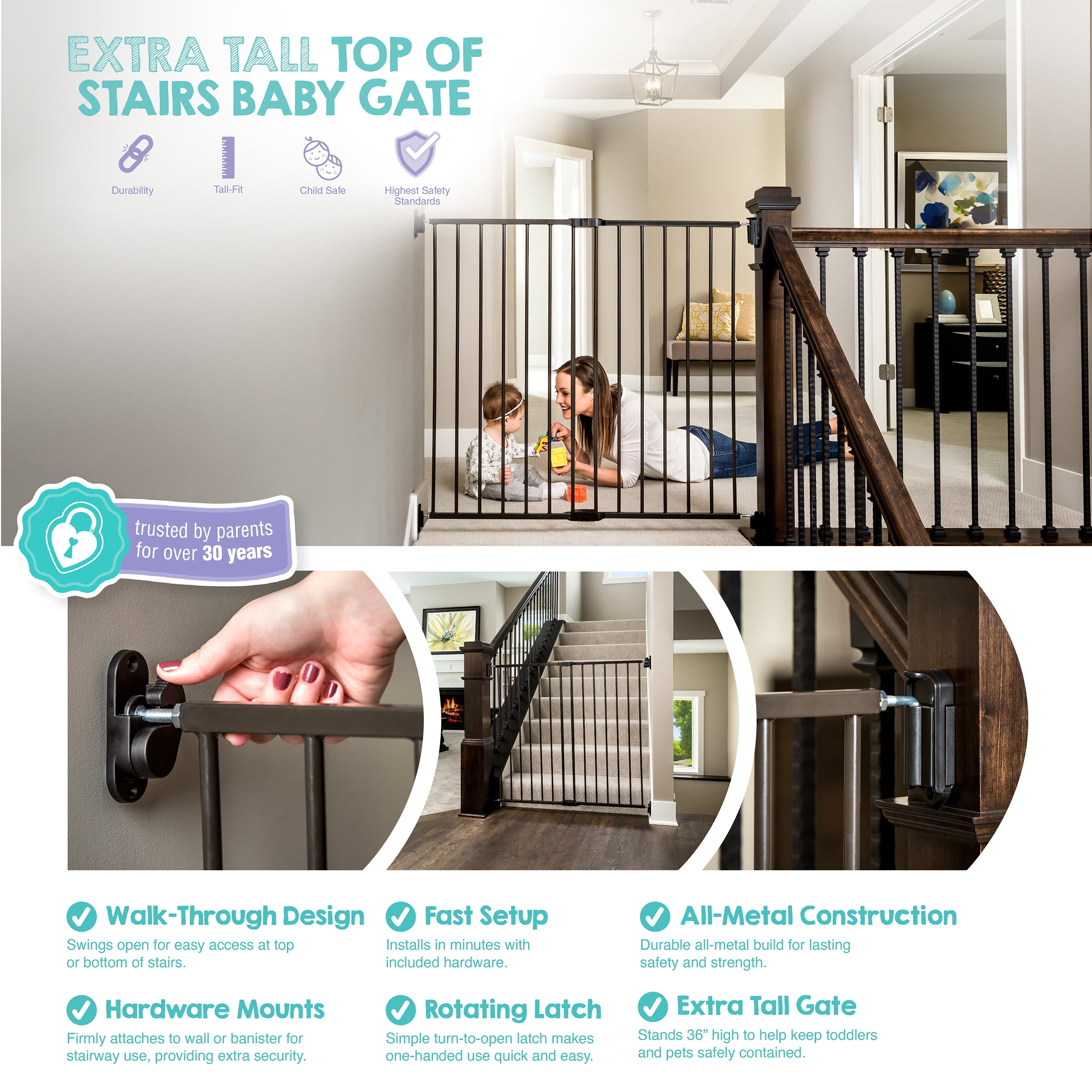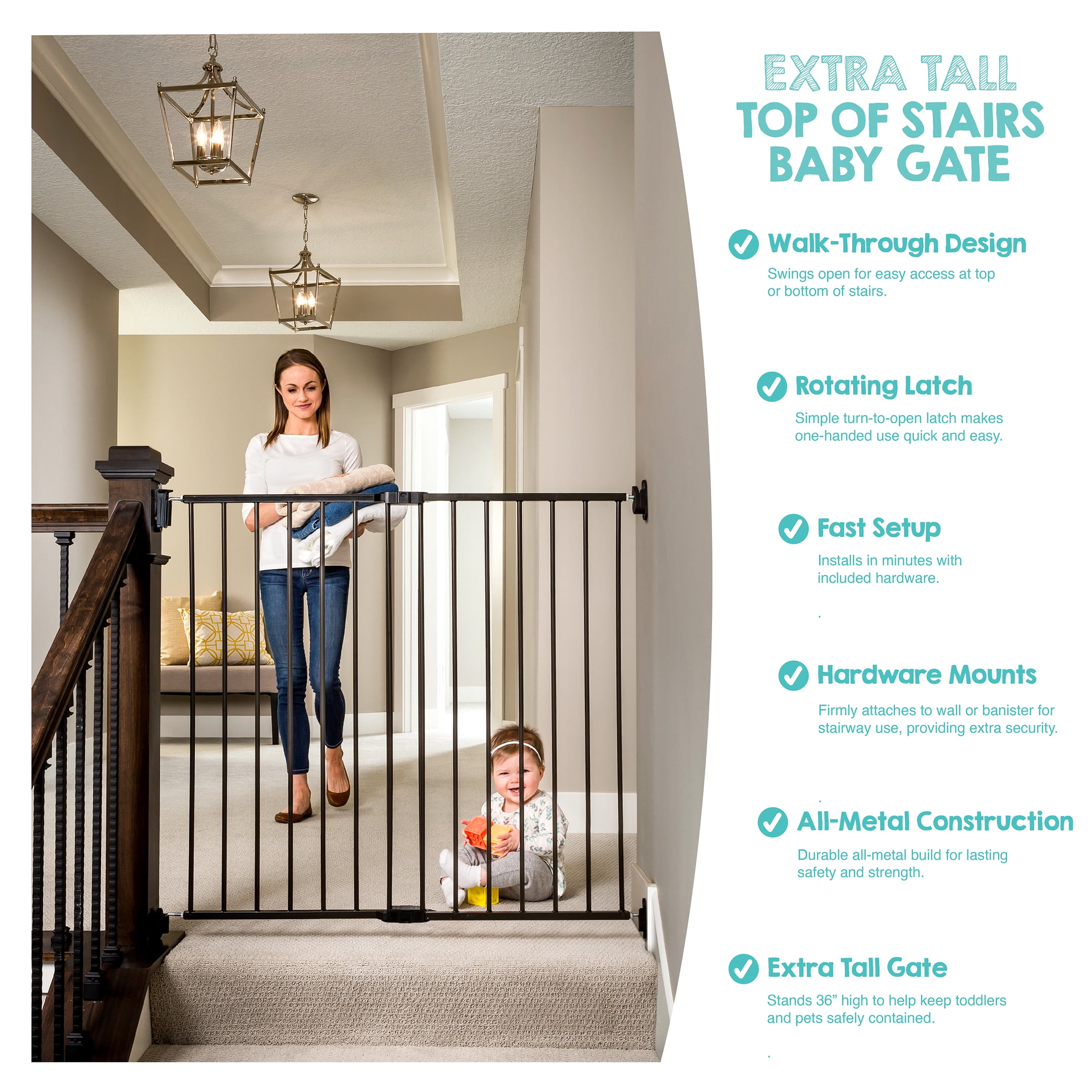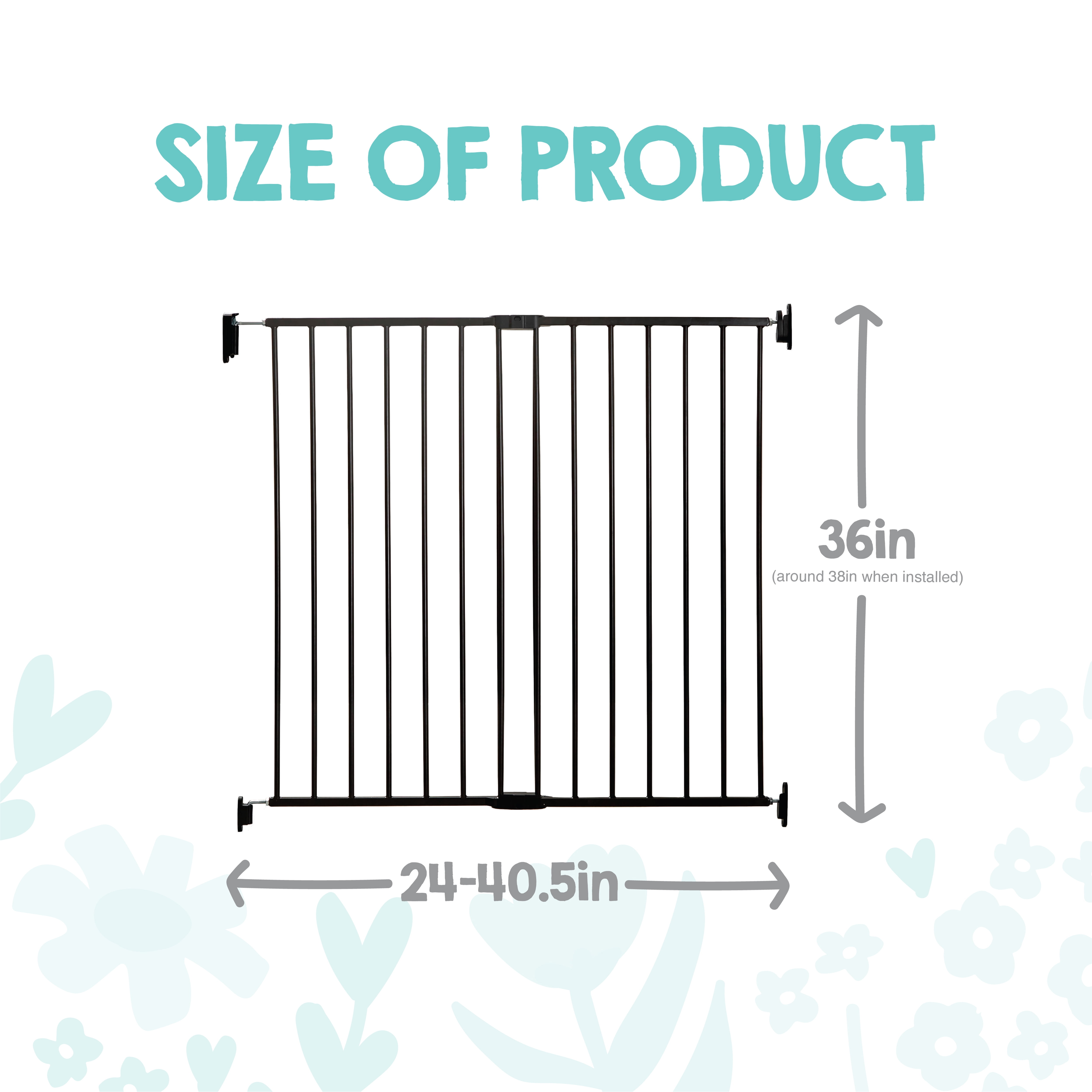 Expands to fit openings between 24”-40.5” · Stands 38” tall · Easy rotating latch allows you to open the gate · Convenient walk through design · Hardware to mount to wall included · Gate must be mounted at least 6” back from the front edge of the stair