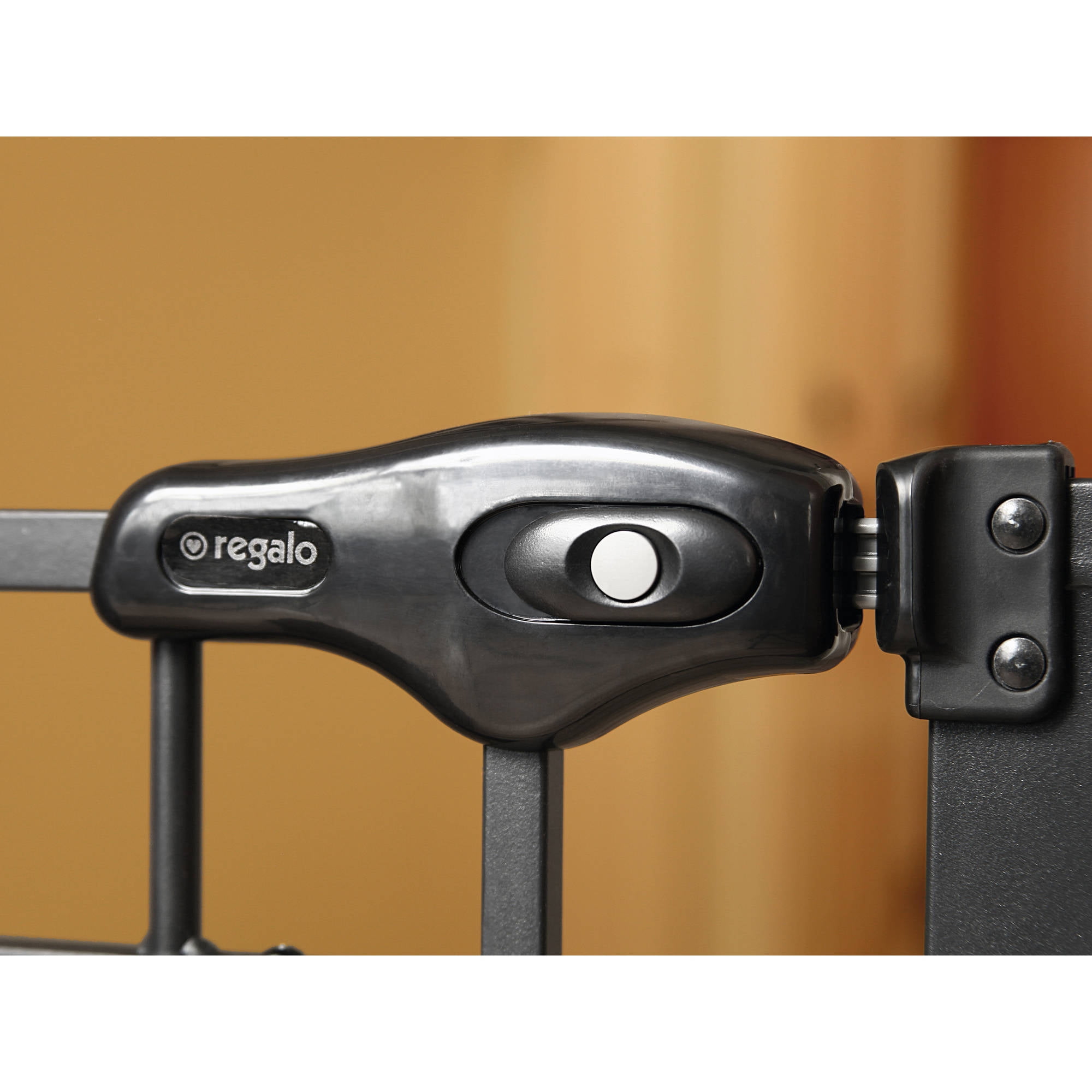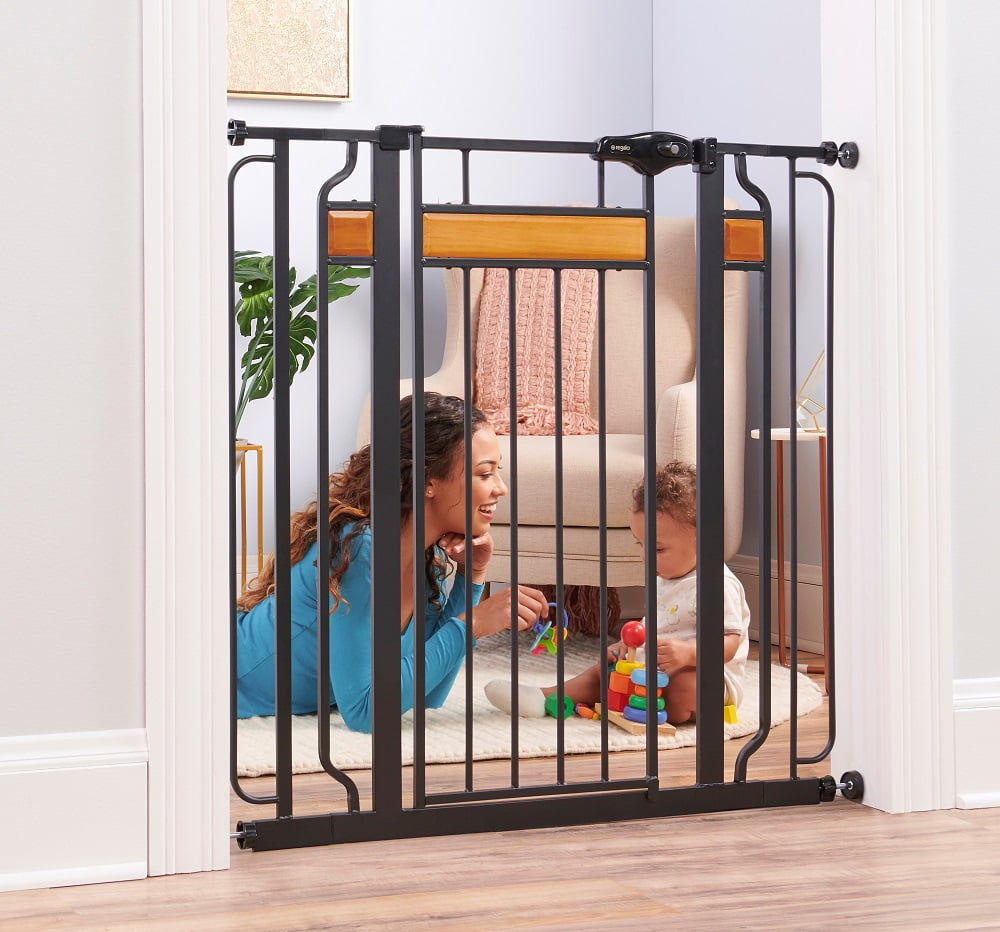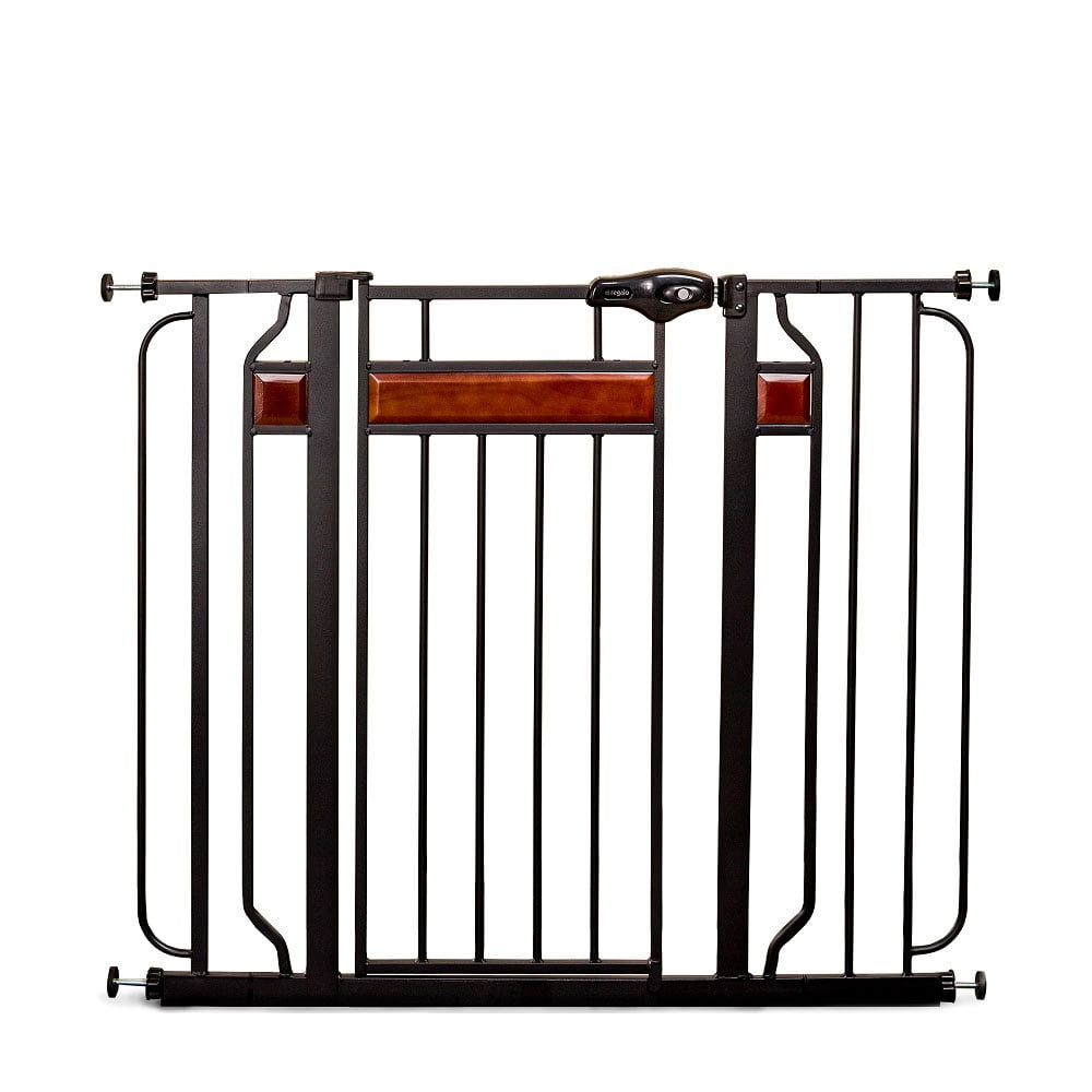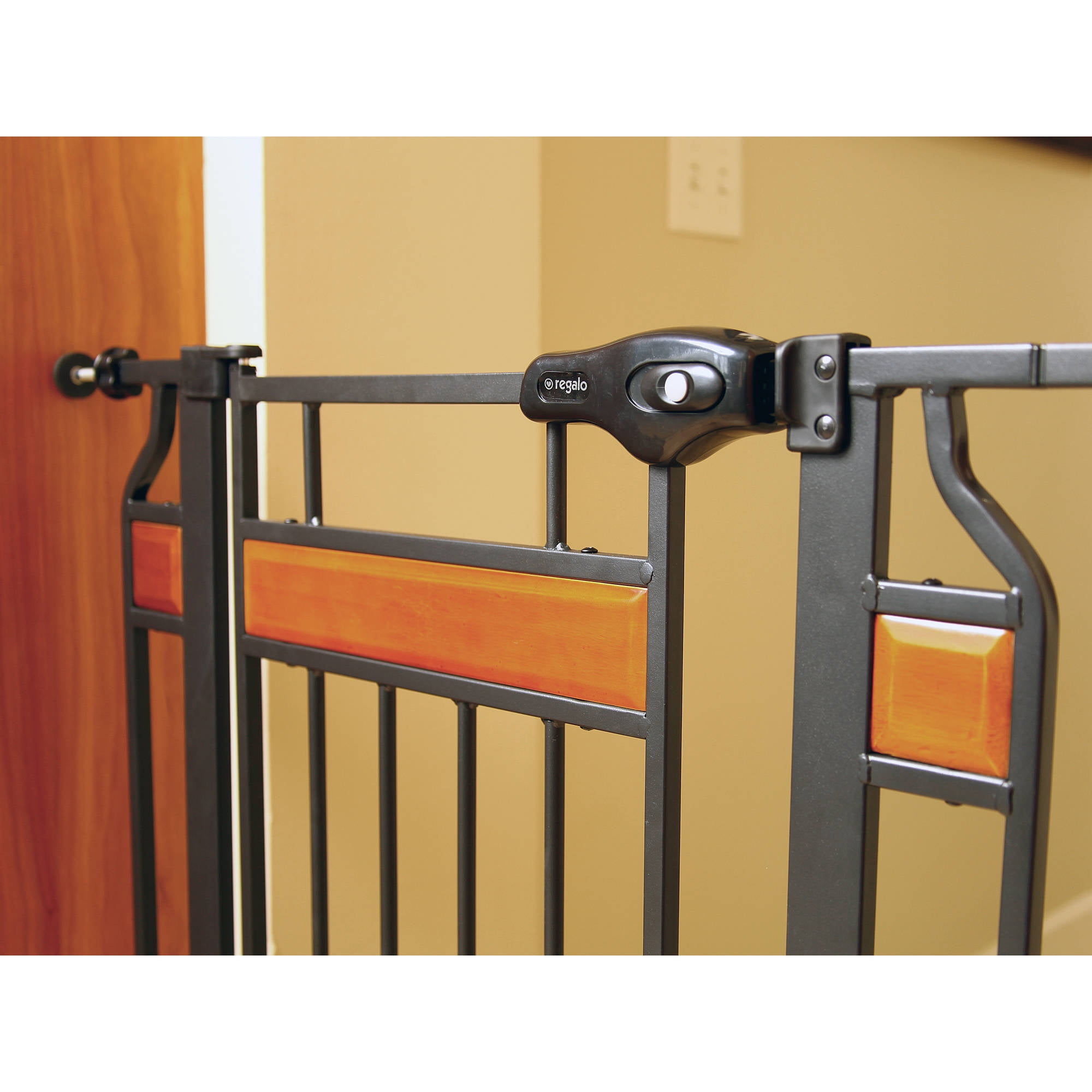 The Regalo Home Accents Extra-Tall Gate with New Zealand Pine Wood is perfect to fit a variety of openings in your home. This gate covers openings 29 to 41.5 inches wide and stands 38 inches tall. It includes four-inch and six-inch wide extension kits. The adjustable pressure-mounting system makes installation quick and easy. When your hands are full, the convenient “Easy Close” handle lets you simply push the gate closed, making your job a little easier. Also, the “Easy Close” handle comes equipped with a safety-locking feature. The steel and New Zealand pine wood construction makes this gate durable and sturdy. This safety gate is the perfect combination of function and fashion. It’s PVC free and has been certified by the Juvenile Products Manufacturers Association (JPMA). It also meets the safety standards set by the American Society for Testing and Materials (ASTM). It’s great for pets, too!