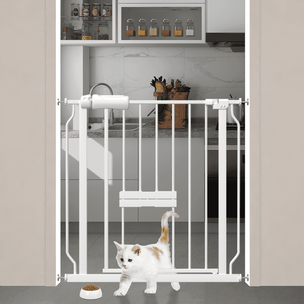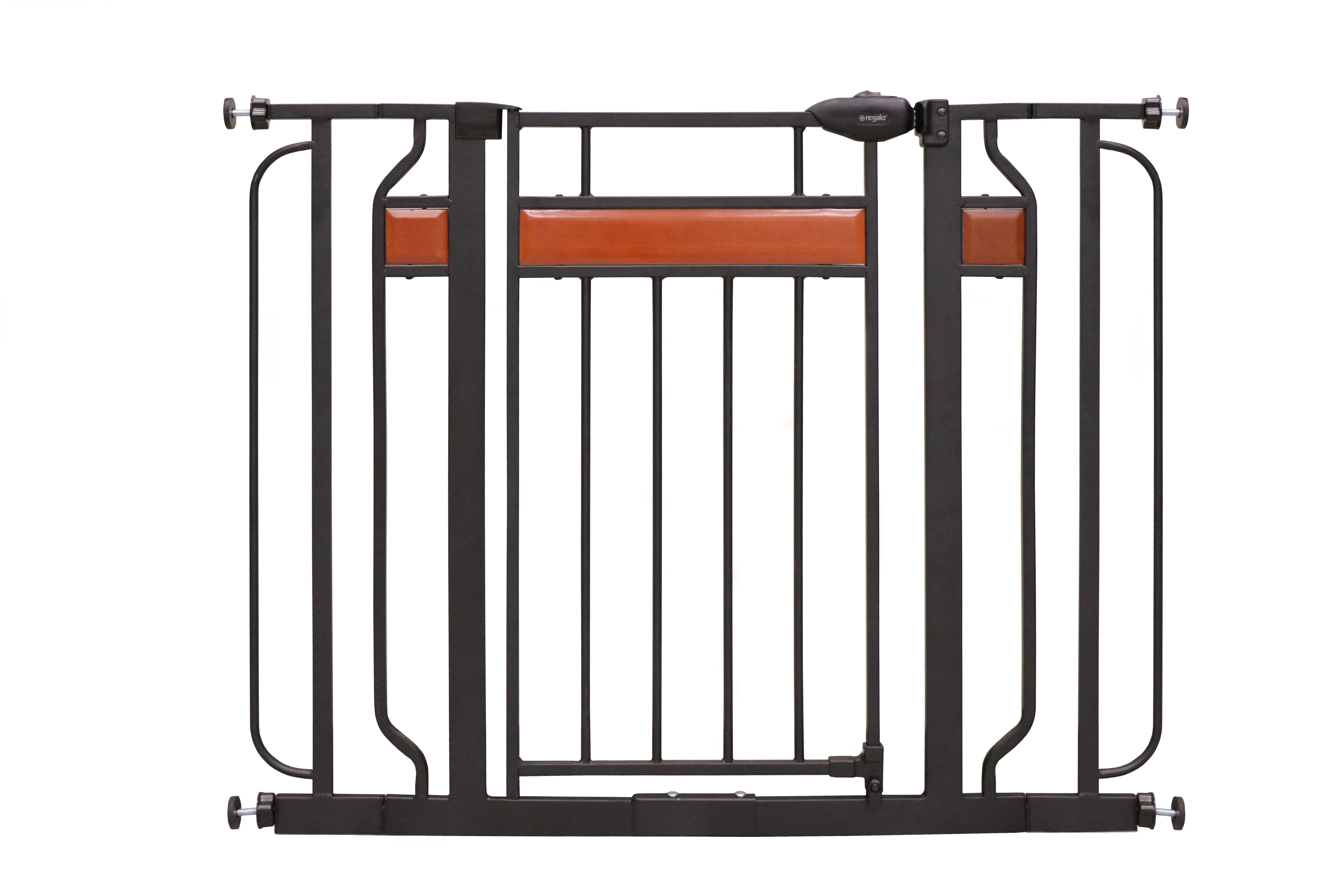EXTRA WIDE: Stands 30-inches tall and expands to fit openings 30 to 42 inches wide DÉCOR: Fashioned with high-end finishing and New Zealand Pine. Sturdy, all metal frame SET UP: Install according to manufacturer’s instructions. You must use wall cups to keep gate in place. To prevent falls, never use at top of stairs. FIT: Perfect for hallway, doorway, and bottom of stairs. Includes 4-inch and 4-inch wide extension kits. SAFETY: Designed with safety-lock, meets all safety standard. Hardware mount for added security. Perfect for children 6-24 months. Great for PETS TOO!
