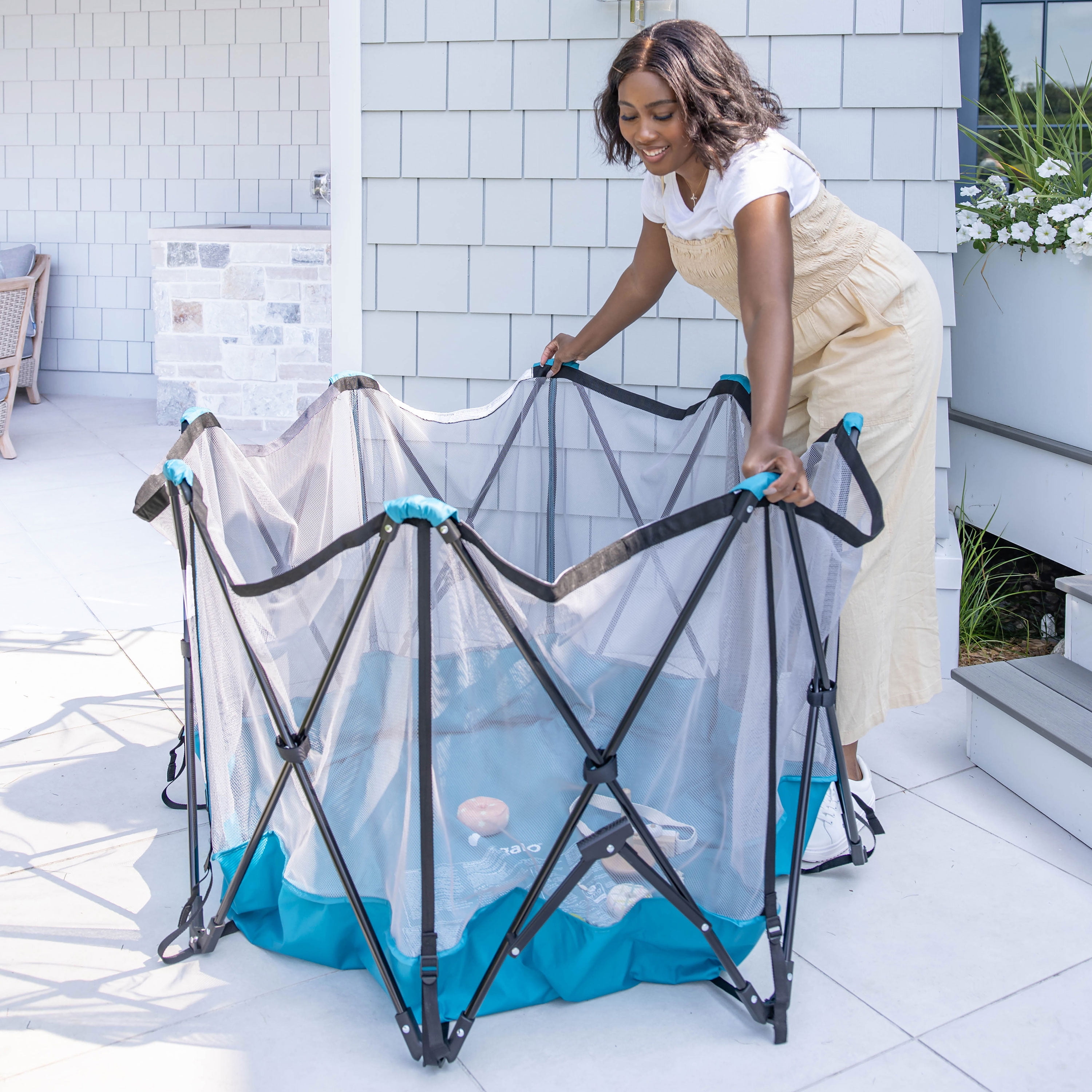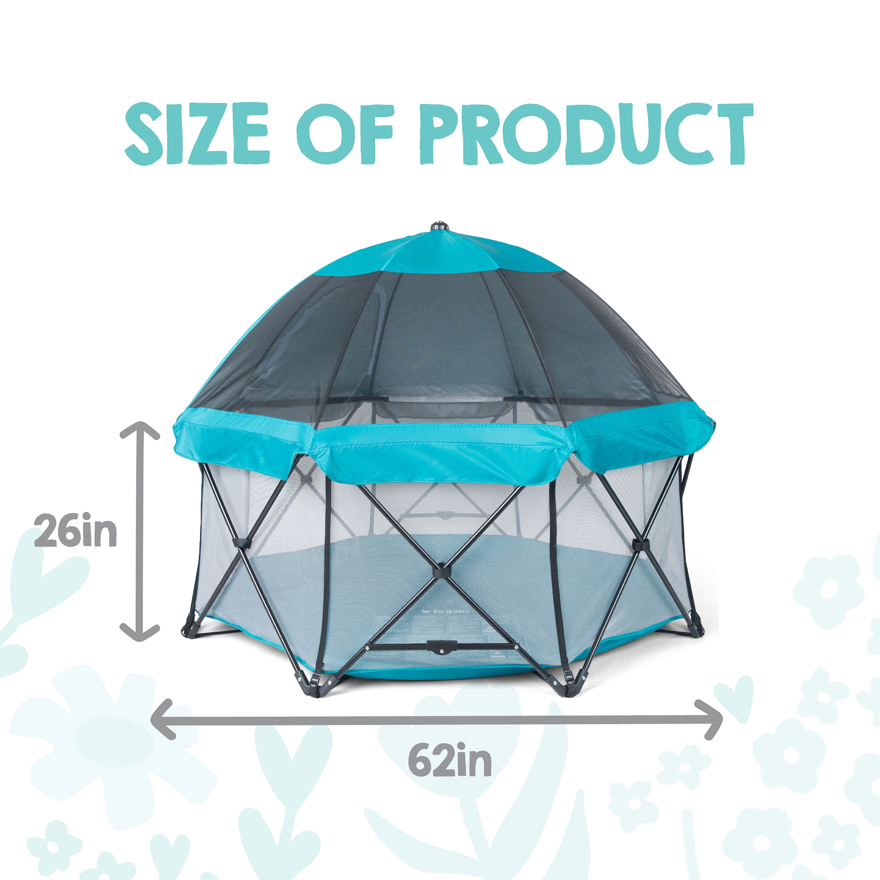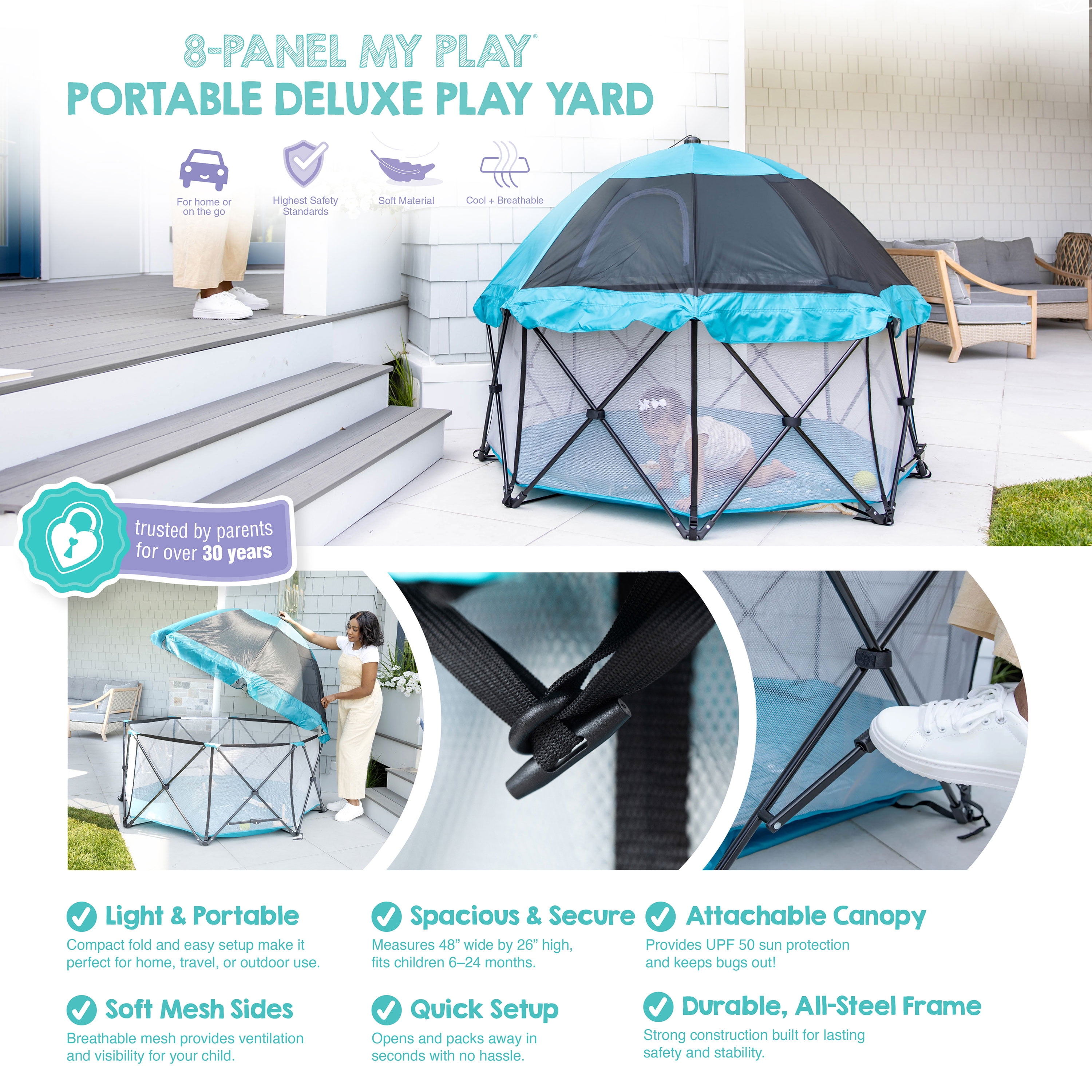 PERFECT FIT: The nylon bottom provides protection from rough surfaces. The My Play Deluxe 8-panel measures 62 inches wide and 26 inches tall. Patented easy fit, one-time adjustment system. FULL COVERAGE CANOPY: Full ventilating mosquito mesh on one side and a UV protected polyester on the other it creates a safe and shaded play area. Fold and go design for easy use and storage. PORTABLE INDOOR/OUTDOOR AND LIGHTWEIGHT: Designed with a simple fold and go deign. Easy to set up and take down within seconds. Water resistant for indoor and outdoor use. EASY CLEAN: Designed with a ventilating mesh walls and a nylon bottom for easy clean up. Simply hand wash and wipe down with a damp cloth and soap to keep it fresh and sanitary. SAFETY: Made with an all-steel frame and reinforced stitching. Includes safety-lock feature and meets all safety standard. Perfect for children 6-24 months. Great for pets too.