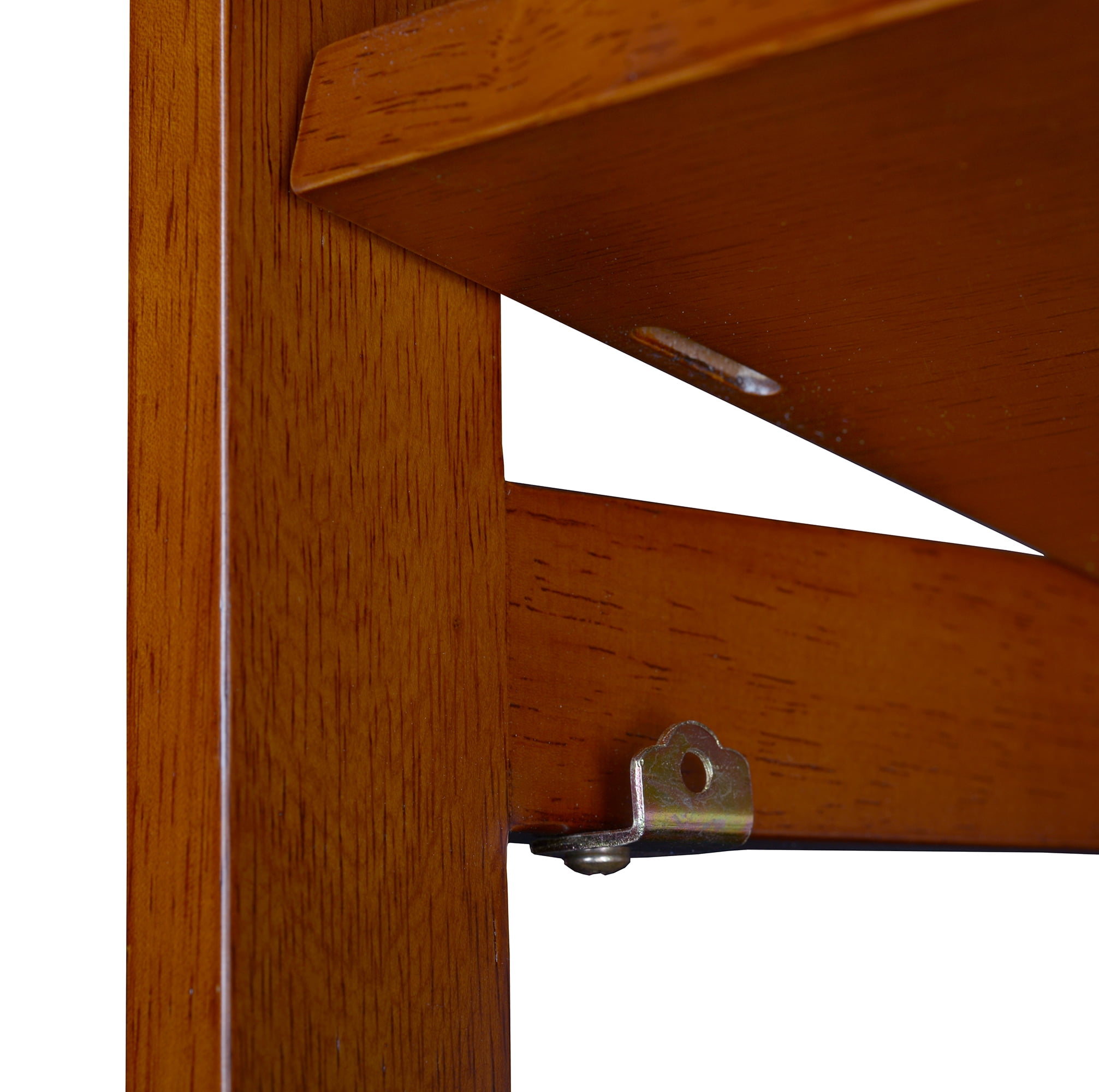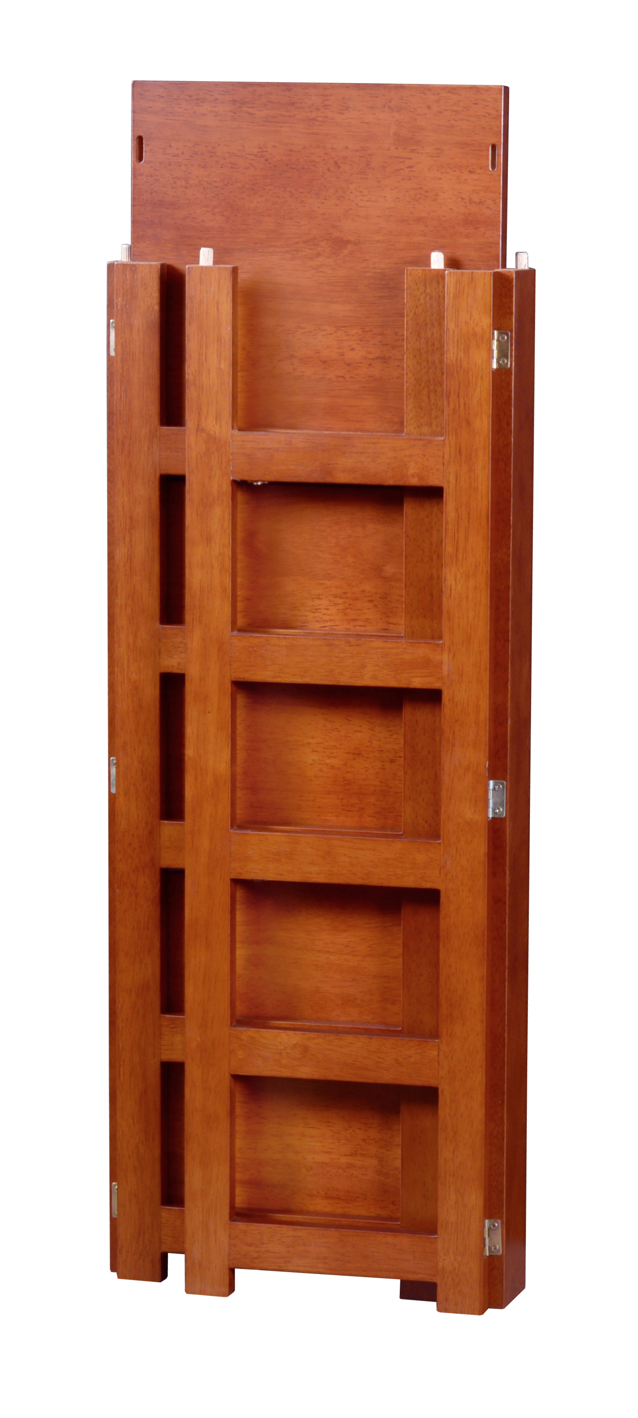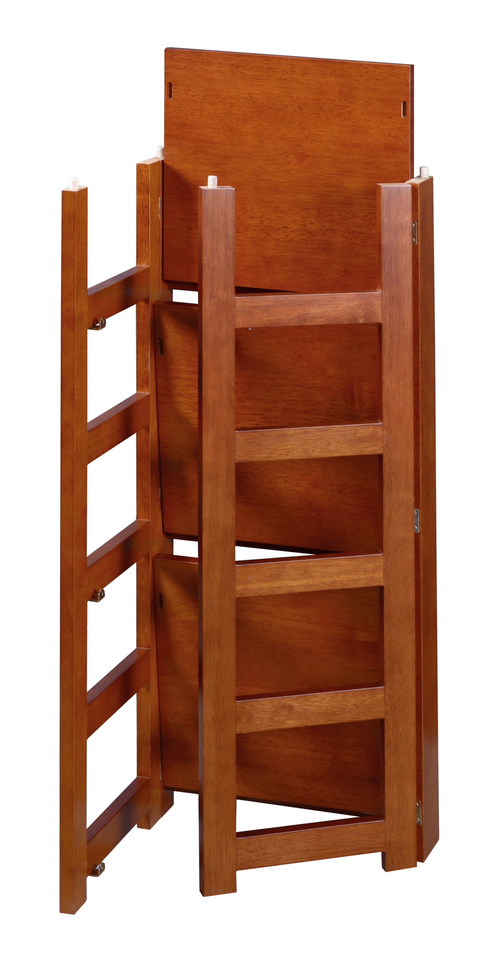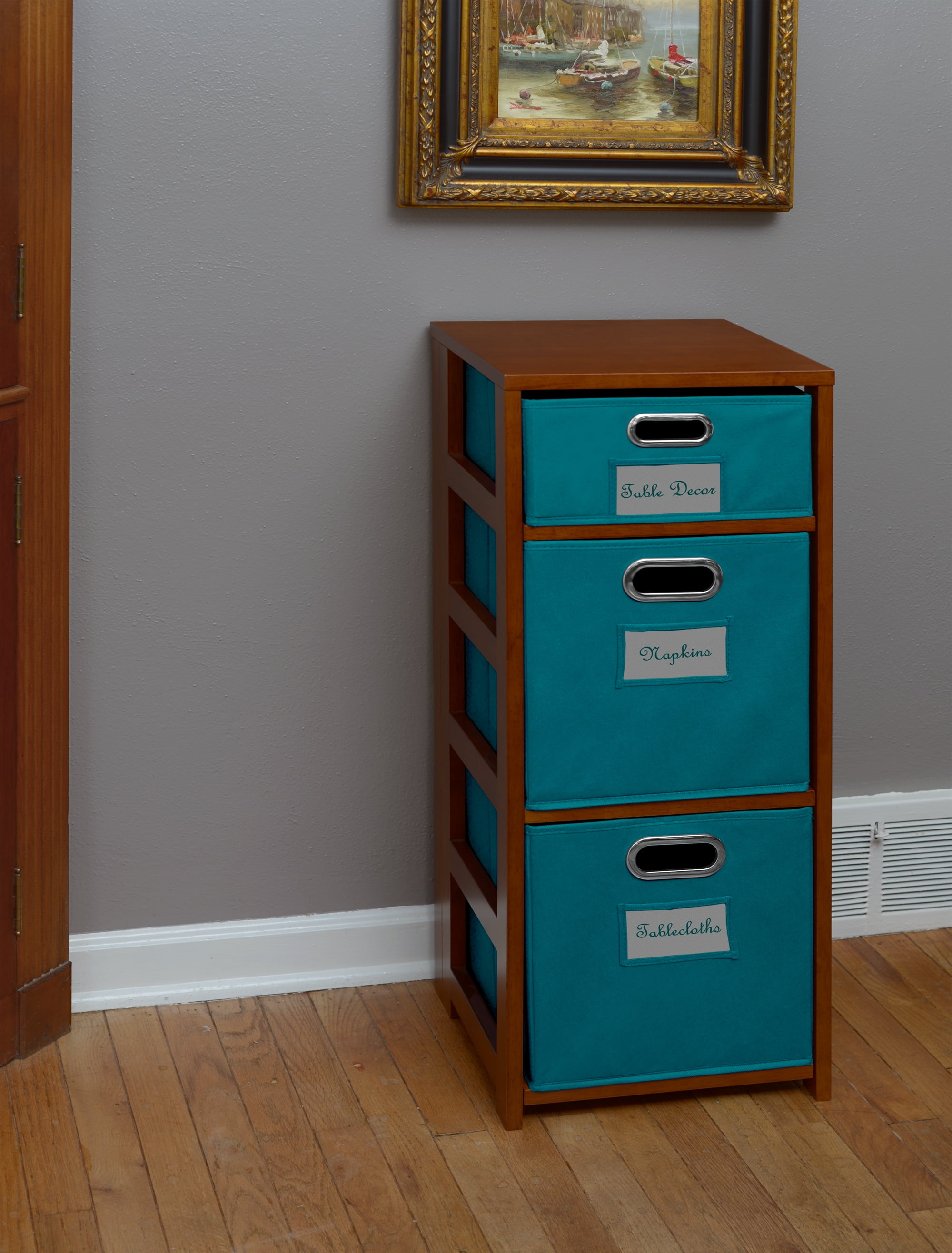 Both the entire bookcase and storage bins fold flat for easy transportation and storage Assembles without tools in less than 5 minutes 3 flip- down shelves, one fixed top shelves and 3 Foldable Fabric Bins sized perfectly for each shelf Solid hardwood frame with rich Cherry hand-rubbed veneer finish Teal Niche Foldable Fabric Bins include a clear label holder to easily identify contents and chrome handles for easy carrying