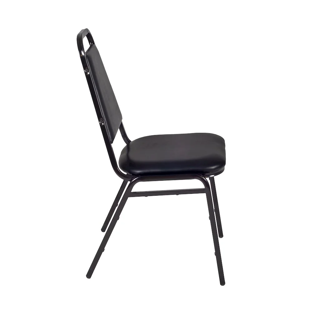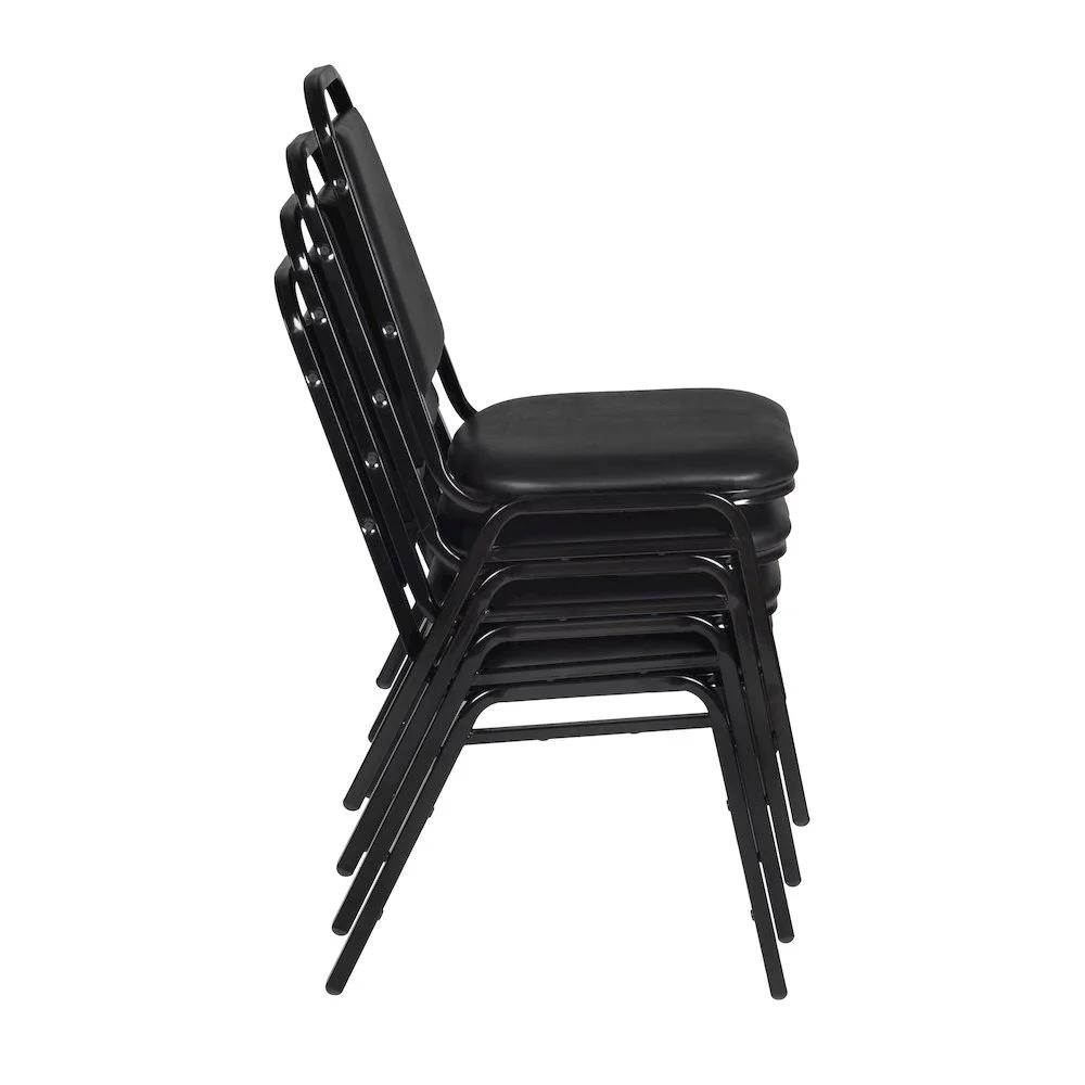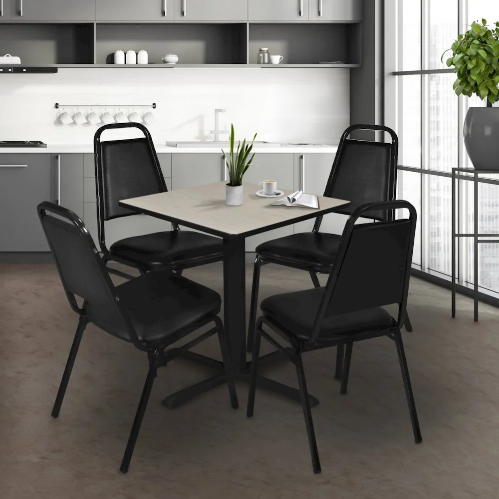 Versatile table & chair set includes one 30-inch square Cain table and 4 Restaurant Stack Chairs Tabletop is constructed of a 1-inch thick thermal fused melamine laminate finished with a black Bumper Edge edge banding Maple laminate tabletop is scratch, stain and scald resistant and wipes clean easily Restaurant stack chairs have a water-repellent black vinyl seat and back and a black metal frame with reinforced cross bracing Stack chairs can easily be stored away in stacks of 12 and are compatible with Regency’s Universal Stack Chair Cart
