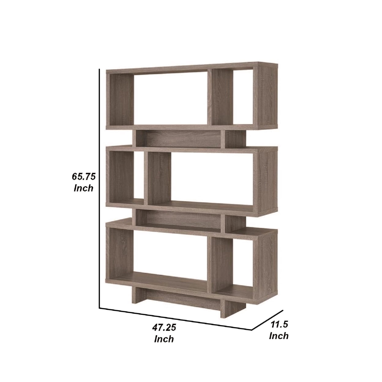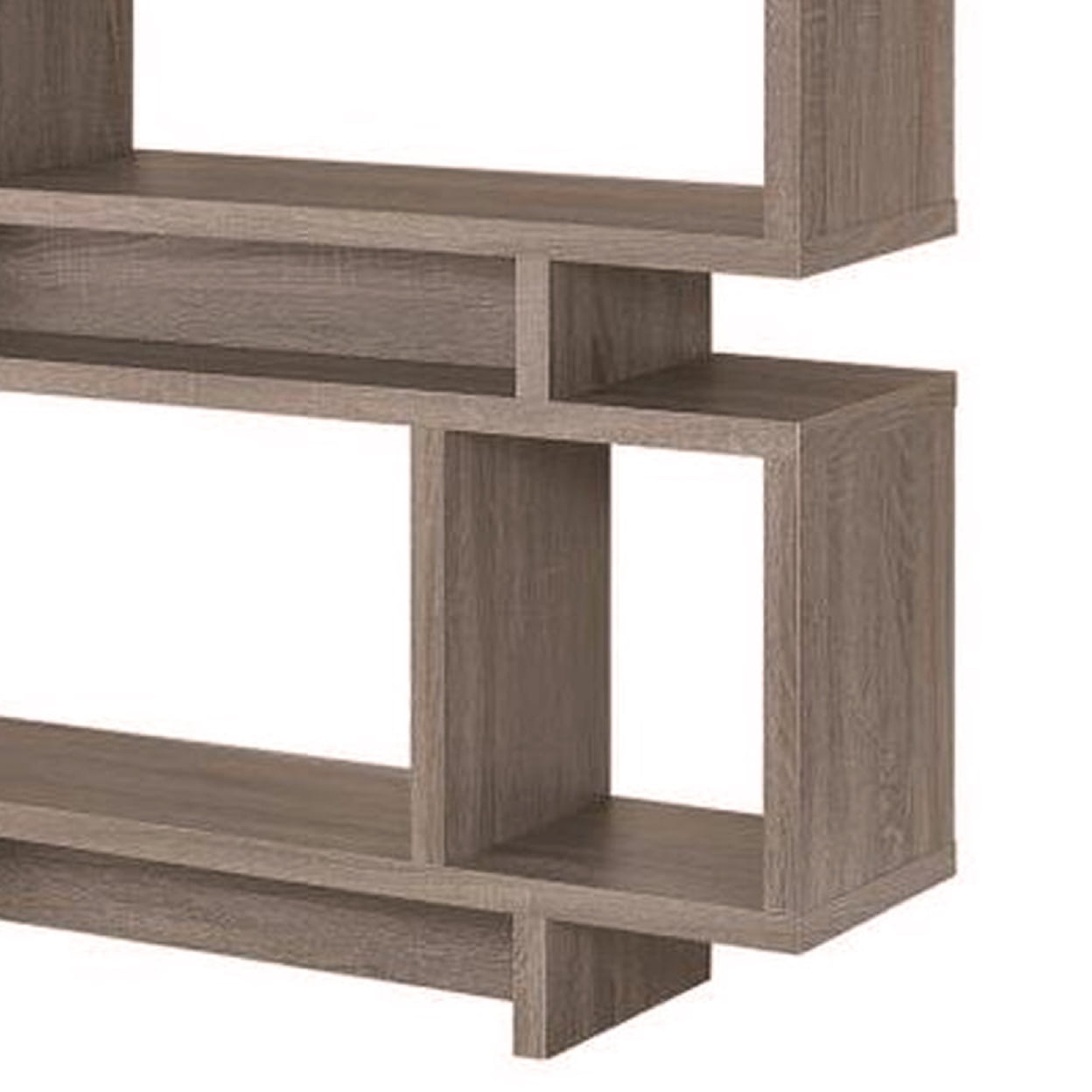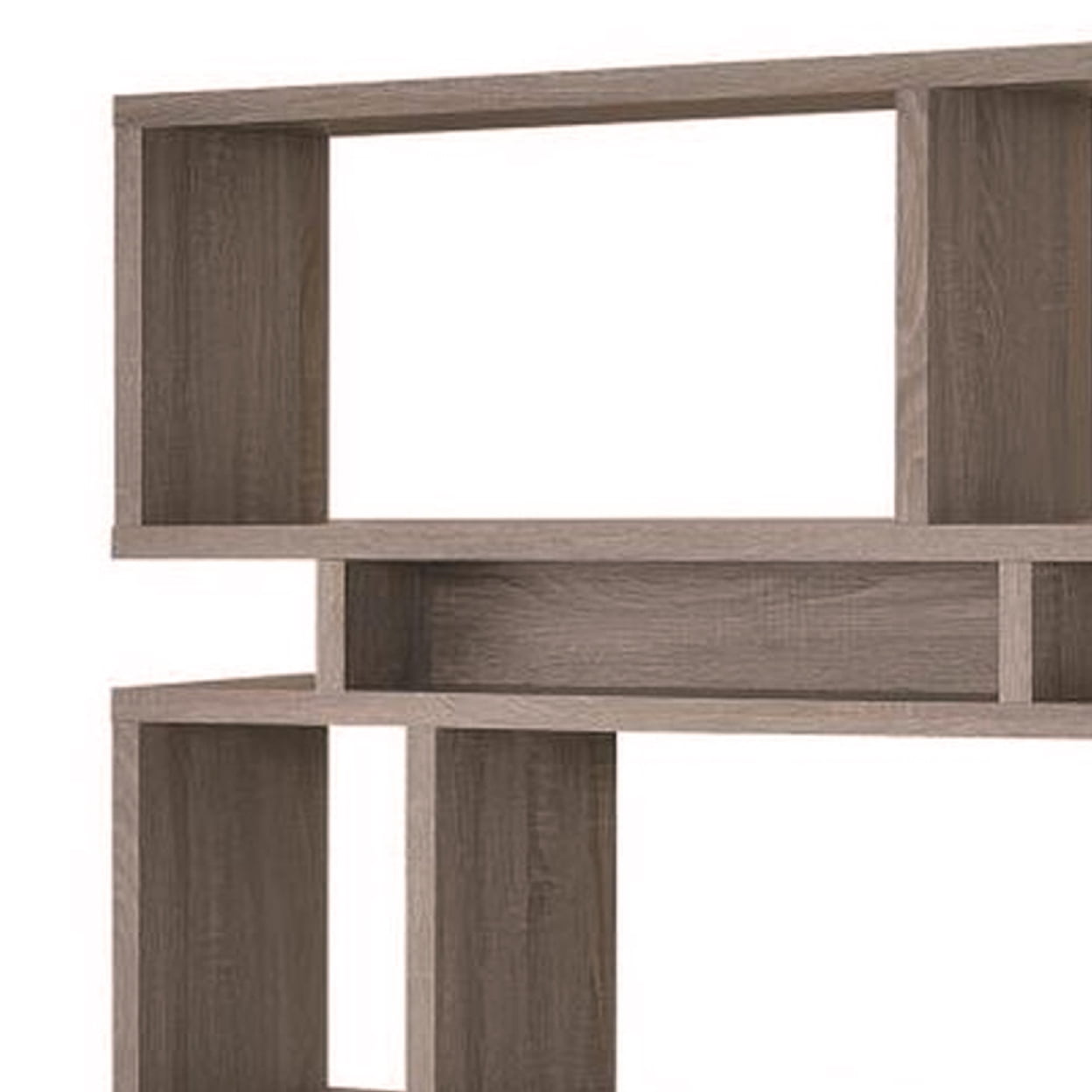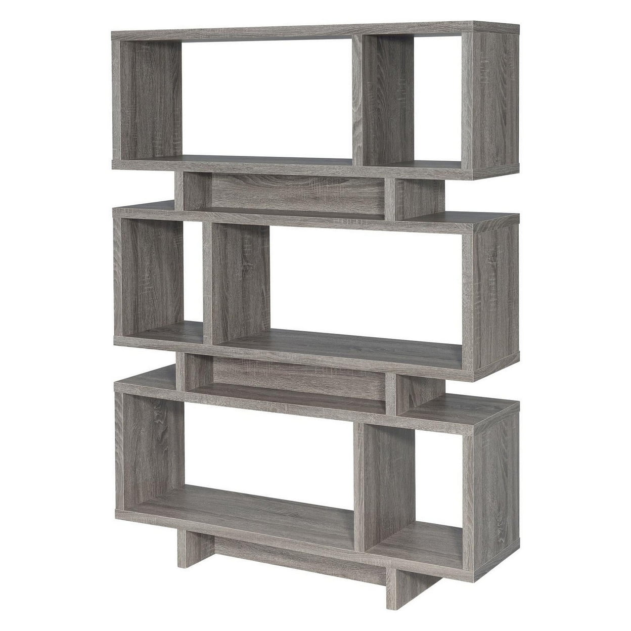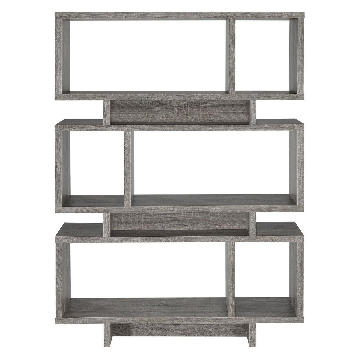 Weathered Grey finish The Grey bookshelf is backless Asymmetrical design Staggered shelves