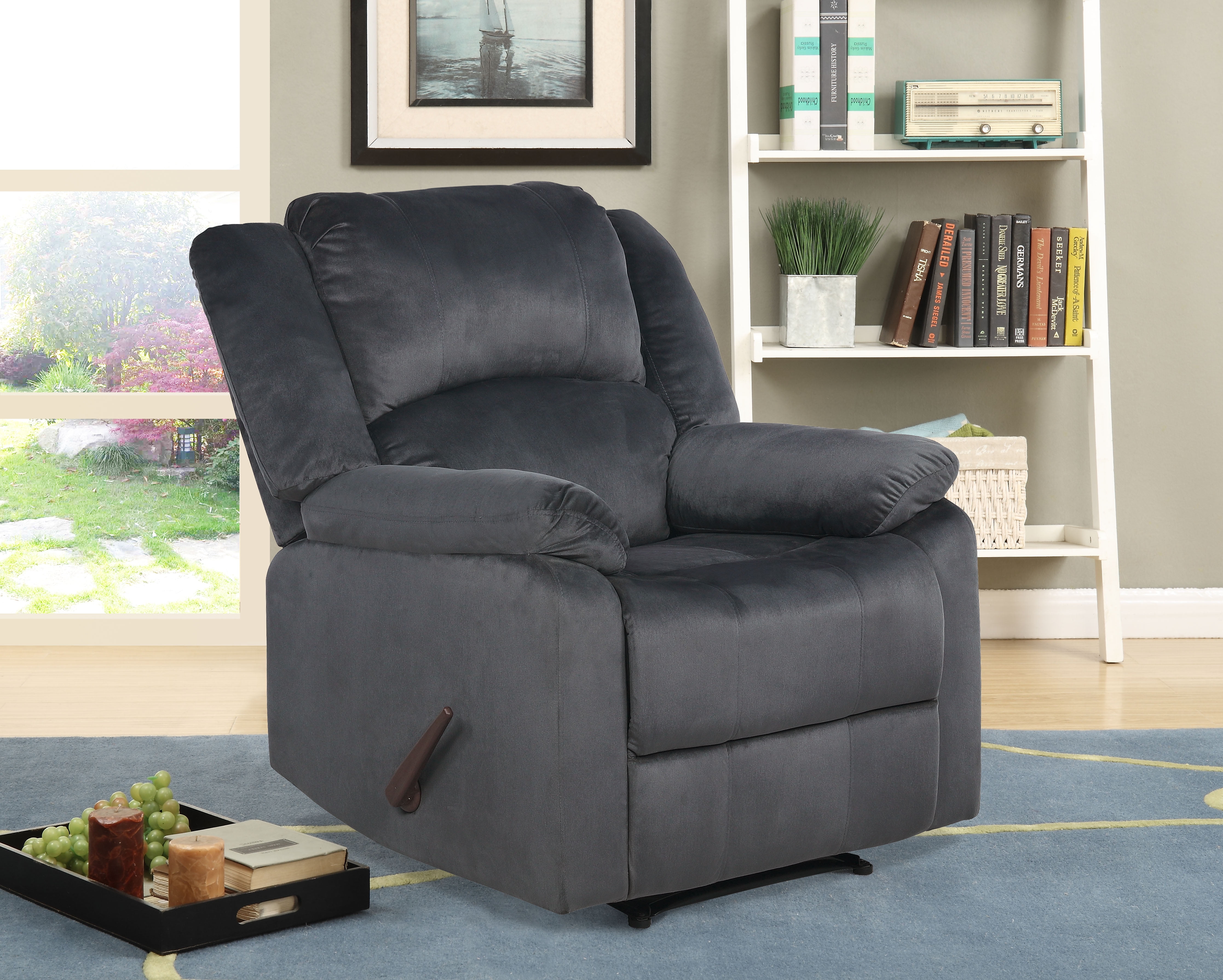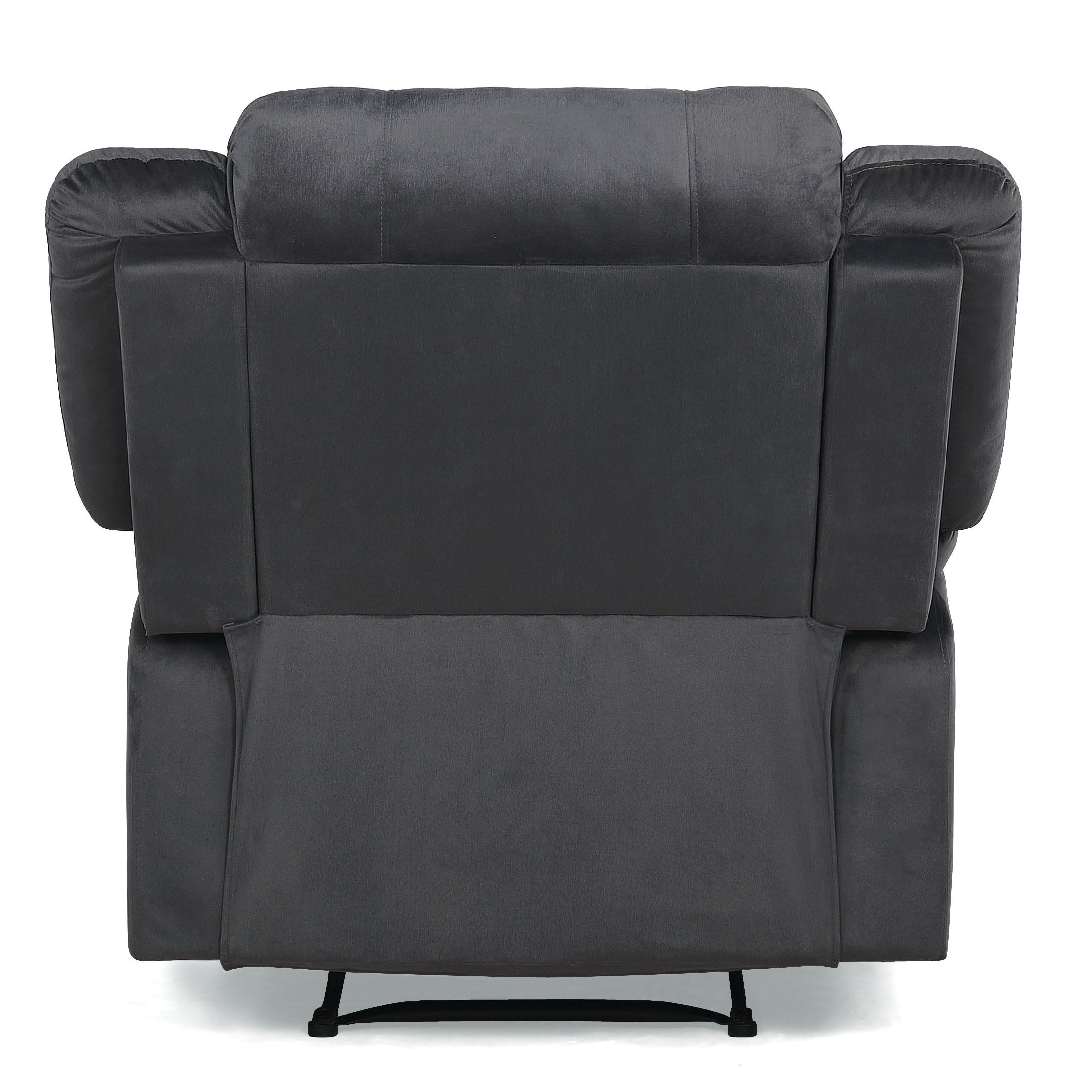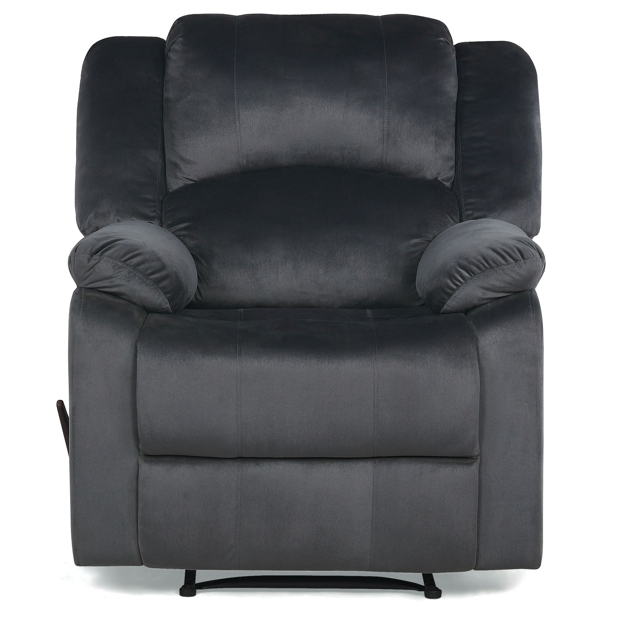 Manual one-seater recliner in luxurious, gray microfiber upholstery Solid hardwood frame provides durability and support Thick seat and back cushions packed with high-density foam for maximum comfort