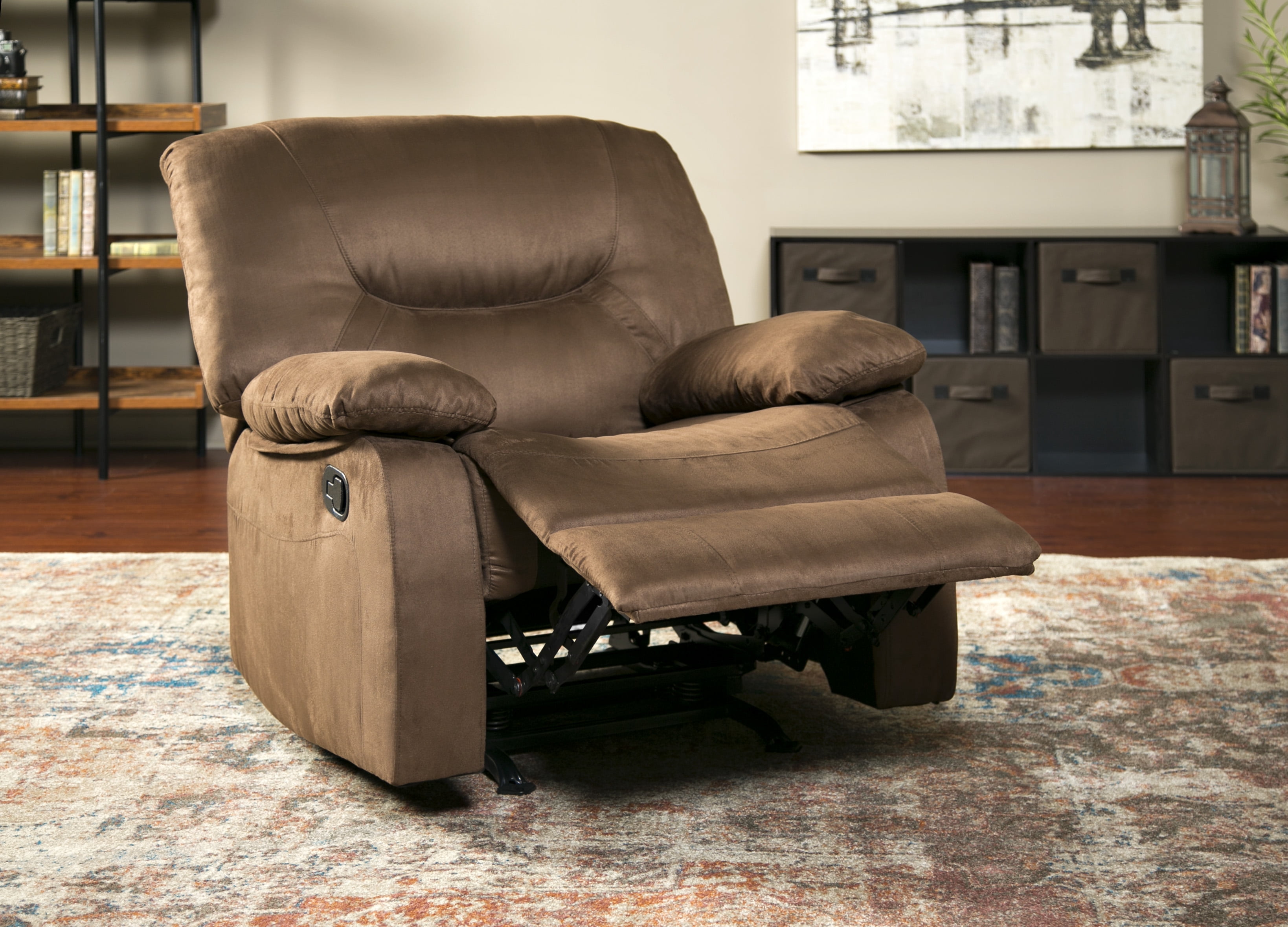 Form and function go hand in hand with the Relaxzen Rocker Recliner. This rocker recliner features sturdy wood and metal construction. Adorned with plush microfiber fabric, this recliner is easy to adjust. The ideal furnishing for dens, living rooms, man caves, and more, this recliner promises lasting comfort. Please select from our available color choices when placing your order.