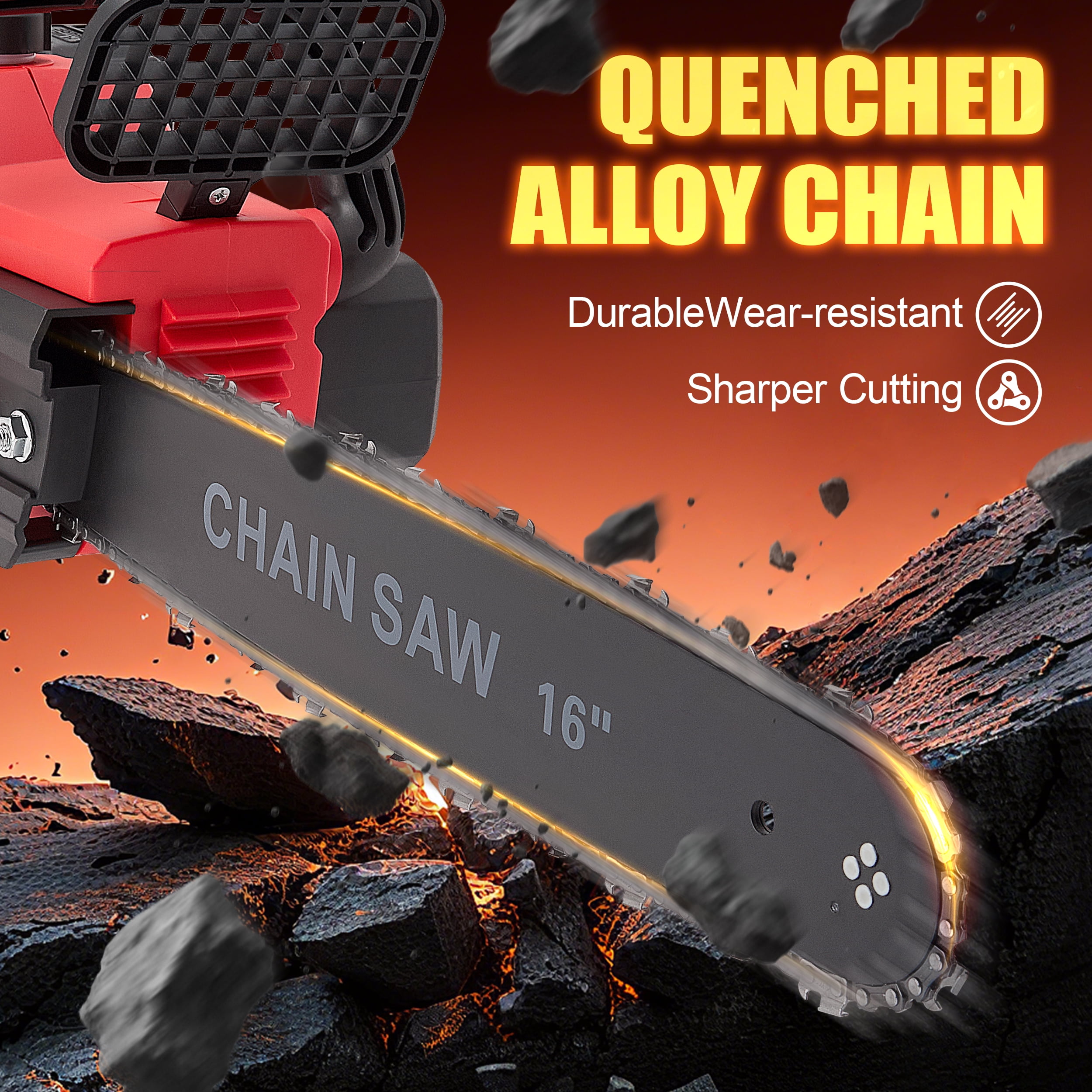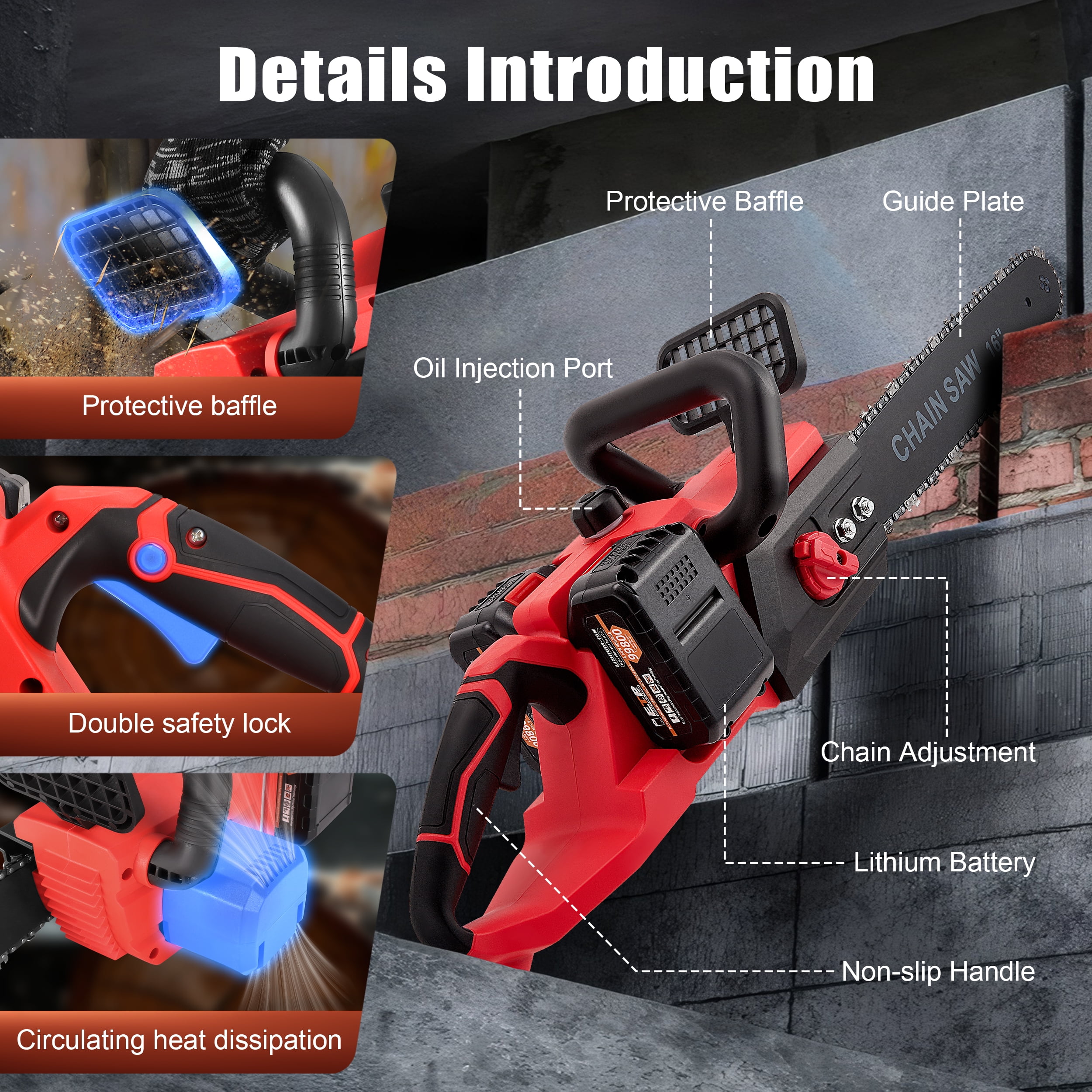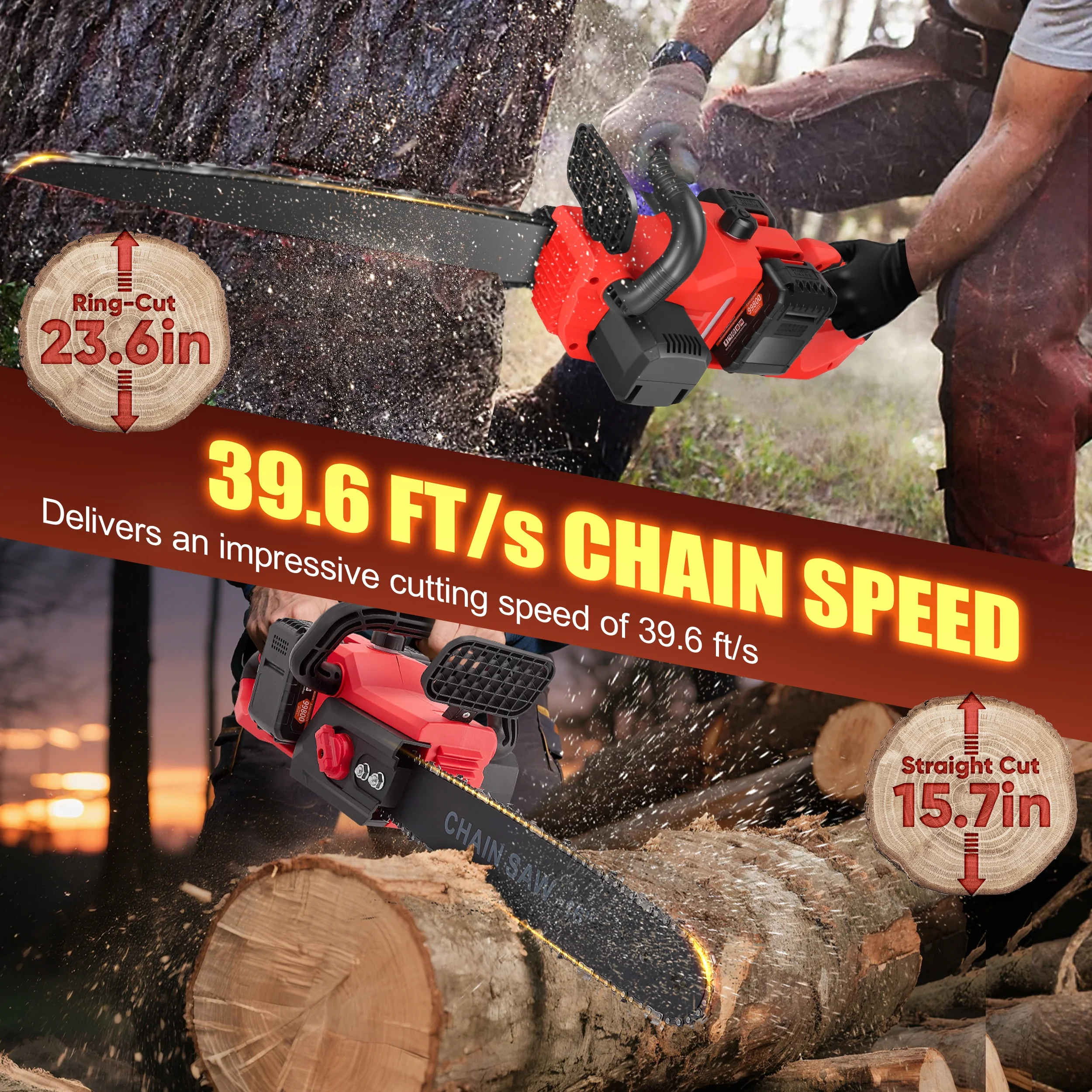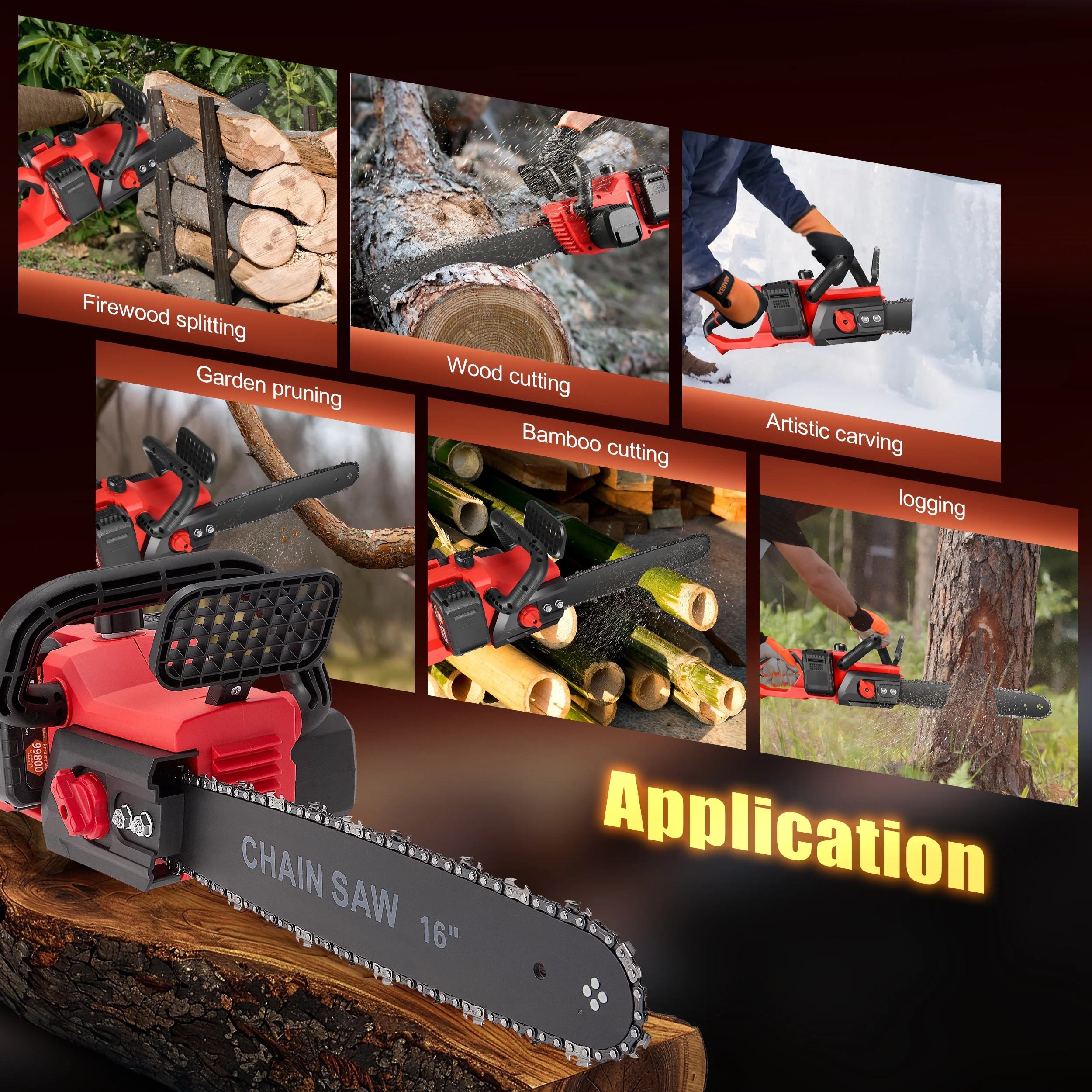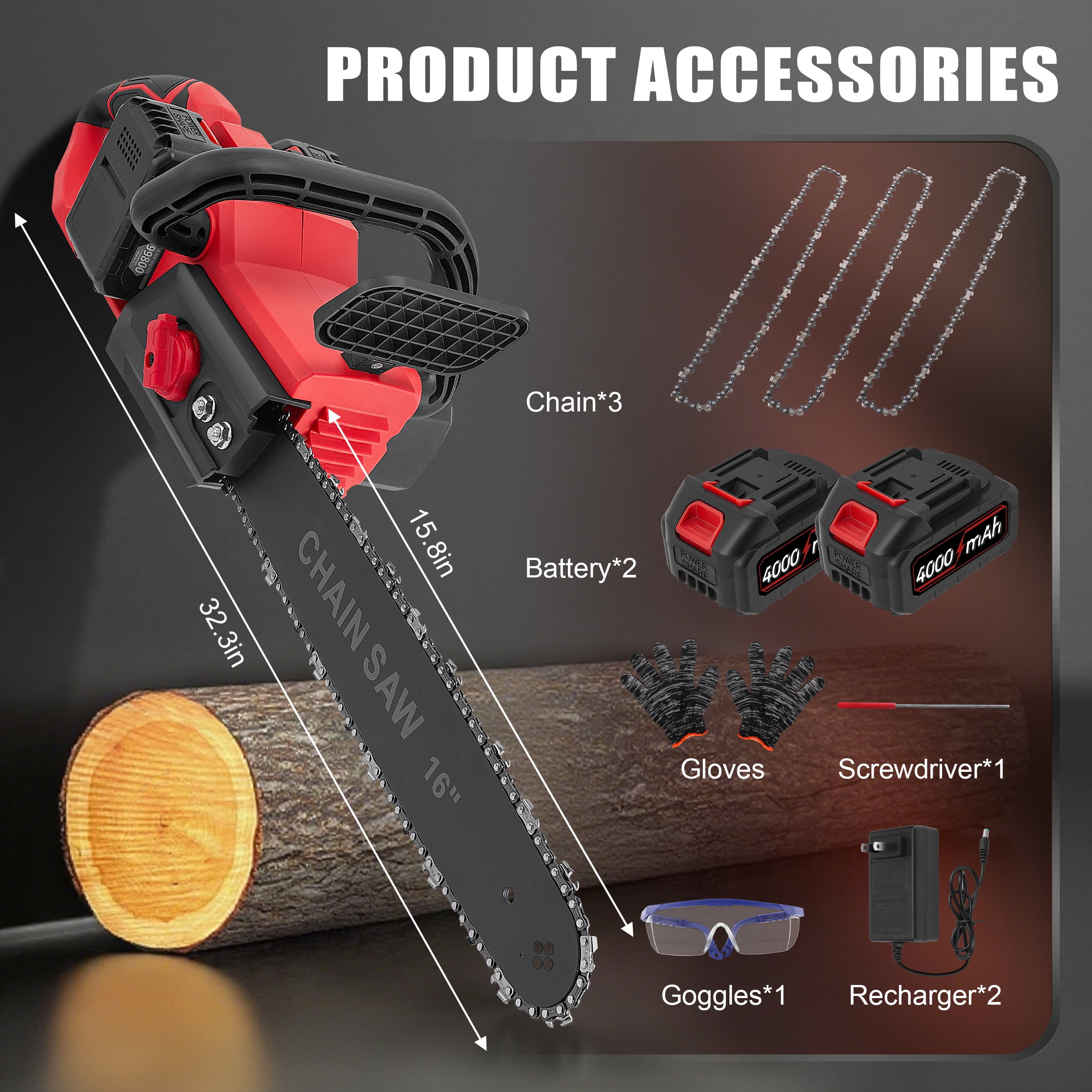 ▶ KEY FEATURES: ????【Extended Runtime and Efficiency】 The RELOIVE 16-inch chainsaw is powered by 4000mAh batteries, providing an impressive operational span of 60-90 minutes on a single charge. This extended runtime significantly reduces the need for frequent battery swaps, enhancing productivity. With a recharge time of only 2-3 hours, downtime is minimized, keeping you on track with your projects. ????【Superior Cutting Capability】 Boasting a high chain speed of 32.8 feet per second and a 1200W motor, the RELOIVE chainsaw effortlessly cuts through diameters up to 23.6 inches in just 15 seconds. The capability to make encircling cuts on trunks between 19.7 to 23.6 inches demonstrates its exceptional power and efficiency, making it suitable for a wide range of cutting tasks from bamboo to thick tree trunks. ????【Advanced Motor Technology】 Equipped with a brushless motor, the RELOIVE chainsaw ensures enhanced efficiency, reduced maintenance, and an extended lifespan. The elimination of brushes decreases mechanical wear and heat production, leading to reliable performance across diverse cutting activities. ????【Unparalleled Safety Features】 Prioritizing user safety, the chainsaw features a dual safety switch design, including a safety lock and a startup switch. This innovative approach significantly lowers the risk of accidental starts, ensuring a safer operating environment. ????【Convenient Automatic Oiling】 The automatic oiler, with a 30ml capacity, guarantees optimal chain lubrication for peak performance and longevity. An easy-to-use tension adjustment knob allows for quick chain adjustments, simplifying maintenance and enhancing tool effectiveness. ????【Cordless Convenience】 Being cordless, the RELOIVE chainsaw offers unparalleled freedom and flexibility, allowing you to work in areas without direct access to power. This portability ensures that you can tackle tasks anywhere, from the backyard to remote locations. ????【Comprehensive Accessory Kit】 This chainsaw comes with a generous accessory kit, including three sharp chains for continuous cutting efficiency, a pair of gloves, two battery chargers, a chain sharpener, a screwdriver, and protective goggles. This wide range of accessories meets all your cutting needs, ensuring you’re fully equipped for any task. ????【Versatile for Multiple Scenarios】 The RELOIVE 16″ chainsaw’s versatility makes it an indispensable tool for various cutting scenarios, excelling in tasks ranging from landscaping and construction to home DIY projects. Its ability to seamlessly cut through different materials like bamboo and tree trunks underscores its adaptability. ▶ ????SPECIFICATIONS: Brand: RELOIVE Color: black+Red Battery capacity: 2*4000 mAh Voltage: 42V Speed: 28500 RPM Power: 1300W Chain speed: 35.6 ft/s Maximum cutting diameter: 23.6 inches Working time: 60-90 minutes Charging time: 2-3 hours Saw length: 32.3 inches ▶????Package Include: 1x 16-inch electric saw 3x chain 2x batteries 1x screwdriver 2x charger 1x gloves 1x protective glasses 1x instruction