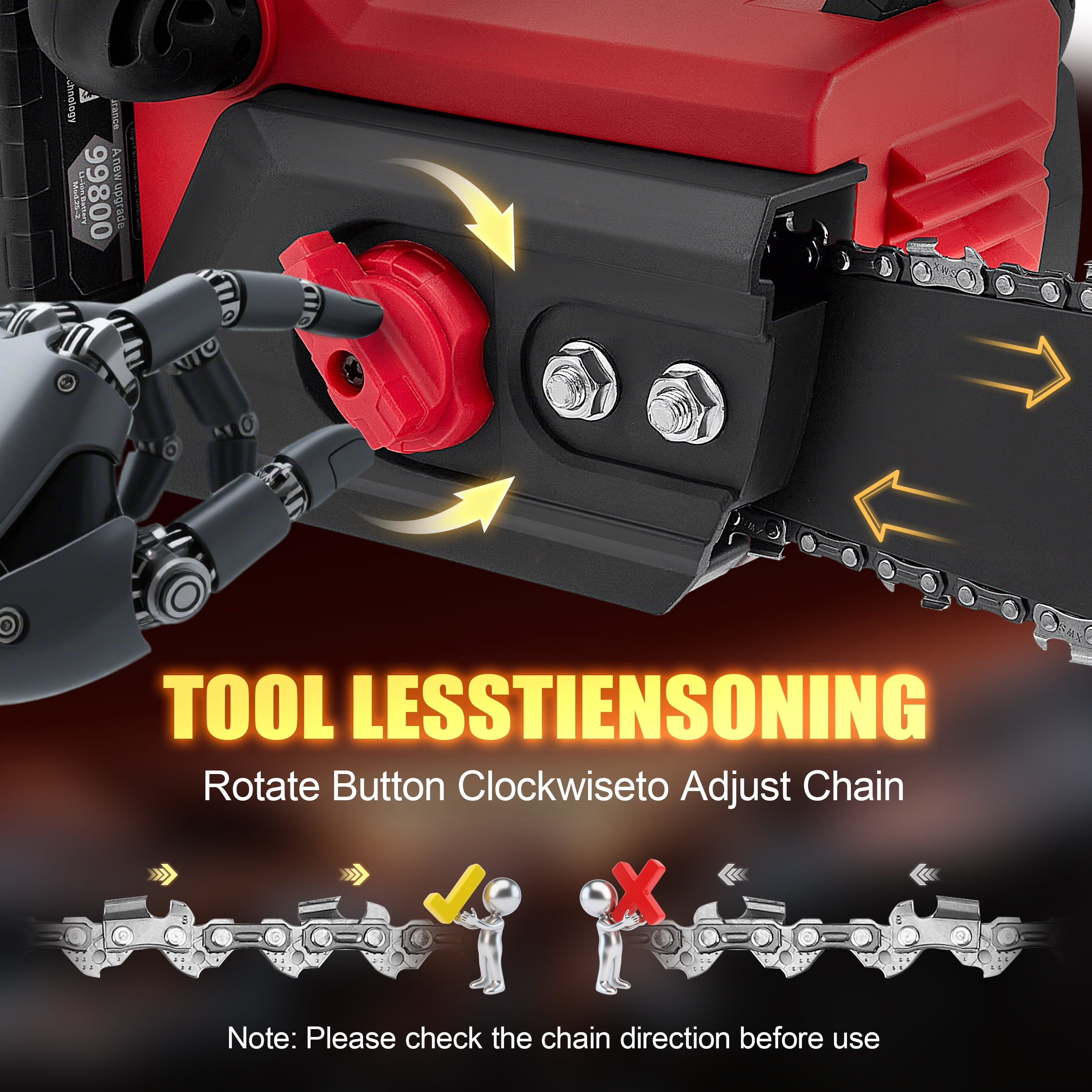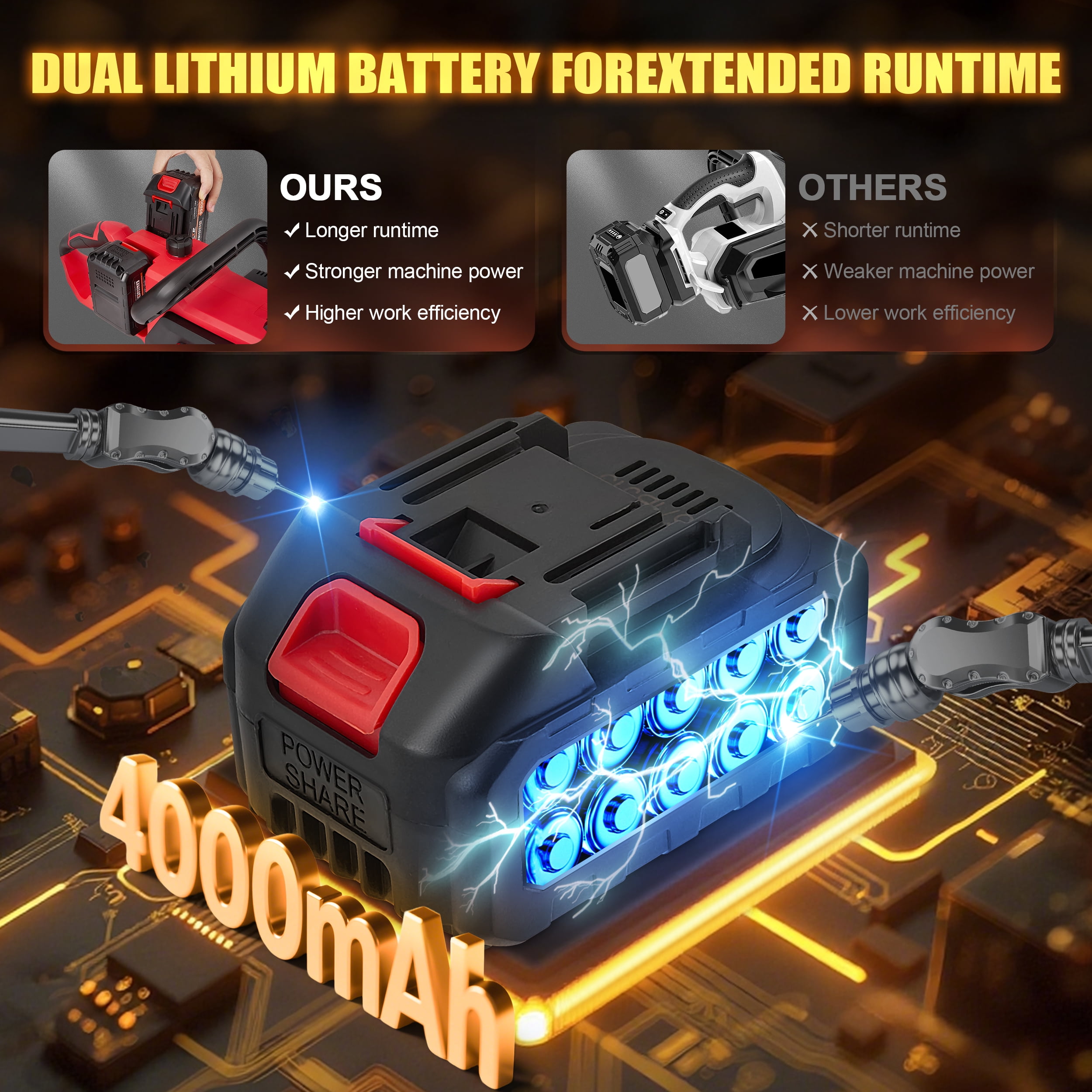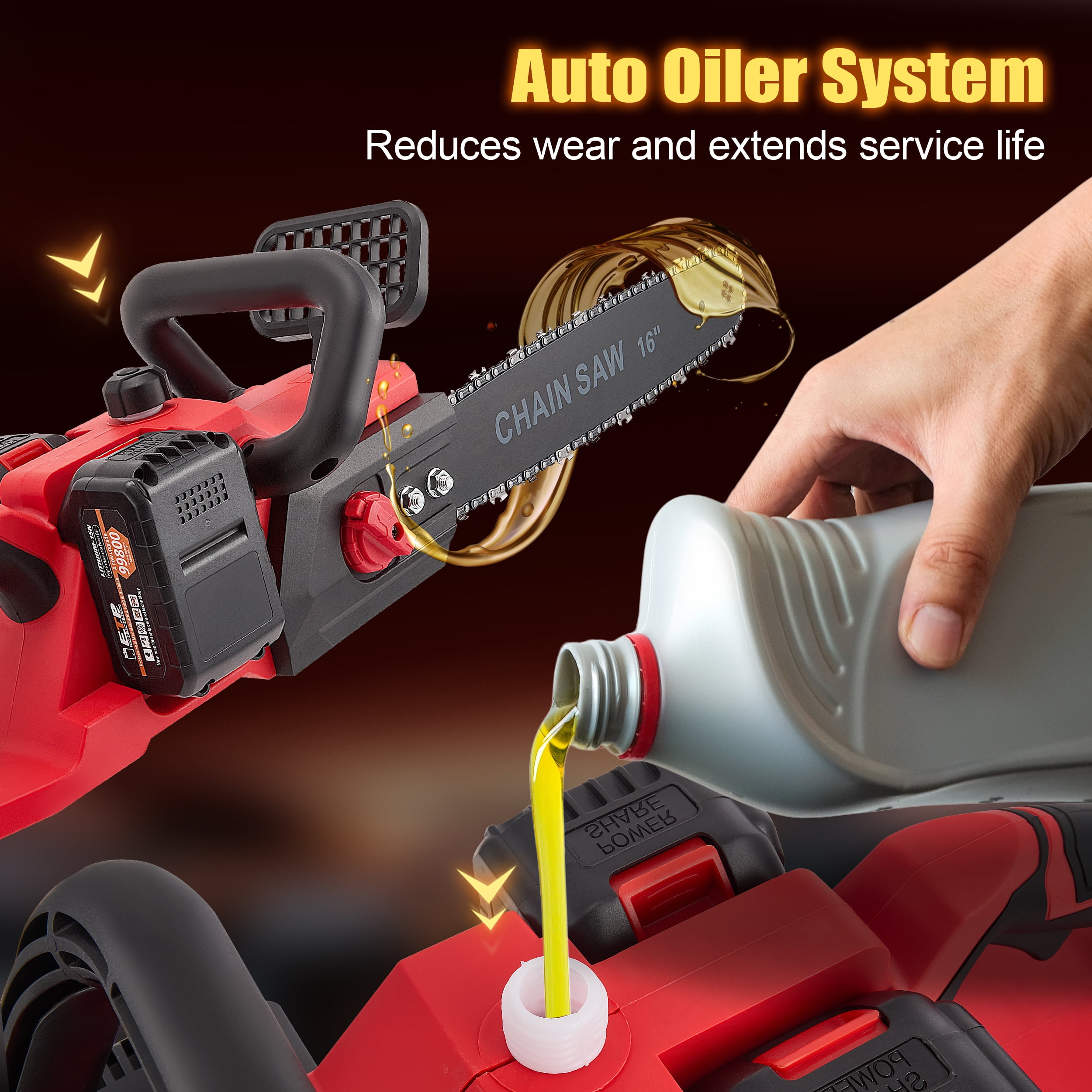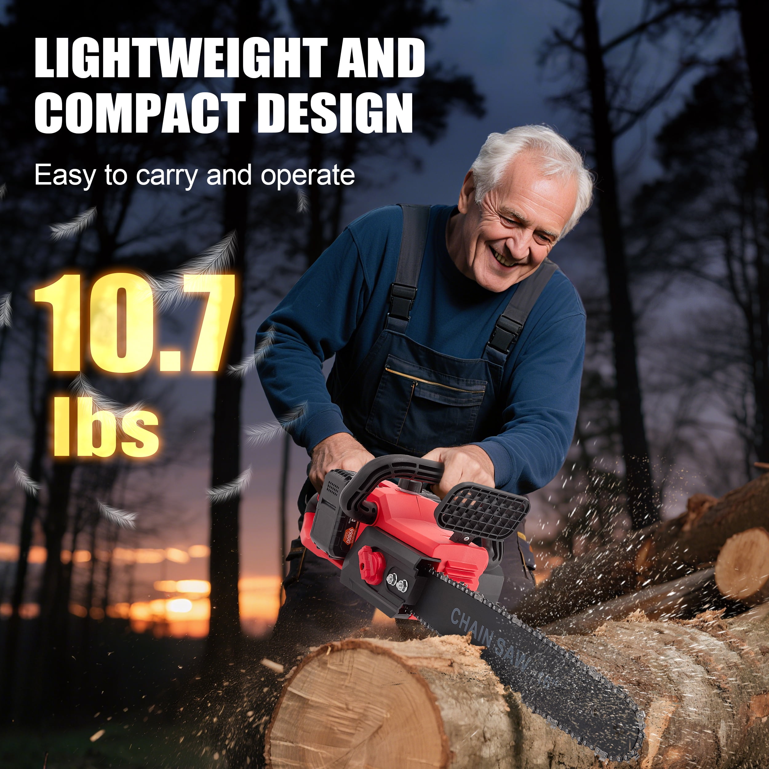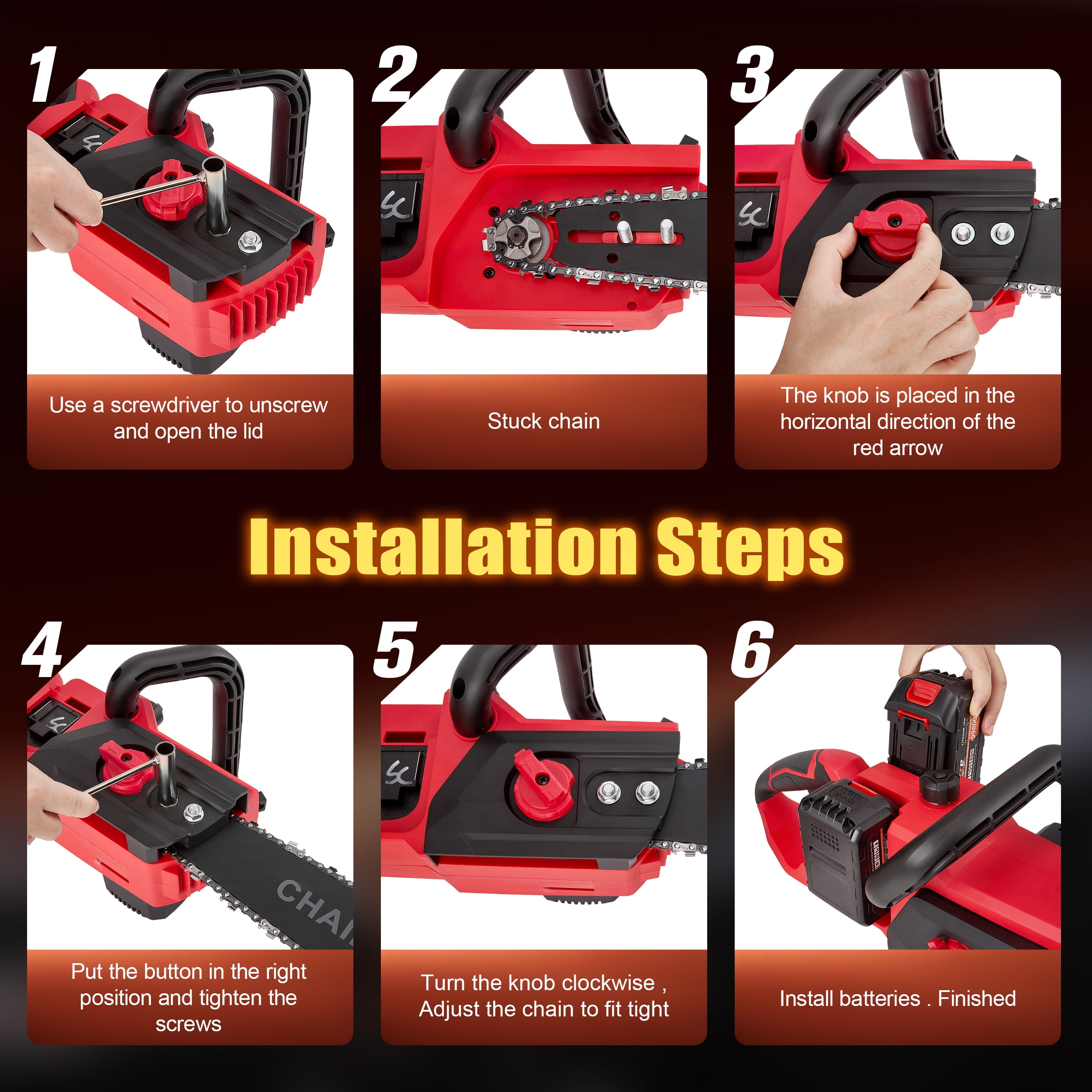 ▶ KEY FEATURES: ????【Extended Runtime and Efficiency】 The RELOIVE 16-inch chainsaw is powered by 4000mAh batteries, providing an impressive operational span of 60-90 minutes on a single charge. This extended runtime significantly reduces the need for frequent battery swaps, enhancing productivity. With a recharge time of only 2-3 hours, downtime is minimized, keeping you on track with your projects. ????【Superior Cutting Capability】 Boasting a high chain speed of 32.8 feet per second and a 1200W motor, the RELOIVE chainsaw effortlessly cuts through diameters up to 23.6 inches in just 15 seconds. The capability to make encircling cuts on trunks between 19.7 to 23.6 inches demonstrates its exceptional power and efficiency, making it suitable for a wide range of cutting tasks from bamboo to thick tree trunks. ????【Advanced Motor Technology】 Equipped with a brushless motor, the RELOIVE chainsaw ensures enhanced efficiency, reduced maintenance, and an extended lifespan. The elimination of brushes decreases mechanical wear and heat production, leading to reliable performance across diverse cutting activities. ????【Unparalleled Safety Features】 Prioritizing user safety, the chainsaw features a dual safety switch design, including a safety lock and a startup switch. This innovative approach significantly lowers the risk of accidental starts, ensuring a safer operating environment. ????【Convenient Automatic Oiling】 The automatic oiler, with a 30ml capacity, guarantees optimal chain lubrication for peak performance and longevity. An easy-to-use tension adjustment knob allows for quick chain adjustments, simplifying maintenance and enhancing tool effectiveness. ????【Cordless Convenience】 Being cordless, the RELOIVE chainsaw offers unparalleled freedom and flexibility, allowing you to work in areas without direct access to power. This portability ensures that you can tackle tasks anywhere, from the backyard to remote locations. ????【Comprehensive Accessory Kit】 This chainsaw comes with a generous accessory kit, including three sharp chains for continuous cutting efficiency, a pair of gloves, two battery chargers, a chain sharpener, a screwdriver, and protective goggles. This wide range of accessories meets all your cutting needs, ensuring you’re fully equipped for any task. ????【Versatile for Multiple Scenarios】 The RELOIVE 16″ chainsaw’s versatility makes it an indispensable tool for various cutting scenarios, excelling in tasks ranging from landscaping and construction to home DIY projects. Its ability to seamlessly cut through different materials like bamboo and tree trunks underscores its adaptability. ▶ ????SPECIFICATIONS: Brand: RELOIVE Color: black+Red Battery capacity: 2*4000 mAh Voltage: 42V Speed: 28500 RPM Power: 1300W Chain speed: 35.6 ft/s Maximum cutting diameter: 23.6 inches Working time: 60-90 minutes Charging time: 2-3 hours Saw length: 32.3 inches ▶????Package Include: 1x 16-inch electric saw 3x chain 2x batteries 1x screwdriver 2x charger 1x gloves 1x protective glasses 1x instruction