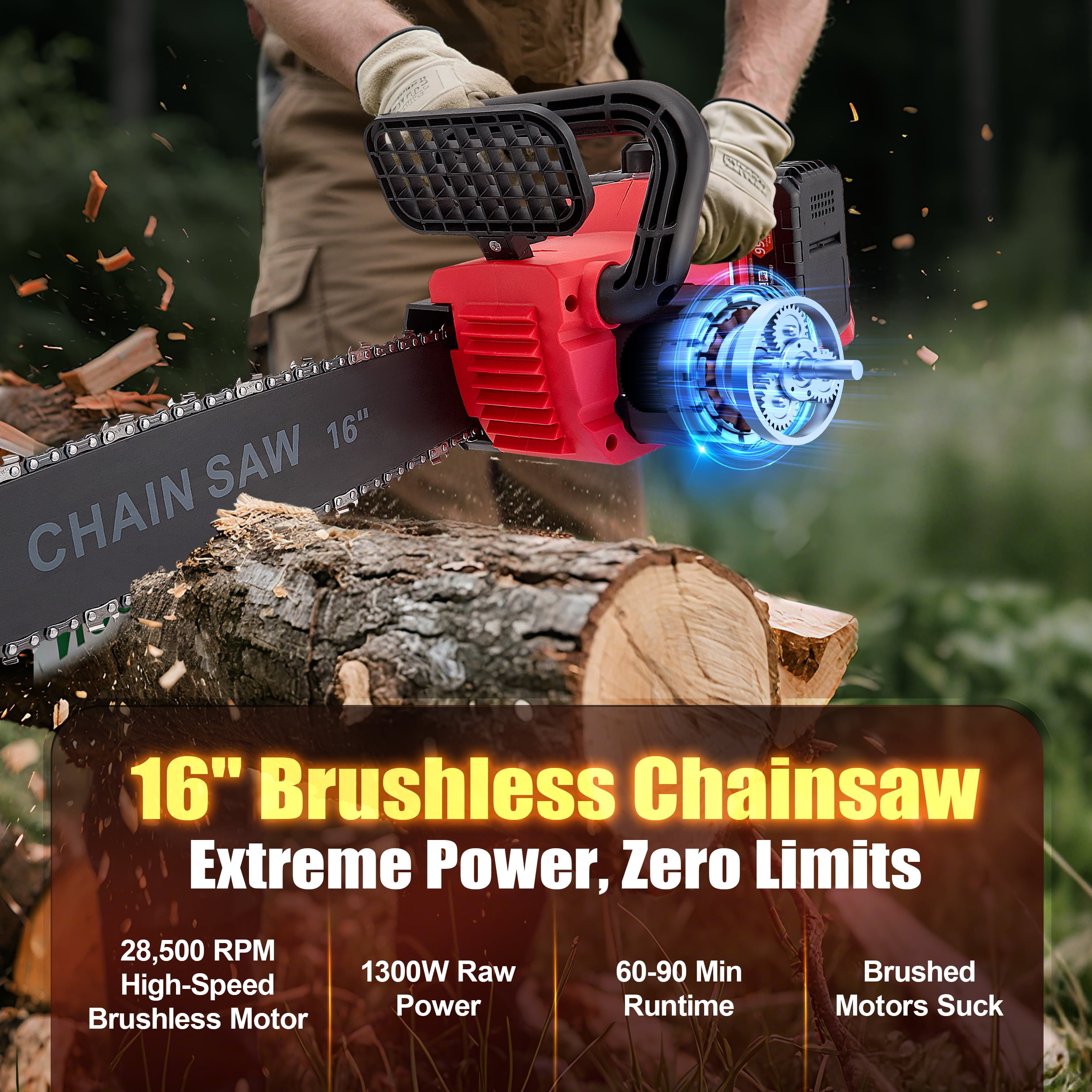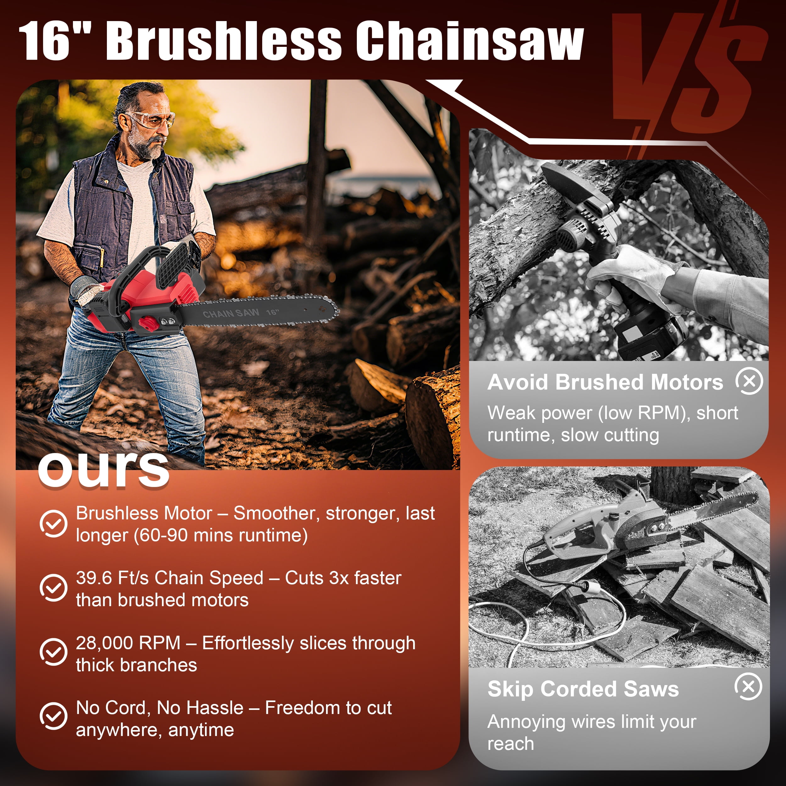 RELOIVE 16″ Brushless Cordless Chainsaw, 42V 4000mAh with 3 Chains & Dual Chargers for Heavy-Duty Tree Cutting