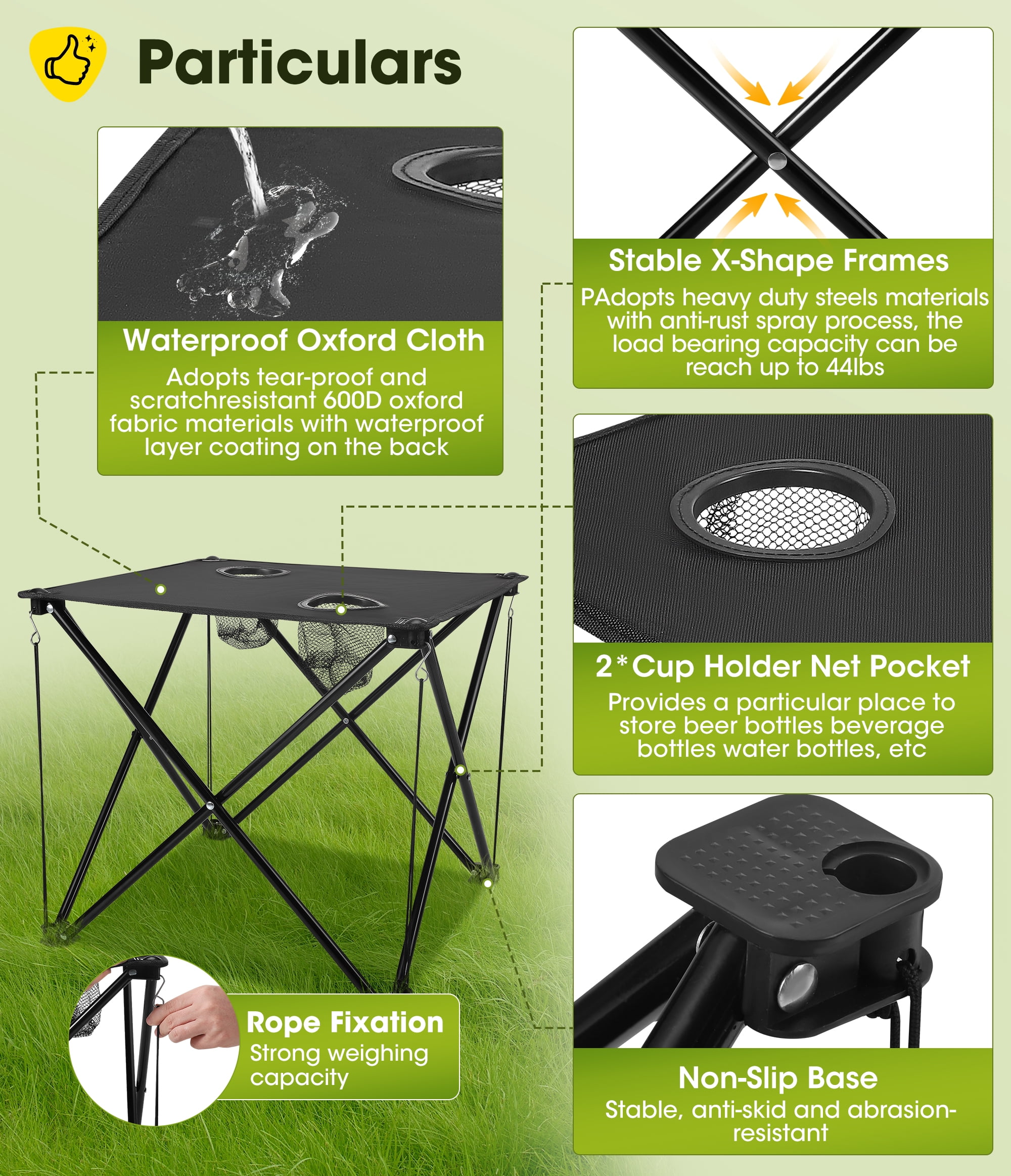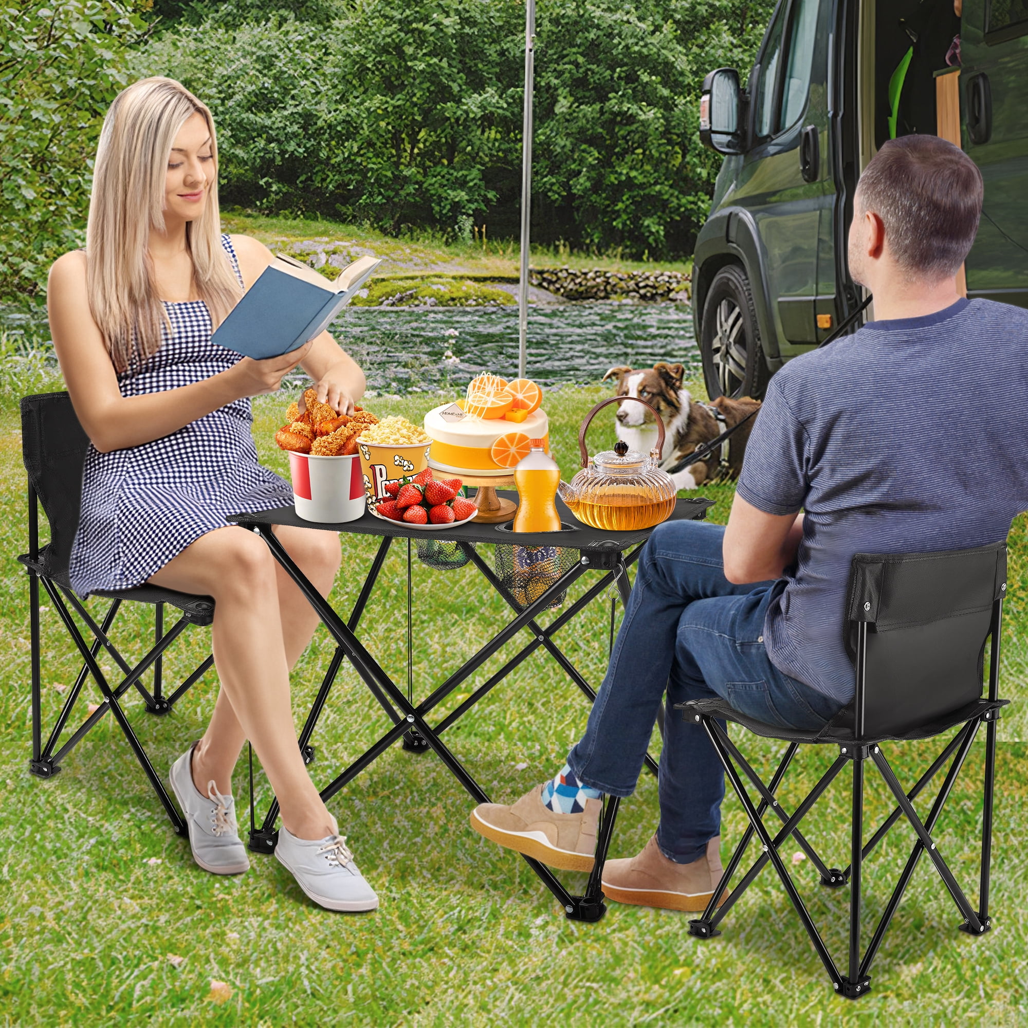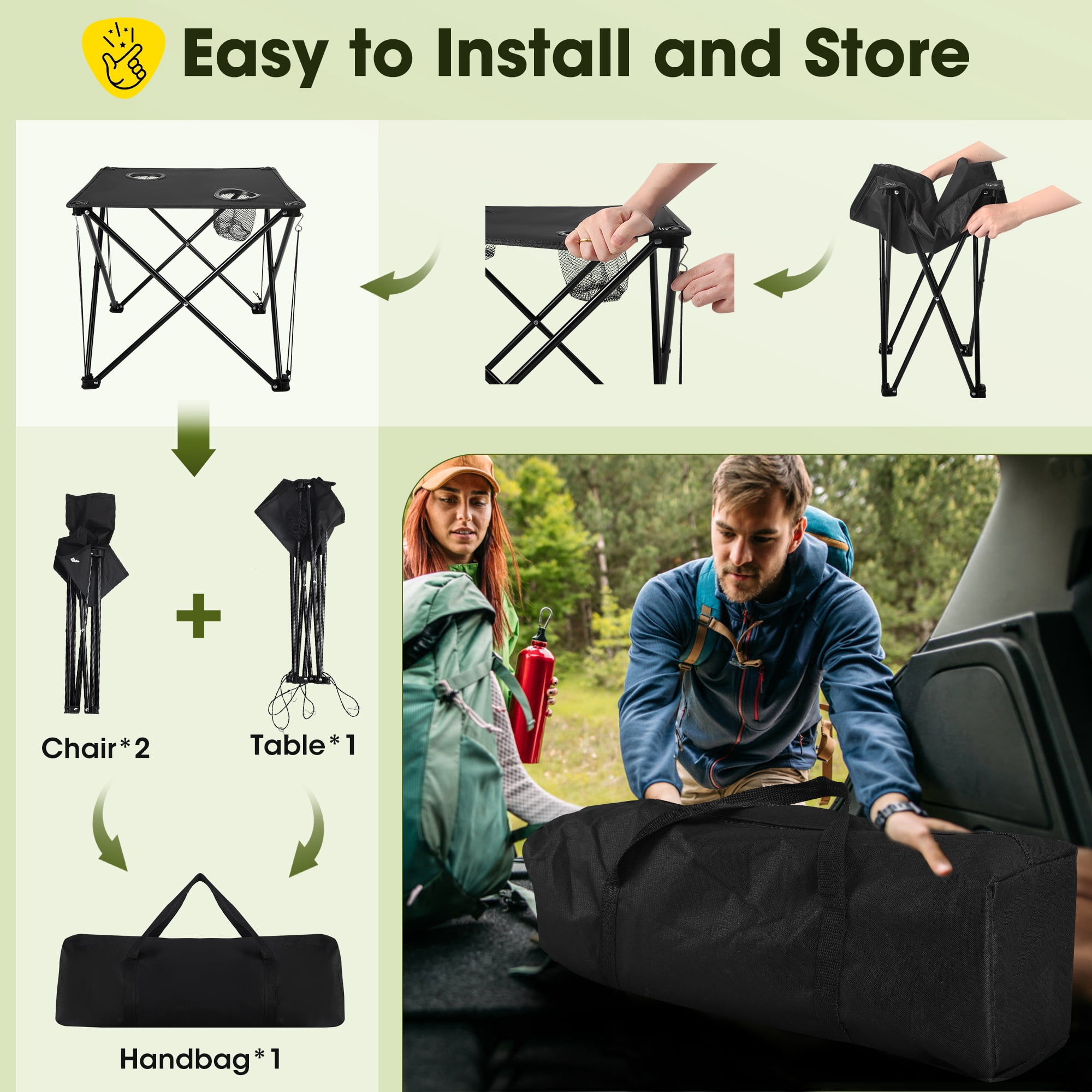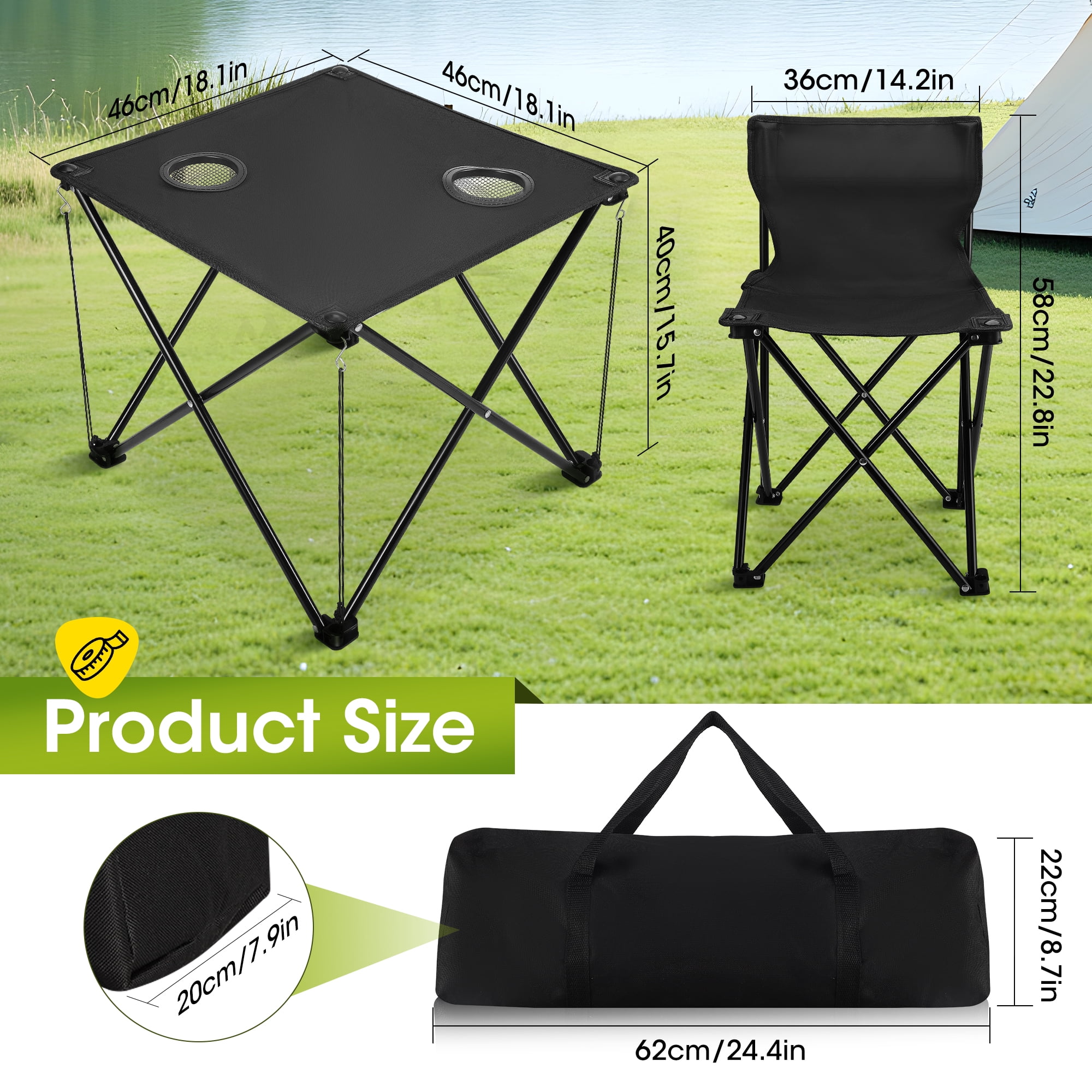 ▶ KEY FEATURES: ????????【Ultimate Camping Set】 Catering to the desires of outdoor enthusiasts, this comprehensive set includes two sleek black camping chairs and a versatile foldable table, all neatly packed in a convenient storage bag for effortless transportation and compact storage. Ideal for an array of outdoor activities, from barbecue gatherings and hiking adventures to RV excursions, lakeside retreats, and seaside escapades. ????????【Superior Build Quality】 Our portable camping chairs are crafted from durable 600D Oxford fabric, reinforced with precise double seam stitching for enhanced longevity. Supported by a robust 16mm thick steel pipe frame capable of supporting up to 99 pounds, and equipped with four anti-slip feet for unparalleled stability and security. ????????【Ergonomically Designed Chairs】 The set features two black portable outdoor chairs, each boasting a sturdy tubular steel frame and 600D Oxford fabric construction for ultimate durability and comfort. The chairs unfold to dimensions of 14.2 inches x 14.2 inches x 22.8 inches (L x W x H), providing ample space for adults to comfortably sit and relax for long durations. Designed with the user in mind, these chairs offer added convenience for your leisure time. With a compact folded length of 23 inches and a lightweight design at 2.55 pounds, these chairs, along with the included storage bag, ensure maximum portability for all your outdoor ventures. ????????【Streamlined Camping Table】 The folding picnic table, measuring 18″ x 18″ x 16.5″, features a 13mm thick steel pipe frame that can support up to 33 pounds. Its compact design allows for easy placement in a trunk, on a roof rack, or attached to a backpack. The table is stabilized by PE feet connected to four elastic ropes, ensuring a flat and secure surface perfect for holding a fruit bowl, snacks, and bottles. ????????【Portability Redefined】 The RELOIVE foldable chairs and table set is designed for instant setup without any assembly required, allowing you to establish your relaxation spot in seconds. Each chair weighs a mere 2.55LBS, and the table is even lighter at 2.09LBS, making your journey significantly less cumbersome. All items come with a travel-friendly drawstring bag with a shoulder strap, enabling you to bring them along with ease and find comfort wherever you choose. ▶ ????SPECIFICATIONS: Brand: RELOIVE Material: Oxford cloth Color: Black; Chair unfolded size: 14.2″ x 14.2″ x 22.8″ Table unfolded size: 18″ x 18″ x 16.5″; Individual table weight: 2.09 pounds; Individual chair weight: 2.55 pounds; ▶ ????Package Include: 2x Chairs 1x Table 1x Tote Bag