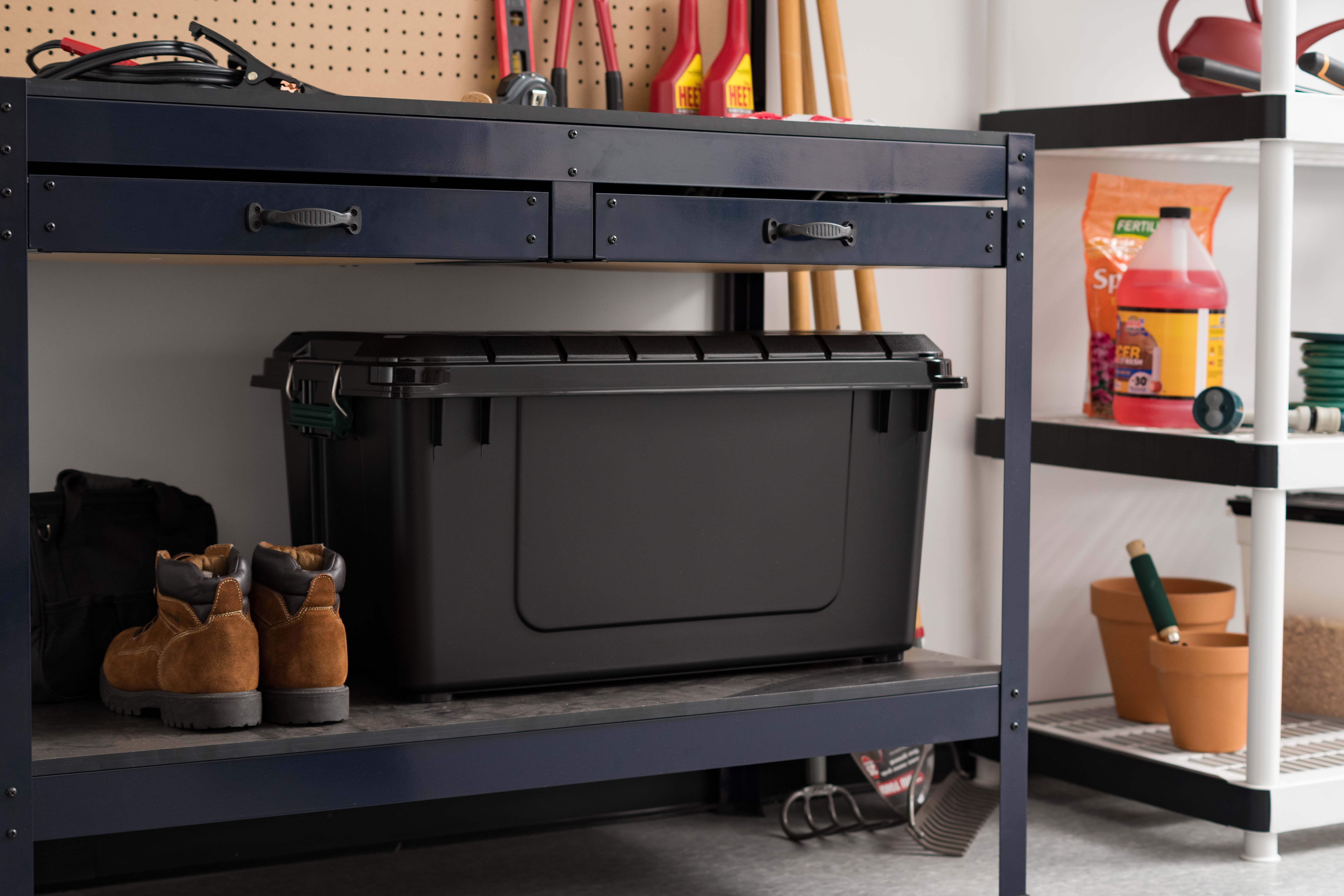 Multiple Sizes: Available in 19 Gal, 22 Gal, and 42 Gal capacities to suit various storage needs. Heavy Duty Construction: Durable plastic construction for robust performance in tough environments. Lockable Lid Design: Provides added security to protect contents from dust, dirt, and moisture. Secure Latching System: Ensures the lid stays securely closed, even when stacked. Ergonomic Handles: Facilitate easy lifting and carrying. Stackable Design: Maximizes storage space and organizational efficiency. Sleek Black Finish: Offers a professional appearance suitable for any space. BPA-Free Material: Safe for storing personal items and household goods, ensuring peace of mind for you and your family. Space-Efficient: The slim design of these bins allows them to fit into tight spaces, making the most of your storage areas. Durable Construction: Made from high-quality, durable plastic that withstands daily use and heavy loads.