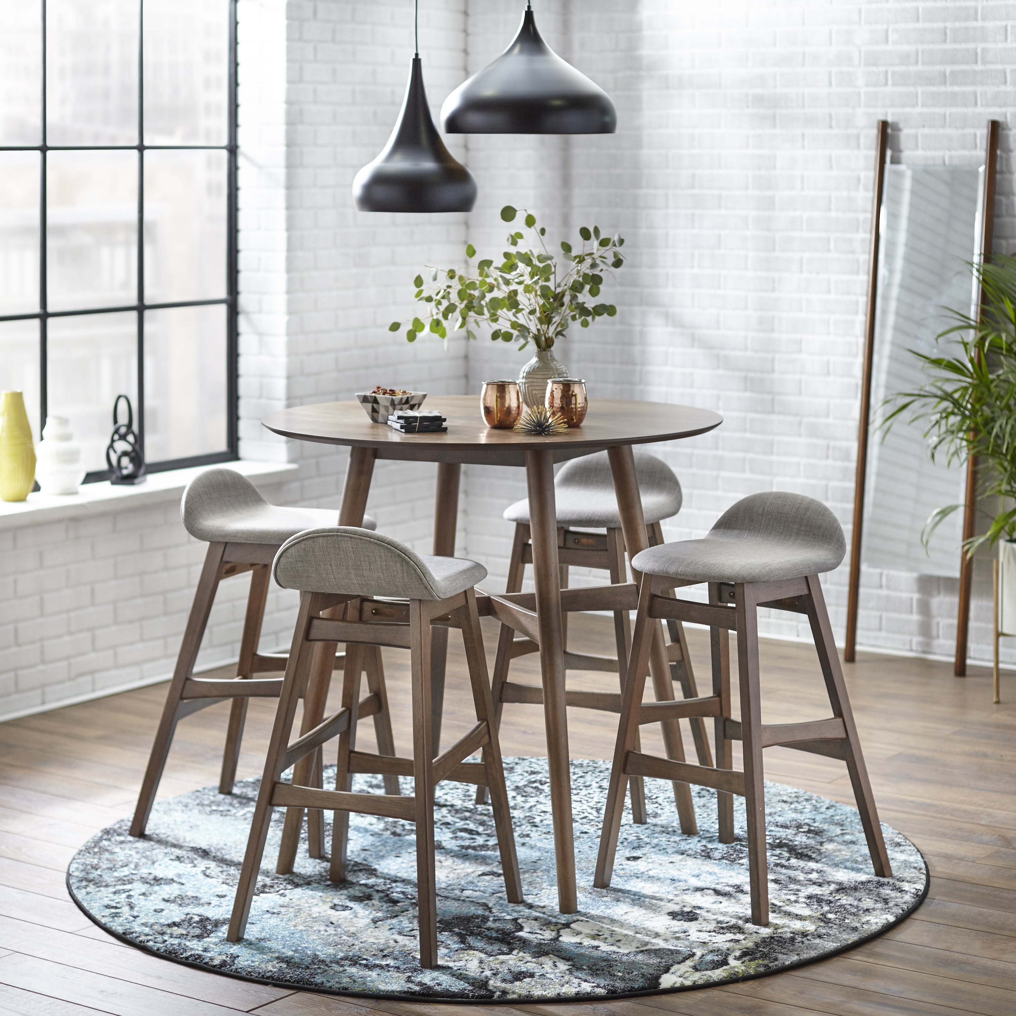 Made of rubberwood, veneer, and MDF Black faux leather or Grey Linen upholstery Mid-century modern style Walnut-finished wood Set includes 2 stools Low backrest and footrest Requires assembly Overall: 34.75 inches high x 18.5 inches wide x 20.1 inches deep Seat: 30 inches high x 15.5 inches wide x 16 inches deep Made of rubberwood, veneer, and MDFBlack faux leather or Grey Linen upholsteryMid-century modern styleWalnut-finished woodSet includes 2 stoolsLow backrest and footrestOverall: 34.75 inches high x 18.5 inches wide x 20.1 inches deepSeat: 30 inches high x 15.5 inches wide x 16 inches deepRequires assembly
