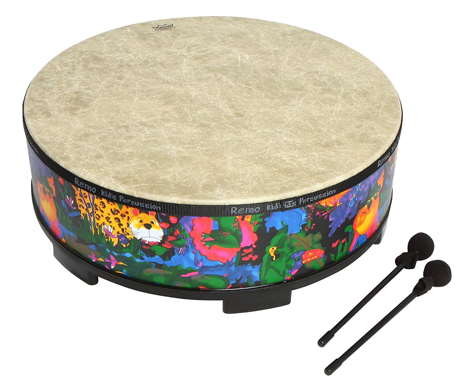 Remo’s Kids Percussion Gathering Drum produces a big, fun sound. Loosely based on ceremonial drums used in carious cultures to call villagers together, it features an Acousticon shell, a pre-tuned Skyndeep drum head, and a vibrant Rainforest finish. The Kids Percussion Gathering Drum can be played with hands, mallets or sticks. Ideal for group drumming in a classroom setting, the Kids Percussion Gathering Drum is an important part of the percussion family of rhythm instruments and playfully introduces children to the basic building block of all music, which is rhythm. Will accommodate two or more children playing at the same time.