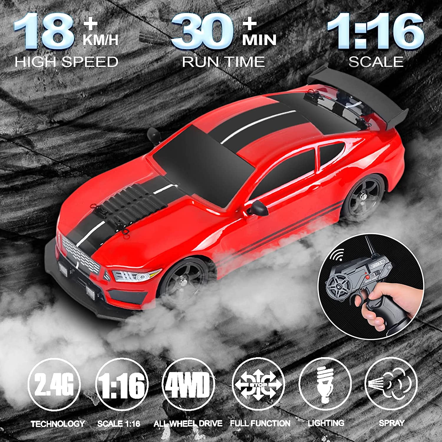 【HIGH SPEED DRIFTING CAR】1: 16 scale racing car, remote control drift car can go forward, backward, turn left and right, other full-scale synchronous control functions. The speed can reach up to 18KM/H, which provide you a faster high-speed racing experience. The front of the car has cool lights, and night driving is more attractive. 【WITH LED LIGHT & SPRAYER】This remote control car comes with a pair of LED lights and rear with spray and LED lights. When the RC car is powered up, the lights will start flashing gorgeously. Turn on the remote control handle spray button, the rear of the remote control car will show a cool and gorgeous water mist, making the remote control car more cool and exciting during driving. 【2.4GHZ REMOTE CONTROL AND MULTIPLICATION OF FUN】2.4GHz Remote Control Transmitter allows you to race against multiple cars at the same time and without interference. Enjoy real racing drift experience for kids. We provide 2*7.4V 500mAh rechargeable batteries, each battery can give you more than 30 minutes of racing fun. 【4 WHEELS DRIVE HIGH SPEED】: This RC drift car designed with 4 wheel-drive system, equipped with 4WD system and powerful motors this car has strong power and driving force. Let the remote control drift car to conquer all kinds of harsh environments or drift on road easil, it will give you you a great racing experience. 【DRIFT REMOTE CONTROL FUN】You not only play with it using the remote control, but also place it as an exhibit on display shelf. Being the ideal toy gift for kids as their hobby RC drift cars. Perfect for birthday gifts, stocking stuffers or rewards and so on. If you have any questions, please feel free to contact us, we will try our best to solve it within 24 hours.