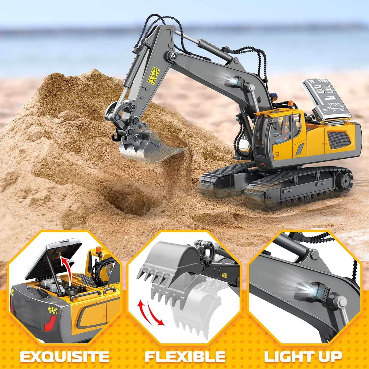Remote Control Excavator Toys,11 Channel Rechargeable RC Construction Excavators Digger Vehicles Engineering Toys with Metal Shovel for Age 3 4 5 6 7 8 9 10+ Year Old Kids